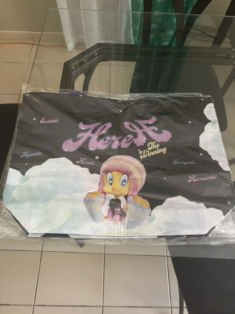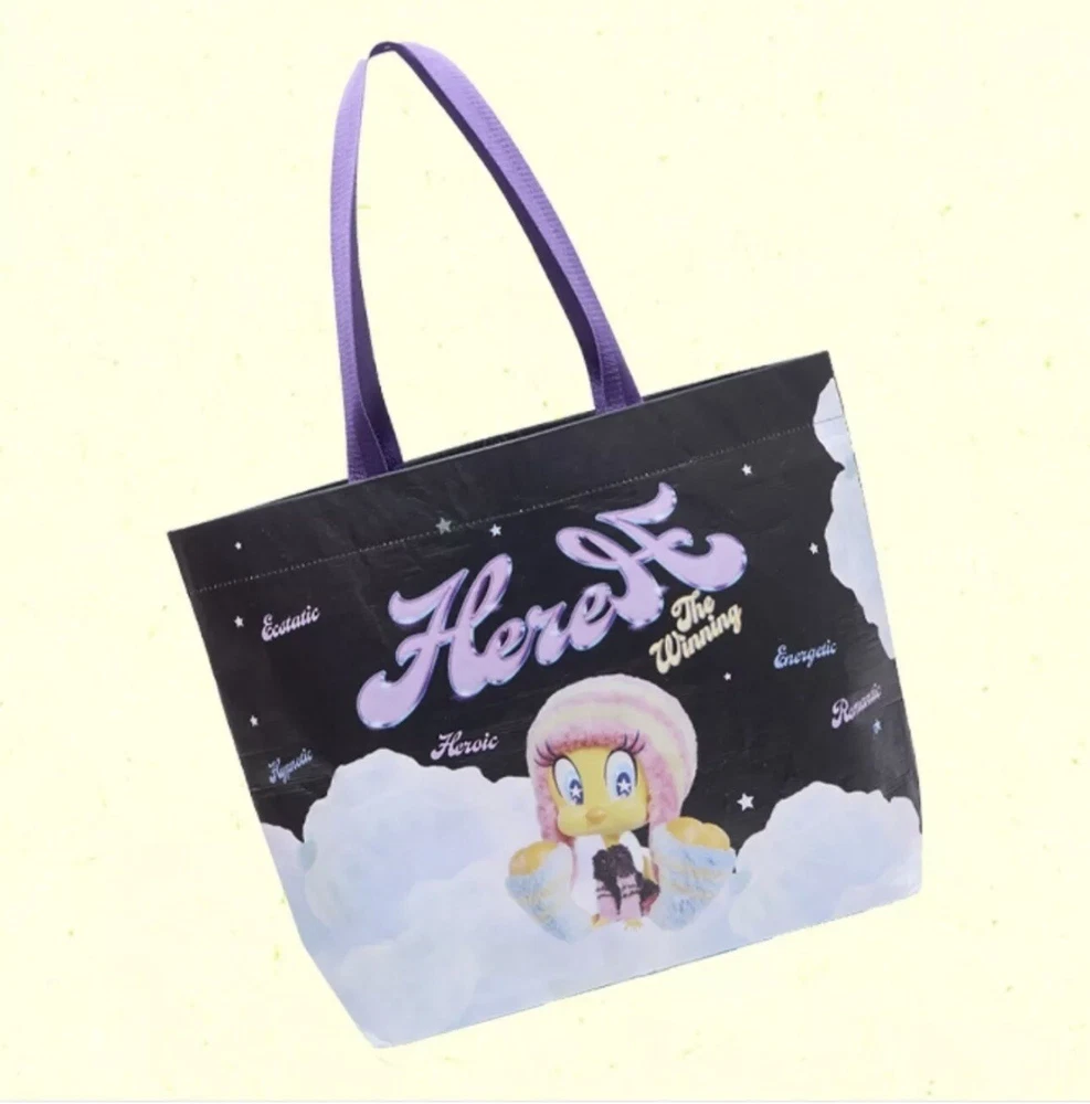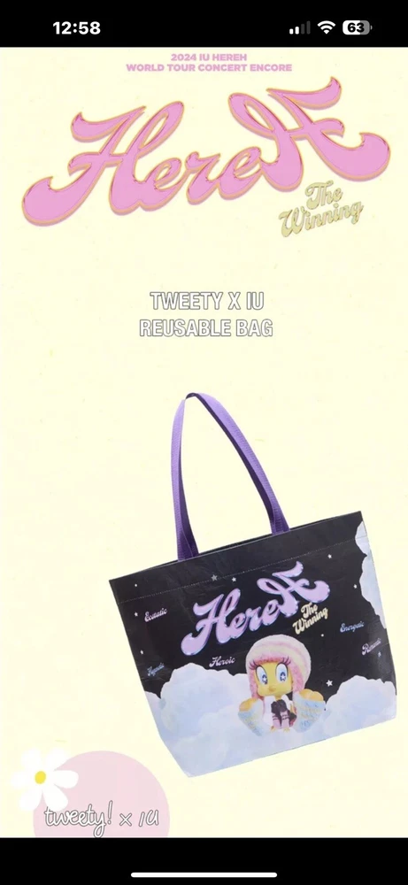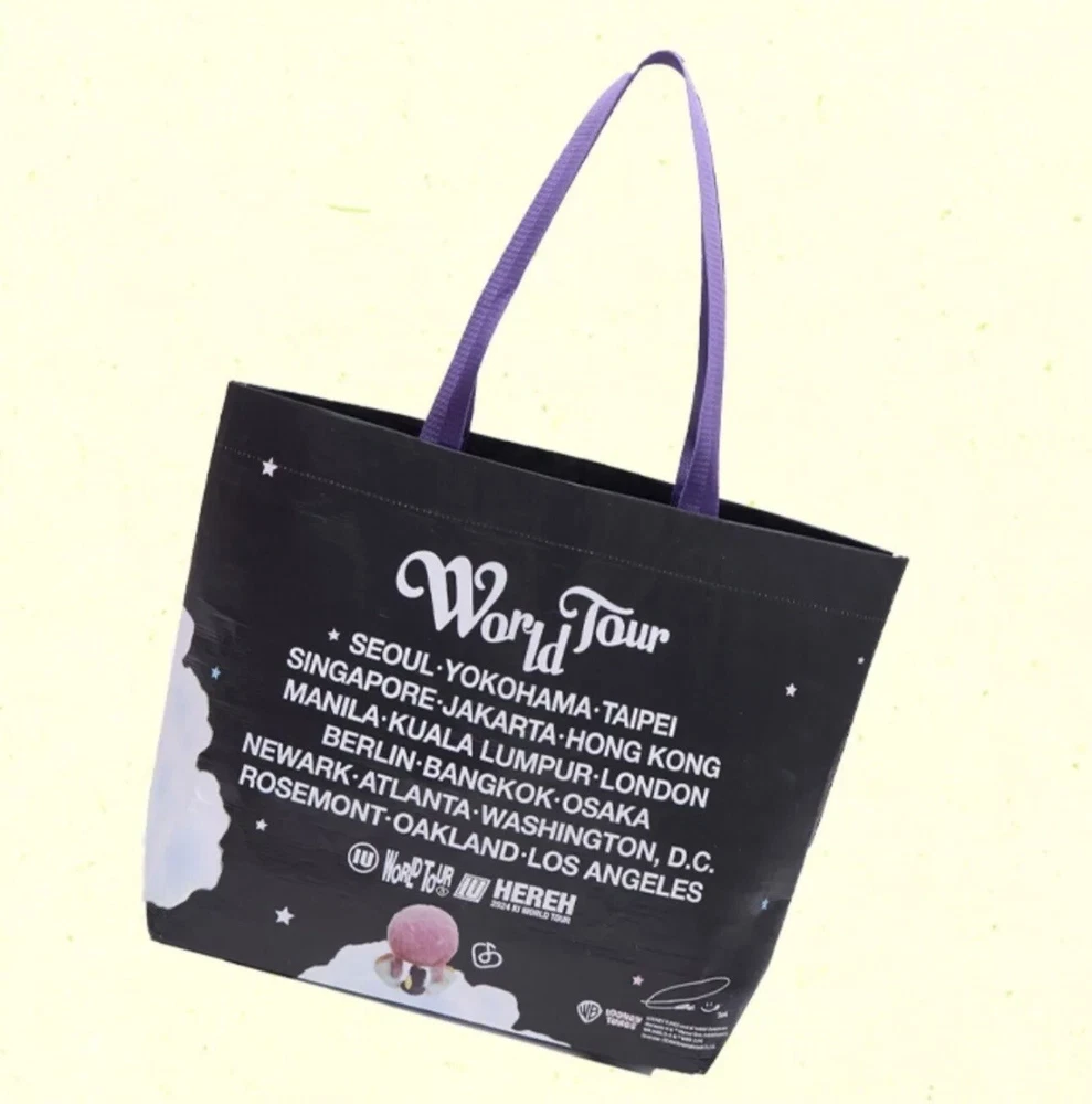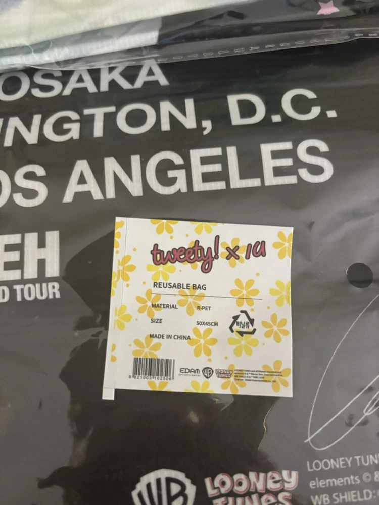 The product is for a SEALED, Brand New IU Reusable Bag from THE WINNING - HEREH Encore Concert OFFICIAL MD collection, featuring a collaboration with Tweety. The bag is designed as official merchandise for IU's concert, making it a special item for fans of the K-pop artist. With a focus on music memorabilia, this product allows fans to show their support for IU while also promoting sustainability through the use of a reusable bag. All proceeds from this sale will benefit my daughter’s trip to South Korea this year, so I really appreciate your consideration in this listing. Thank you for your interest. See my other items including autographed albums and memorabilia from this and other artists. mnv_love