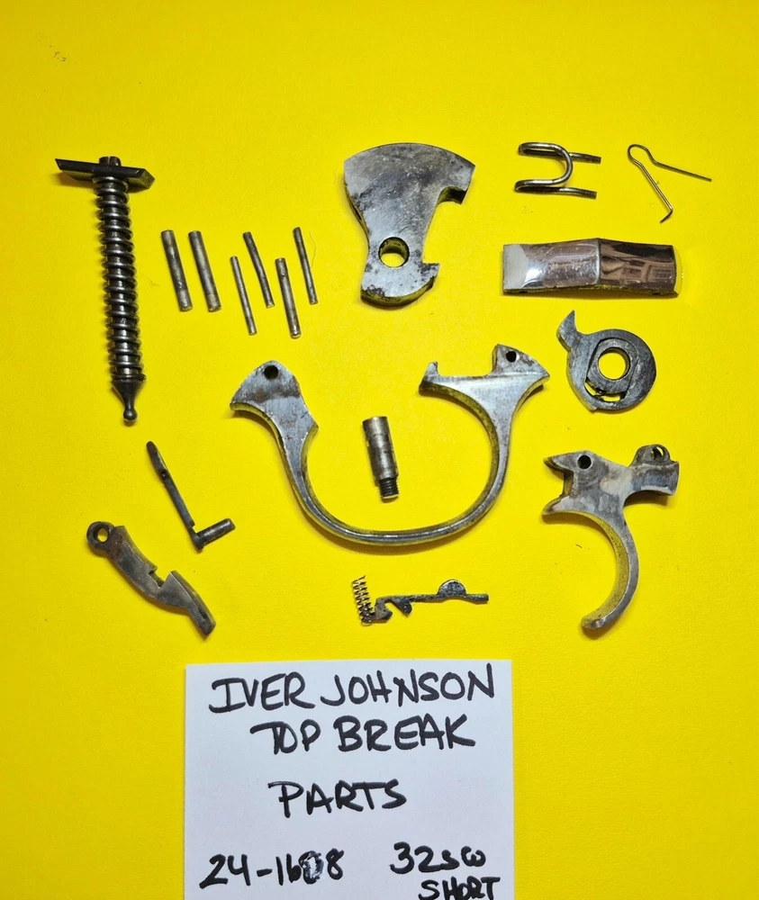 IVER JOHNSON TOP BREAK .32 SW SHORT LOT OF INTERNAL PARTS TRIGGER GUARD, TOP COVER, EXTRACTOR CAM, CYLINDER STOP, HAMMER, , HAMMER SCREW, HAND, TRIGGER, LIFTER, MAINSPRING ASSEMBLY, PINS & SCREWS ITEM # 24-1608