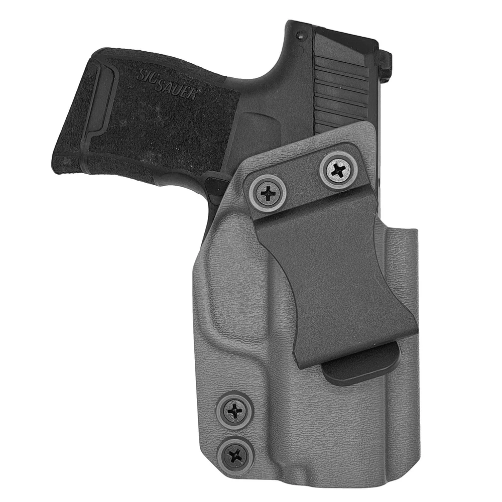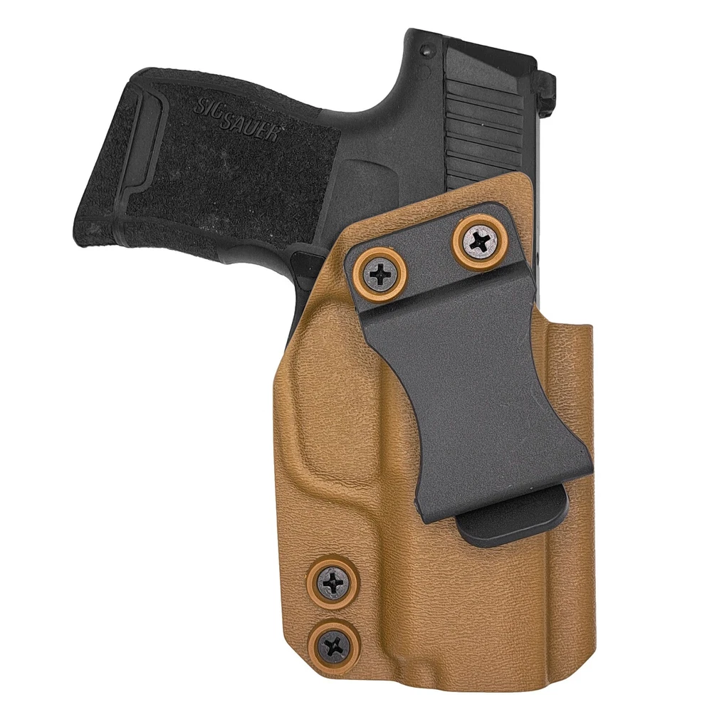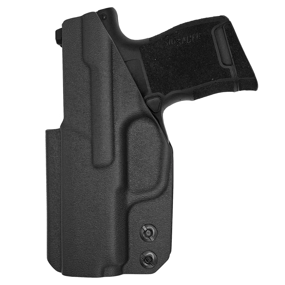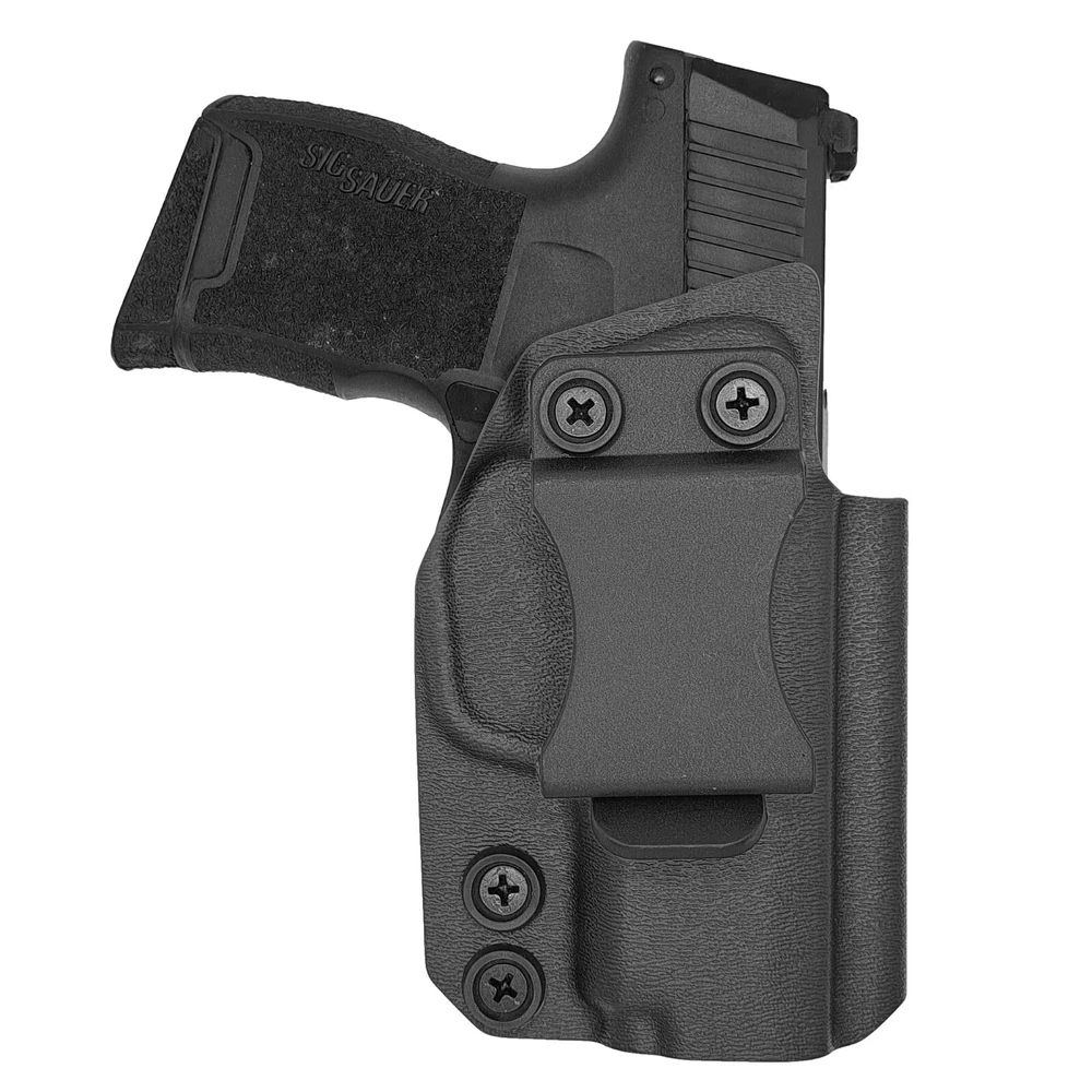 Order before 2PM Central Time ships Same Business Day! Monday - Friday. Our Sig Sauer P365-380 Inside the Waistband (IWB) holsters are designed to be lightweight and concealable to wear for everyday carry. All holsters come standard with Adjustable Cant 0 -20 Degree. A full sweat shield to help shield the firearm from perspiration and adjustable retention for a Positive “click” ensures the firearm is secure when holstered. All holsters are optic ready and can accommodate a wide variety of red dot sights, from RMRs to SROs. COMPATIBLE WITH: Sig Sauer P365-380 KEY FEATURES: FOMI Belt Clip 1.50” Optic Ready accommodates a wide variety of red dot sights, from RMRs to SROs. Adjustable Cant - 0-20 Degree. Full Sweat Shield. Adjustable Retention with Positive click. Raised sight channel. Open-ended muzzle. Rounded, Hand Finished Edges. Material – .080” Thick Kydex/Boltaron. Blackened Stainless Steel Hardware. Handcrafted & Made in Texas.