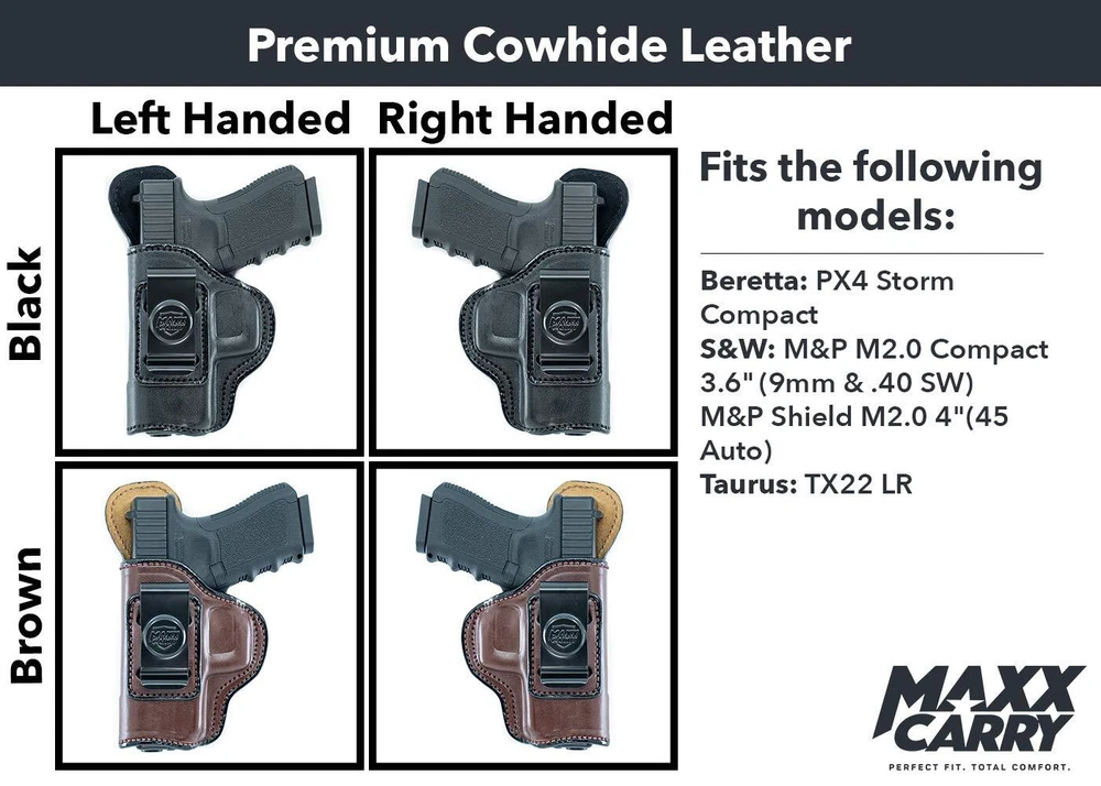 PISTOL HOLSTER WITH PERFECTED FIT for Beretta PX4 Storm Compact 9 mm / 40 ACP | S&W M&P M2.0 Compact 3.6 inch 9mm & .40 SW, M&P Shield M2.0 4 inch 45 AUTO | Taurus TX22 LR TOTAL COMFORT AND PROTECTION - Premium cowhide leather inside the waistband holster for comfortable wear with suede lined interior to protect your gun FULL LENGTH SWEAT GUARD - Leather gun holster features a high back that provides a shield between the body and the firearm EASY CLIP AND REMOVAL - Tempered steel spring clip provides easy removal of the holster and fits belt widths up to 1.75" (45 mm) EVERY DAY CONCEALED CARRY - no printing on your clothes. 100% satisfaction guarantee and limited lifetime warranty;