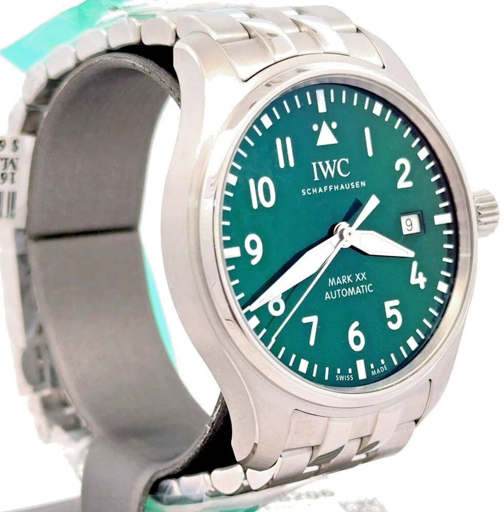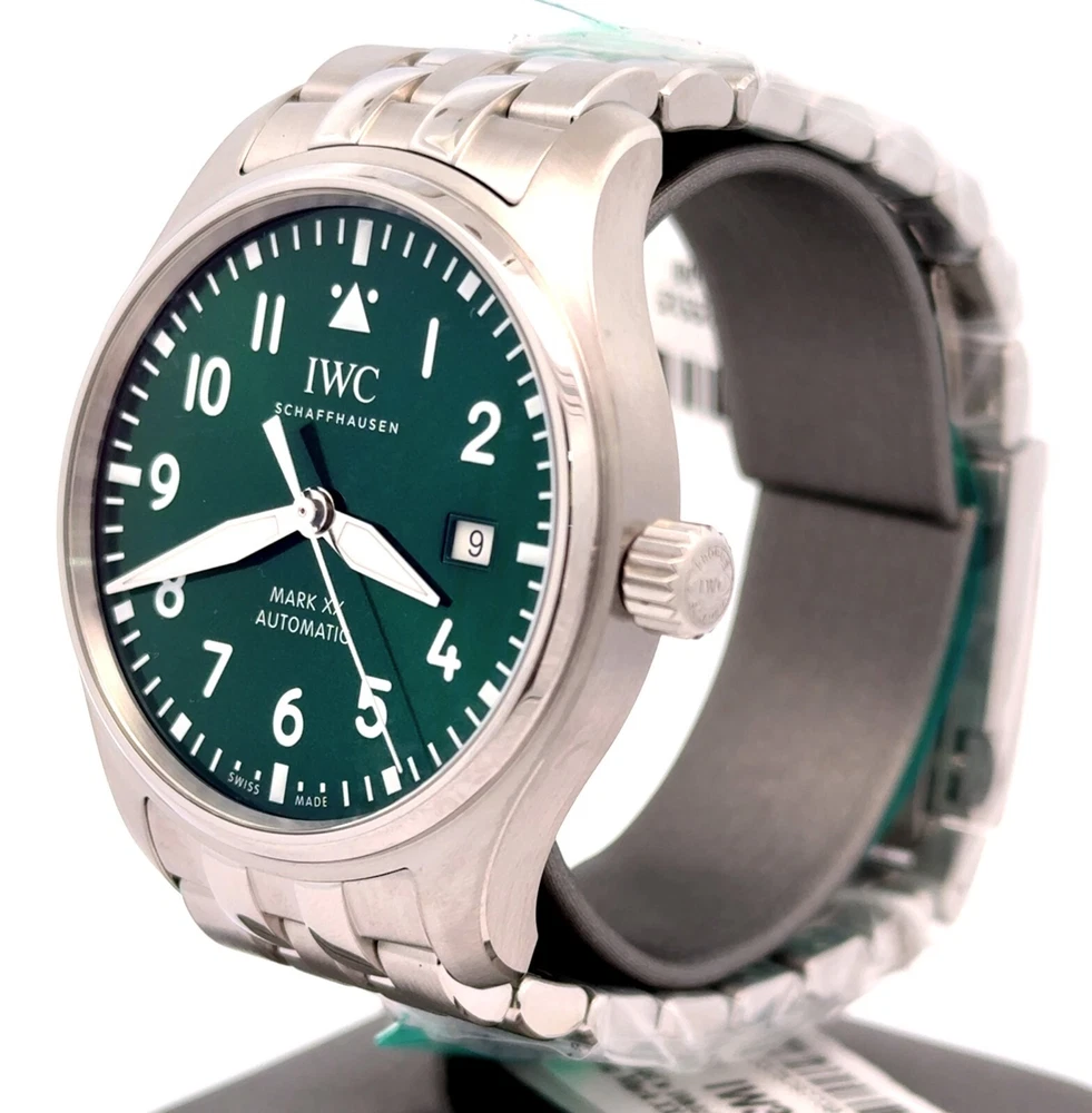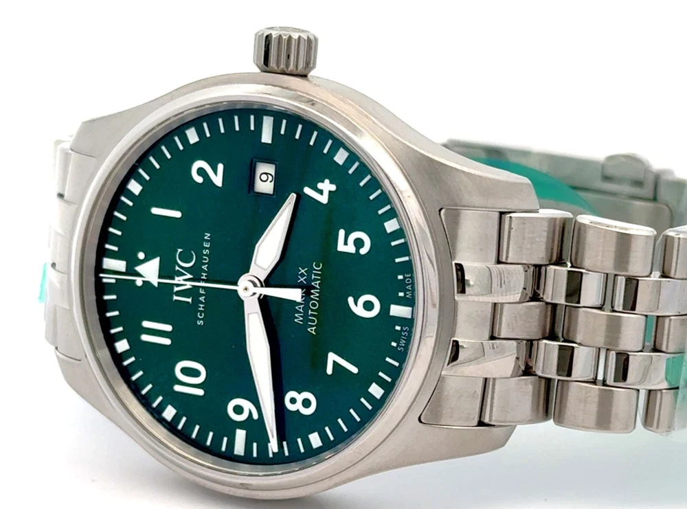 Pilot’s Watch Mark XX - Green Dial Stainless steel Case, Automatic winding, Diameter 40.0 mm, Green dial, Stainless steel bracelet with EasX-CHANGE system, Strap width 20.0 mm. BRAND NEW - 8 YEAR FACTORY WARRANTY ! Stainless steel Case Diameter 40.0 mm Height 10.8 mm Screw in crown True Water resistance 10.0 bar 32111 Calibre Movement type Automatic winding, IWC-manufactured movement Power Reserve Indicator 120 hours Frequency 28'800 VPH (4 Hz) Components 163 Jewels 21 Côtes de Genève Central hacking seconds Sapphire glass, convex, antireflective coating on both sides Glass secured against displacement by drop in air pressure Date display RETAIL PRICE: $6,150.00