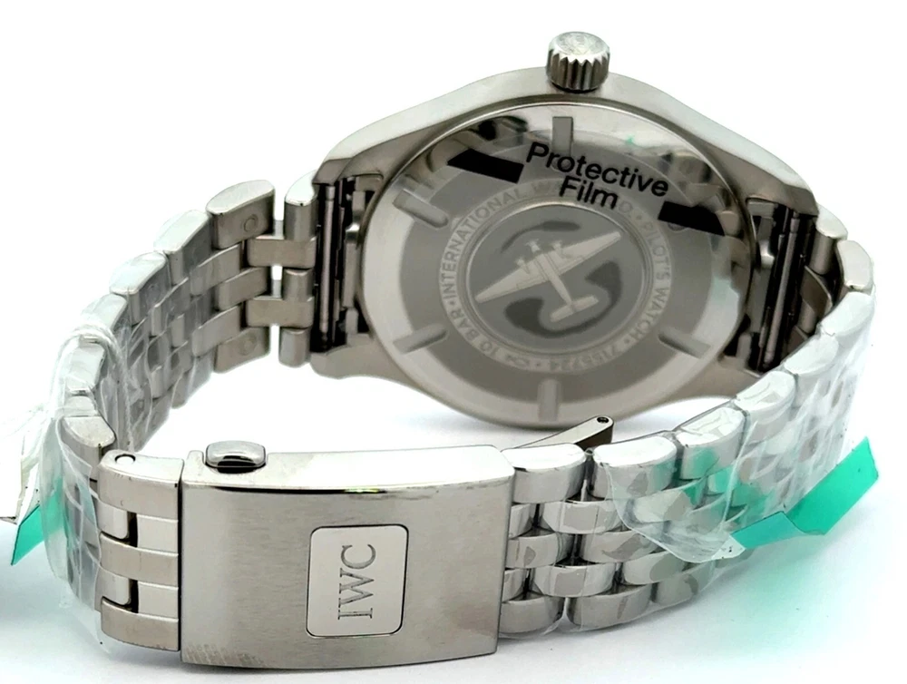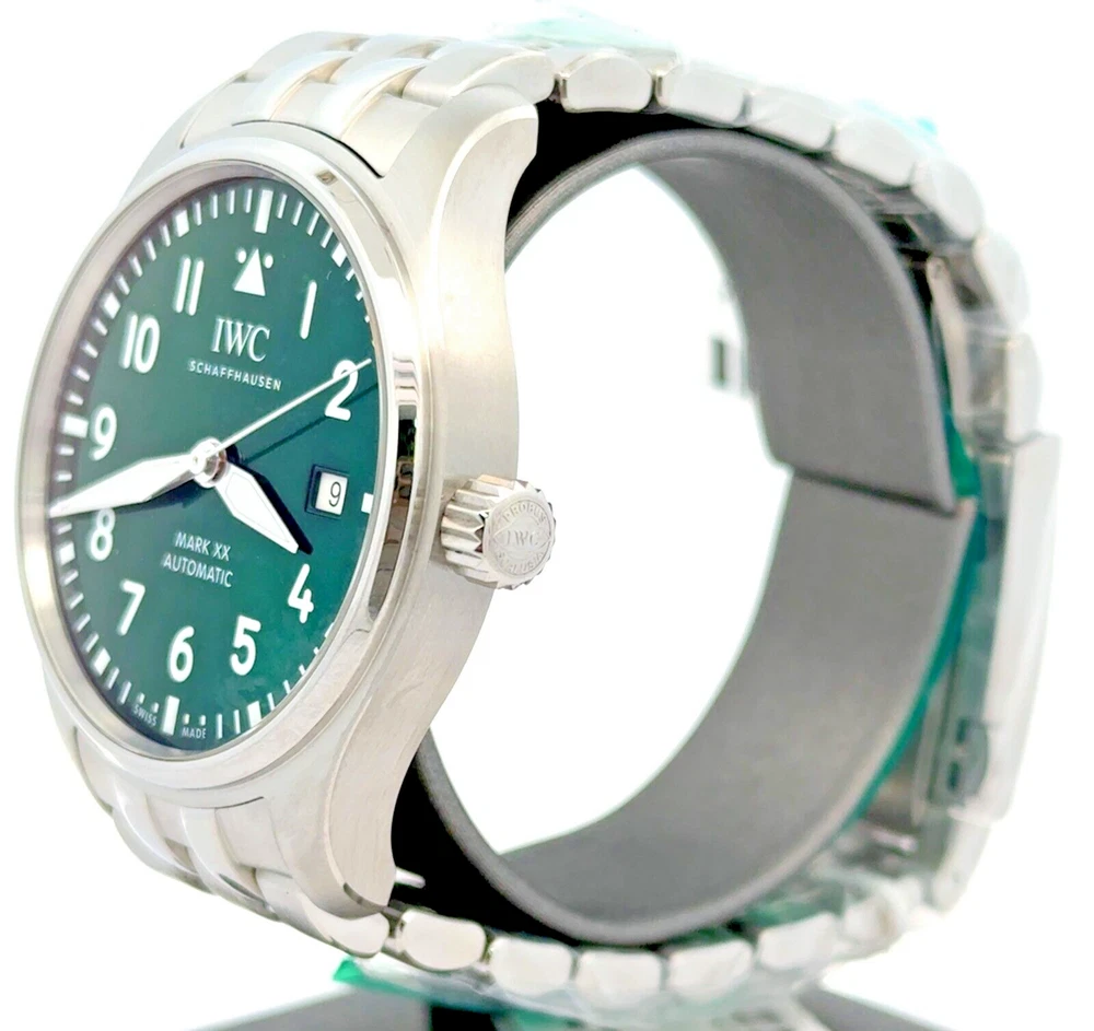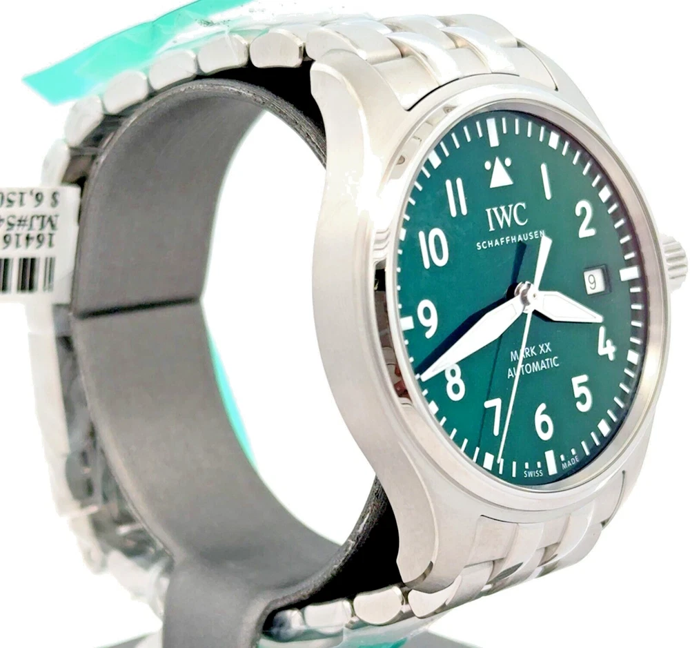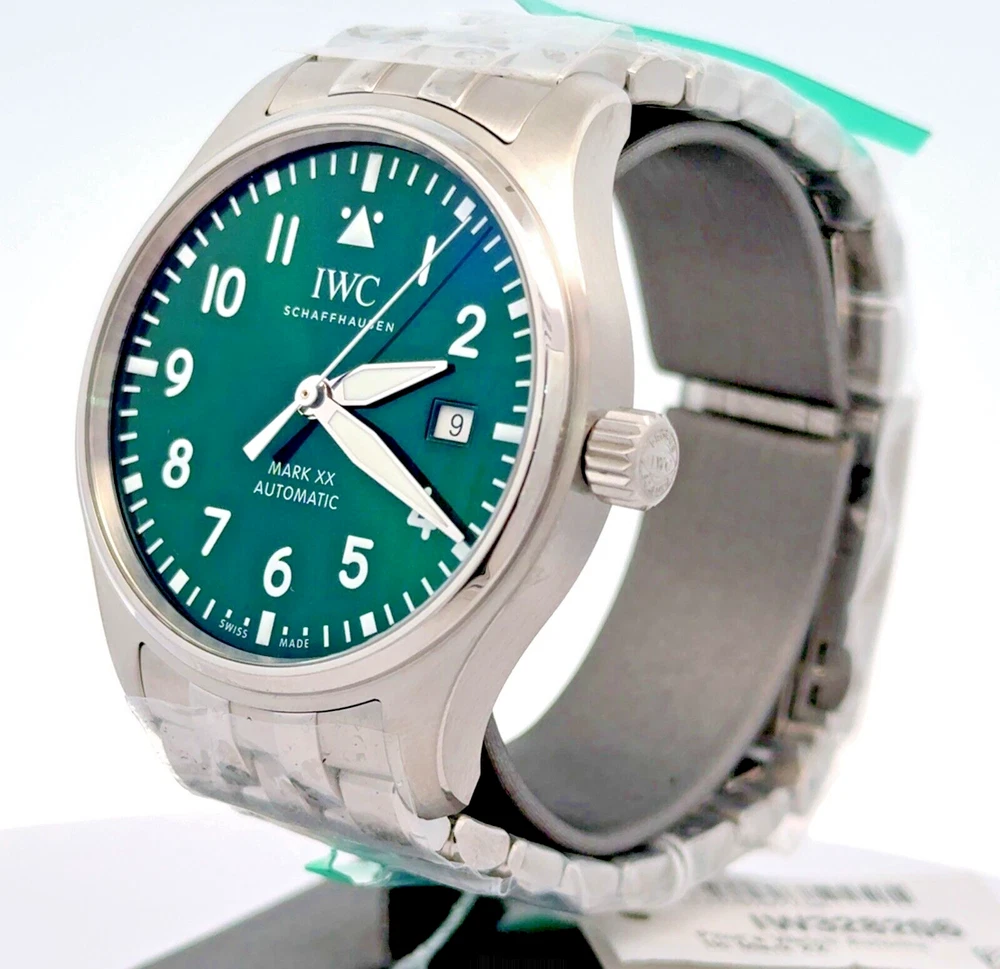 Pilot’s Watch Mark XX - Green Dial Stainless steel Case, Automatic winding, Diameter 40.0 mm, Green dial, Stainless steel bracelet with EasX-CHANGE system, Strap width 20.0 mm. BRAND NEW - 8 YEAR FACTORY WARRANTY ! Stainless steel Case Diameter 40.0 mm Height 10.8 mm Screw in crown True Water resistance 10.0 bar 32111 Calibre Movement type Automatic winding, IWC-manufactured movement Power Reserve Indicator 120 hours Frequency 28'800 VPH (4 Hz) Components 163 Jewels 21 Côtes de Genève Central hacking seconds Sapphire glass, convex, antireflective coating on both sides Glass secured against displacement by drop in air pressure Date display RETAIL PRICE: $6,150.00