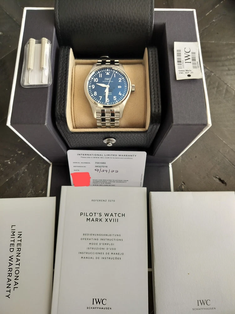 Case Size: 40 mm Reference Number: IW327016 Style: Casual, Classic, Dress/Formal, Luxury, Pilot/Aviator Brand: IWC Case Color: Silver Type: Wristwatch Water Resistance: 60 m (6 ATM) Movement: Mechanical (Automatic) Model: IWC Pilot's Watches Dial Color: Blue Case Material: Stainless Steel Bezel Color: Silver Features: Date Indicator, Sapphire Crystal, Screwdown Crown With Papers: Yes Display: Analog With Original Box/Packaging: Yes Department: Men Customized: No Band Color: Silver Band Material: Stainless Steel