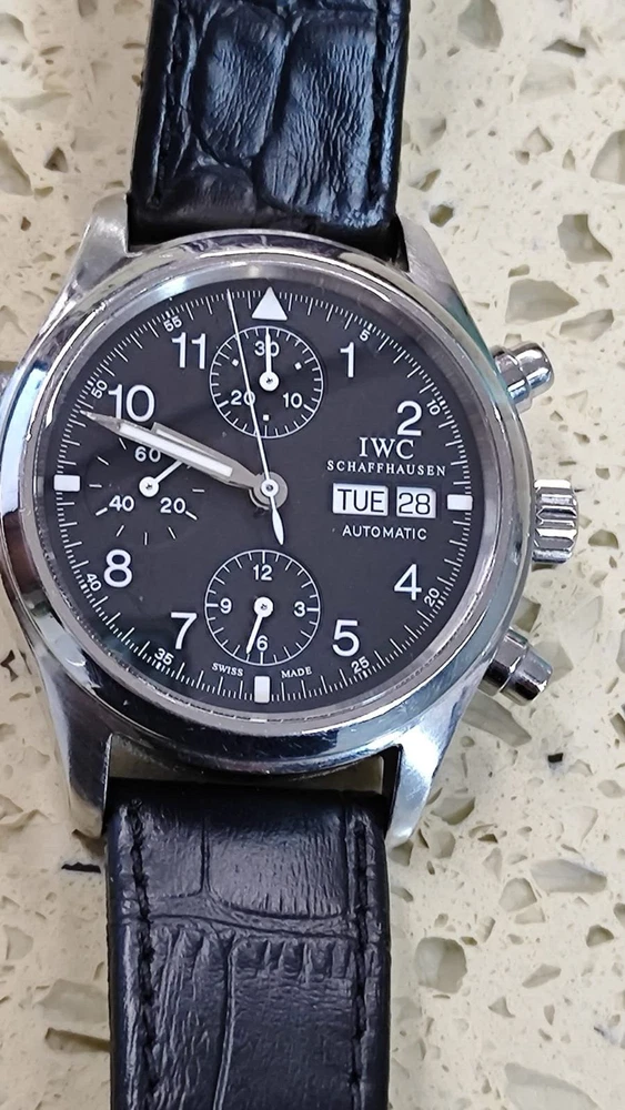 Introducing the IWC The Pilot's Chronograph Men's Watch, Automatic, Day/Date - Ref. 3706 Uesd. This remarkable timepiece boasts a mechanical (automatic) movement, making it a reliable choice for any occasion. Its water resistance capability of up to 3 m (0.3 ATM) makes it suitable for use while diving or other water activities. The watch was manufactured between 1980-1989 in Switzerland by IWC, a renowned brand in the watch industry. It features an alarm and chronograph, making it a versatile tool for aviation and other industries. The stainless steel case and black leather band give it a sleek and sophisticated look, perfect for any style-conscious man.