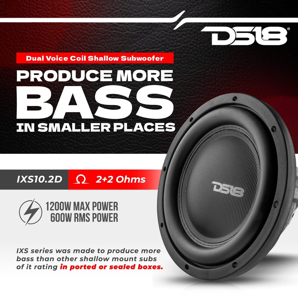 SPECIFICATIONS Nominal Diameter 10” / 254mm Nominal Impedance 2+2 ohms RMS Power Handling 600w MAX Power Handling 1200w Sensitivity (1w/1m) 84 dB Frequency Response 20 - 800 Hz Recommended Lo Pass Crossover 90 Hz MOTOR Voice Coil Diameter 2.5" / 63.5mm Voice Coil Former Material Aluminum Winding Material Copper Cone Material Paper Dust Cap Material Fiberglass Surround Material Stitched rubber Basket Material Aluminum Basket Color/Finish Corrugated Black Magnet Material Ferrite Magnet Weight 62 Oz Displacement Volume 0.9L / 0.032ft3 MEASUREMENT Overall Diameter 10.63" / 270 mm Overall Depth 4.48" / 114 mm Front Mount Baffle Cutout 9.25" / 235 mm Mounting Depth 3.66" / 93 mm Motor Diameter 6" / 154 mm SLIM SUBWOOFER - Built from our best selling SW slim subwoofer line the experts at took the SW line and made it even beefier for more bass POWERFUL SUB - This sub handles 600 Watts RMS and 1200 Watts MAX Power with a 84 dB sensitivity: high sensitivity for a shallow mount sub raising this model above and beyond the standard DUAL VOICE COIL - These Dual Voice Coil Subs are perfect for the listener looking to add more thump to their system SHALLOW MOUNT DESIGN - Shallow mount size will let you fit this sub in compact places and requires less box space than other subs its size giving you many options in which to place it NEVER STOP INNOVATING ATTITUDE - stands out from other brands with our progressive designs and unwavering commitment to delivering the most technologically up-to-date products on the market