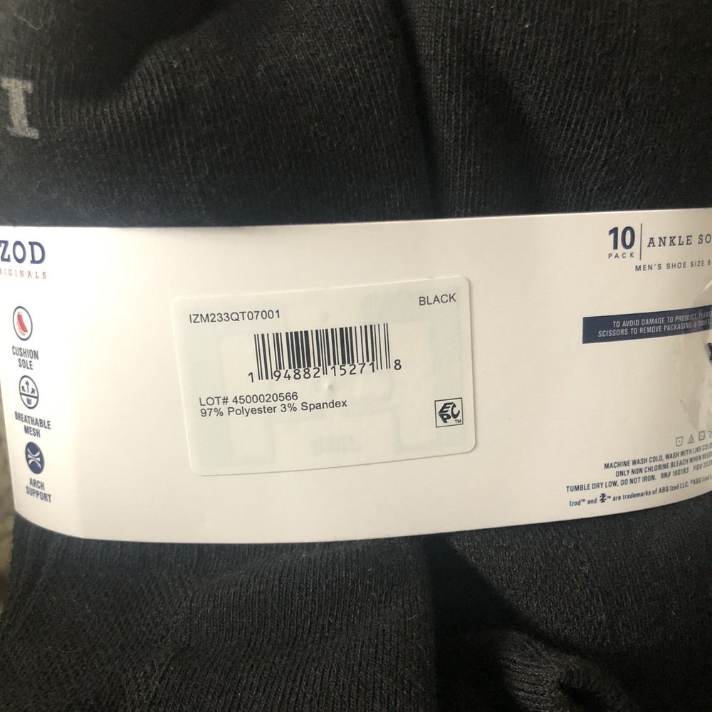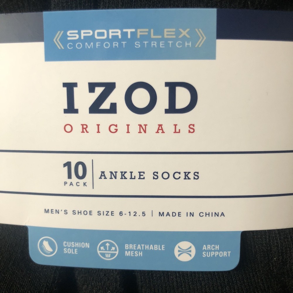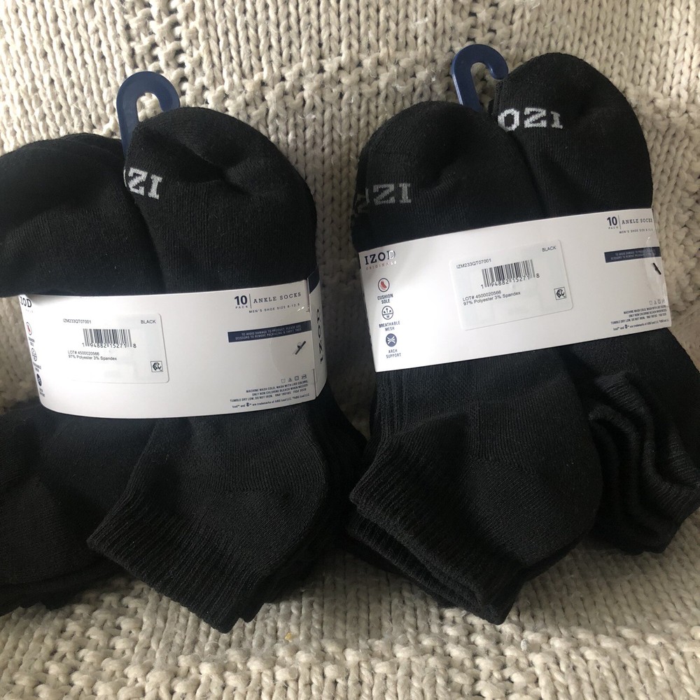 IZOD Sport Flex Men's Ankle Socks 2 Pack 10-Pairs Cushion Sole Fits 6-12.5 Black. Brand new. 20 pair included (10 in each pack). Great, quality made and highly rated! Let me know if you have any questions. Priced to sell! Thanks so much for stopping by.