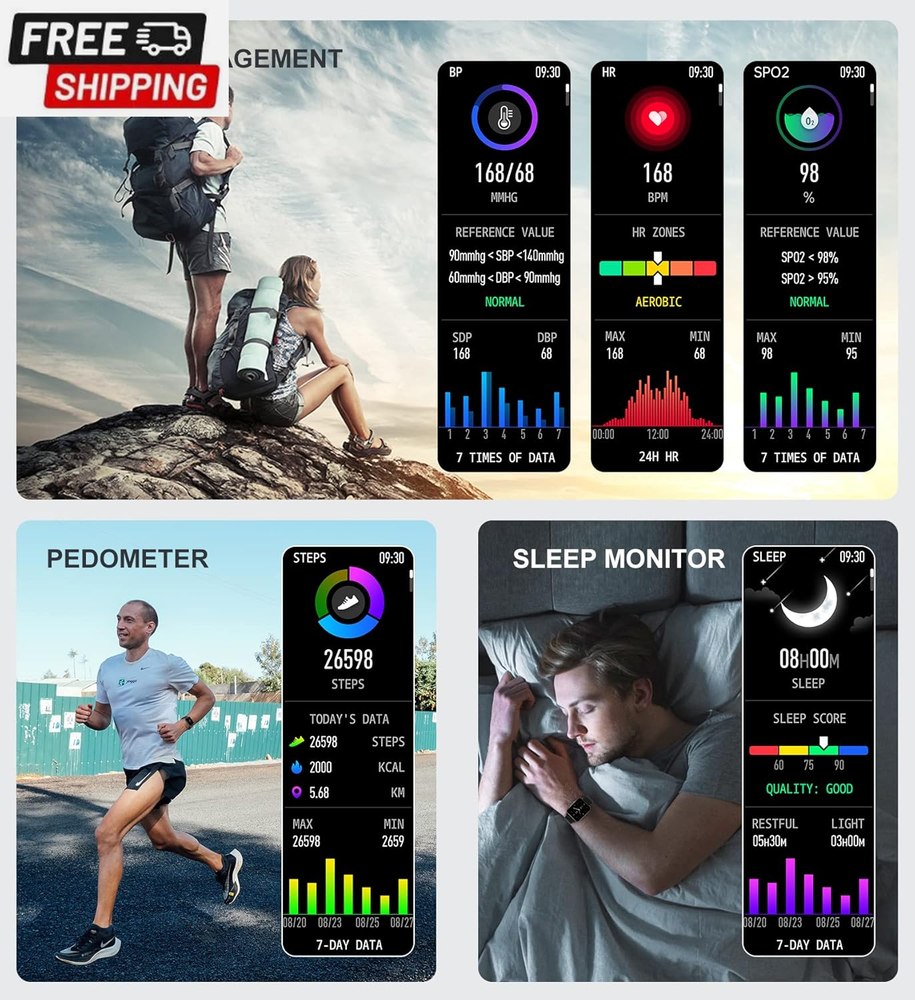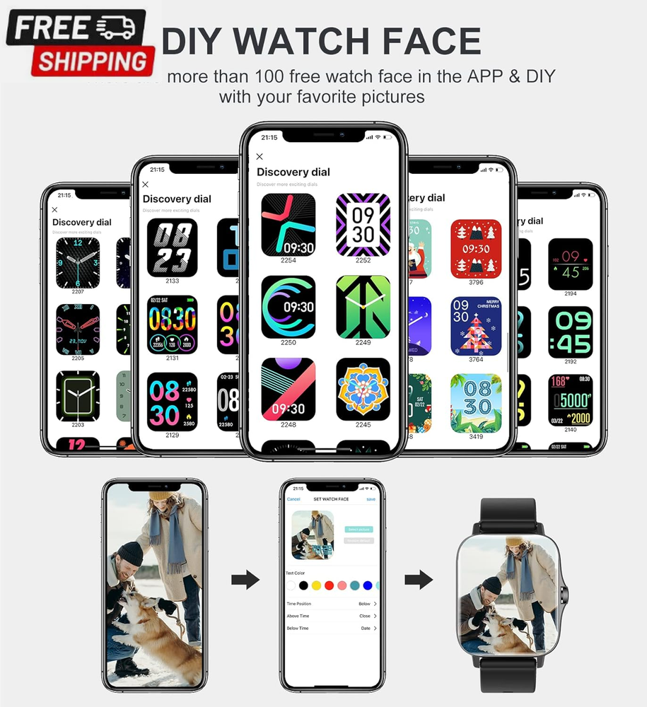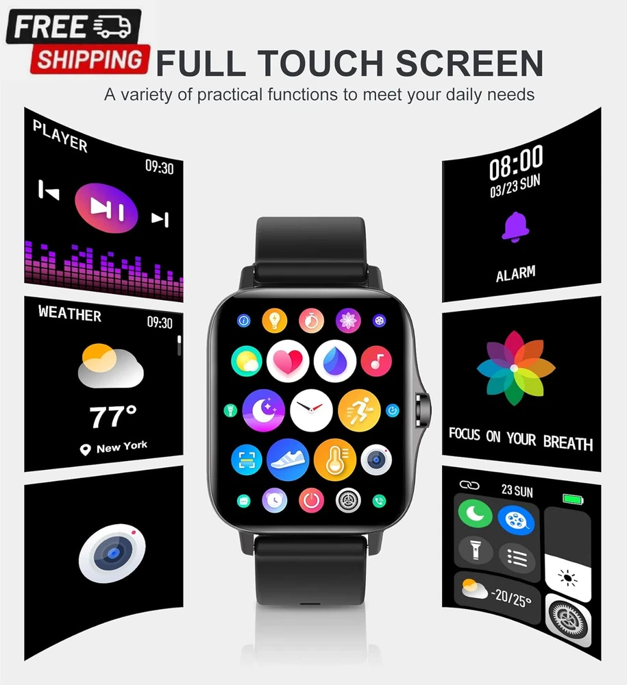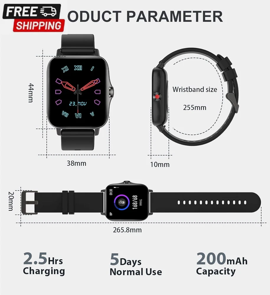 Fast Shipping On All Items 30 Days Money Guarantee Customer Support Excellent Service 100% Satisfaction Satisfaction Guaranteed Iaret Smart Watch for Women Men (Answer/Make Call), Fitness Tracker for Android Ios Phones Waterproof Smartwatch 1.7" HD Full Touch Screen Activity Trackers Heart Rate Sleep Monitor Pedometer, Black Specification Item model number Partielle Aktualisierung Style Modern Operating System Android & iOS Battery Cell Composition Lithium Ion Special Feature function(f) {var _np=(window.P._namespace("DetailPageProductOverviewTemplatesJava"));if(_np.guardFatal){_np.guardFatal(f)(_np);}else{f(_np);}}(function(P) { P.when('A').execute(function(A){ A.on('a:truncate:po-attribute-truncate-1:updated', function(data) { var isTruncated = !data.truncateInstance.getIfTextFits(); var seeMoreElement = document.getElementById('po-attribute-see-more-id-1'); if(seeMoreElement) { seeMoreElement.style.display = isTruncated ? '' : 'none'; } }) }); })); Sleep Monitor, Pedometer, Notifications, Alarm Clock, Calorie Tracker, Camera & Music Player Control, Cycle Tracking, Gesture Control, Sedentary Reminder, Time Display, Activity Tracker, Phone Call, Heart Rate Monitor See more Product Dimensions 1.73 x 1.54 x 0.47 inches Connectivity Technology Bluetooth Item Weight 7.8 ounces Shape Rectangular Wireless Communication Standard Bluetooth Standing screen display size 1.7 Inches Batteries 1 Lithium Ion batteries required. (included) Manufacturer Iaret Screen Size 1.7 Inches Brand Iaret GPS No GPS Item Description CALL RECEIVING/DIALING: After connecting to Bluetooth, you can directly make calls and answer calls on your watch. Iaret smart watch with text and call supports quick communication, information reminder, social media notification( Facebook, WhatsApp, Instagram, Twitter, etc.). With all notifications displayed on your wrist and alerted by vibration, you can keep your phone in your pocket without missing any important calls or messages when you're out walking, exercising, or seeing friends. SMART WATCHES FOR WOMEN MEN: Ultra-thin metal frame with 1.7" HD full touch color screen brings smooth touch and excellent visual experience. Dial store has 100+ free dials for you to choose from, you can also change your favorite picture as a watch face with one click. Comes with 2 bands, the stainless steel one is exquisite, while the silicone band is more casual. ALL-ROUND HEALTH MONITORING: This smart watch can detect your 24/7 heart rate, blood pressure and blood oxygen to get a better understanding of your health (Not for medical use). The high-performance motion sensor monitors sleep status automatically and provides comprehensive sleep quality analysis (deep sleep, light sleep and awake). You can also use the Female Physiological Cycle, Drink Reminder and Sedentary Reminder features to help you make reasonable adjustment on your lifestyle. ALL DAY ACTIVITY & FITNESS TRACKER: As a precision fitness watch, the activity trackers support 8 sports modes: walking, running, cycling, skipping, badminton, basketball, football, swimming. The fitness trackers for women men accurately track all-day activities such as steps, distance, calories, exercise time and heart rate. And you can use the stopwatch tool to time your run. The best choice for fitness enthusiasts. EVERYDAY FEATURES AT THE READY: iOS Android smart watch for women men is equipped with a 230 mAh large capacity battery, only takes 2 hours to get fully charged and can be used for 3-7 days (Note: depends on individual usage). IP67 waterproof watch, so you don't have to take off while washing your hands, not suitable for diving, shower or sauna. More practical tools such as mobile music playback and photo control, weather display, find watch, timer, alarm clock, etc. Product Description Iaet Smartwatch Make and Receive Calls Bluetooth Voice Call Watch: Bluetooth Call Smartwatch/Receive Messages/SNS Notification(Can not reply message). Clear bluetooth call texture, free your hands anytime, anywhere, make answering and making calls more efficient, easy to deal with home, work, sports and other scenarios. You can keep your phone in your pocket without missing any important calls or messages! All-round Health Monitoring: Heart Rate/Blood Oxygen/Blood Pressure Monitor Watch, Sleep Tracker Watch Fitness Tracker: Multiple exercise modes, display steps, distance, calories, exercise time and heart rate Smart Watch For Android And Ios Phones: Support iOS 7.1 and above, Android 4.4 and above A variety of functions, let you enjoy the life experience that technology brings to you. Your Ultimate Fitness Assistant You can check the exercise distance, speed, heart rate change, calories burned, etc. on the activity tracker watch to help you record data while exercising, so you can get in perfect figure and exercise more professionally. Provides 8 sports modes (walking, running, cycling, skipping, badminton, basketball, football, and swimming). The new multifunctional Bluetooth call smart watch makes your life more convenient and comfortable Weather Forecast: Keep your phone and watch connected, and the watch can synchronize the weather forecast function. You can see the air quality index and the recent weather conditions on the fitness watch. Remote Control Camera: You can take selfies or group photos with better pose or photo vision. Turn on the camera function in the "Da Fit" app and easily control your phone camera with the smart wristband. IP67 Waterproof: The water resistant design is perfect for sports enthusiasts. You can wear this men's watch whether it's for daily hand washing or rainy days. Note: please don't use in diving, hot water, or environment with corrosive liquids and hot steam. The waterproof function is not permanently effective, and the protective performance may be reduced due to daily wear and tear. Stopwatch And Timer Function: Which can help you calculate how much time you need for each exercise or complete the training within the targe