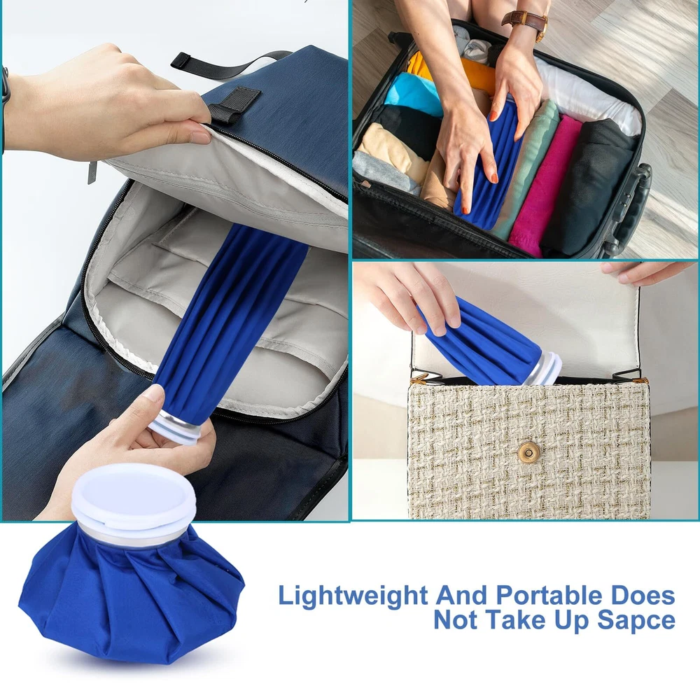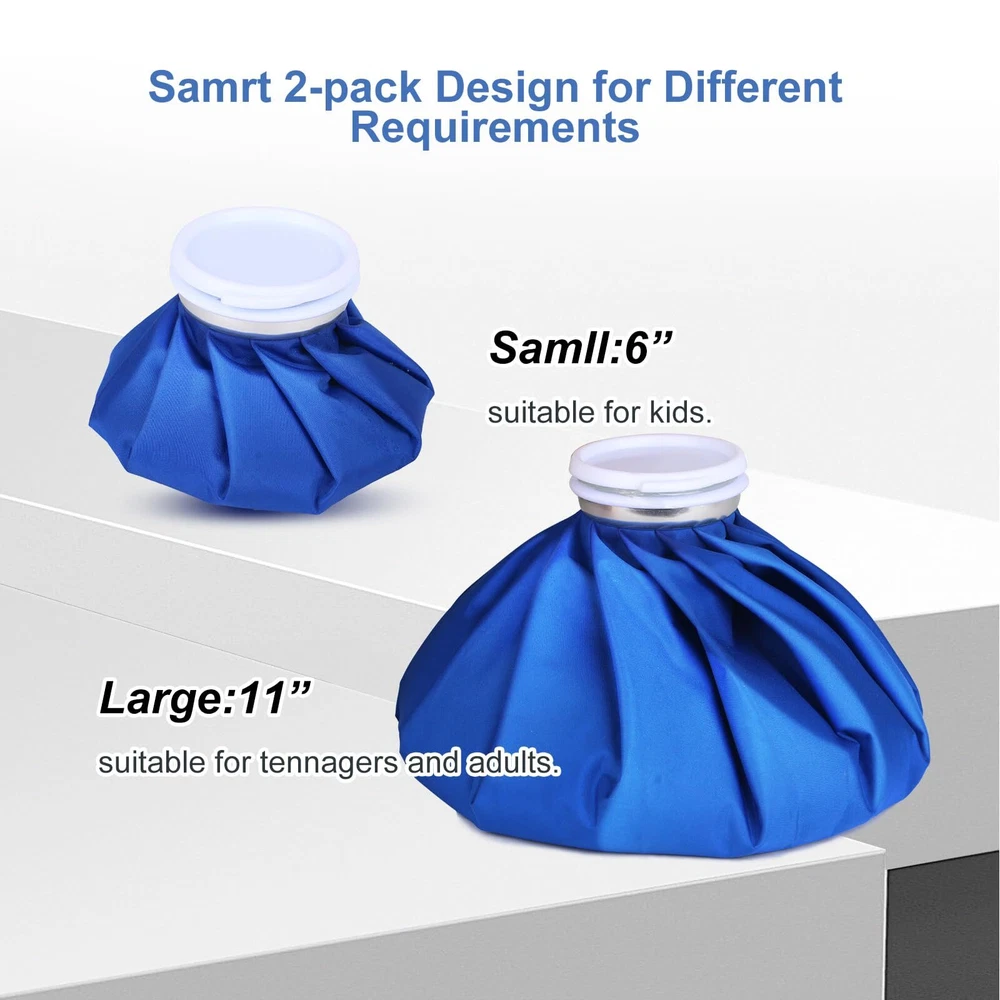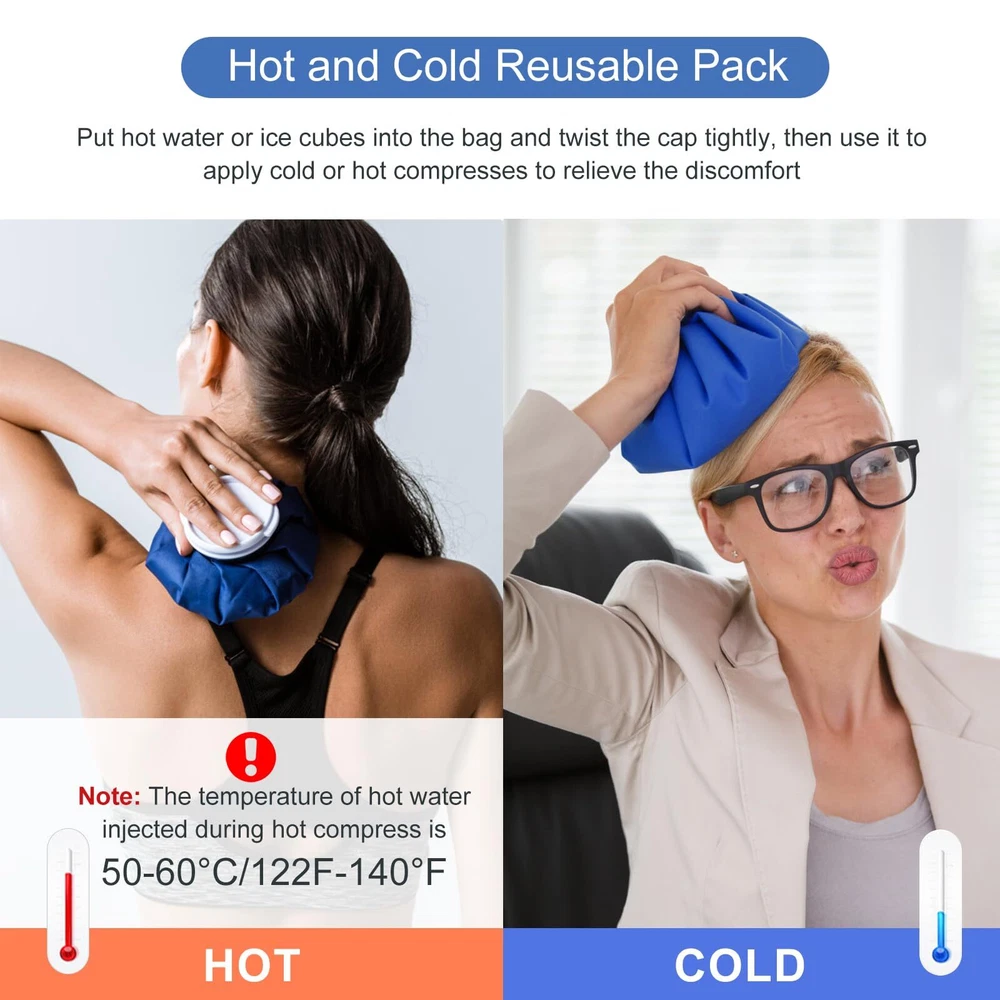 [TWO SIZES DESIGN]: The compact ice pack is ideal for children or minor discomforts, where as the bigger one is suitable for teens and grown-ups [SAFE AND REUSABLE]: The Large opening on the superior Leak-resistant cap enables effortless filling with ice cubes or crushed ice. The soft, waterproof and flexible textile keeps the water colder or hotter for a longer duration compared to other packs or gel packs [INSTANT PAIN RELIEF]: The ice bag packs are perfect for administering cold therapy to relieve discomfort and inflammation resulting from minor cuts, bruises, muscle pain, sprains and strains. They are also useful for sports-related injuries and first-aid purposes [FLEXIBLE & PORTABLE]: The ice pack is lightweight, versatile, and practical. You can take it with you wherever you go, making it perfect for use at home, work, or on your travels [100% QUANLITY WARRANTY]: Customer satisfaction is our priority. If for any reason you're not completely satisfied, don't hesitate to contact us , we will compensate you as soon as possible to ensure your rights. Buy with confidence