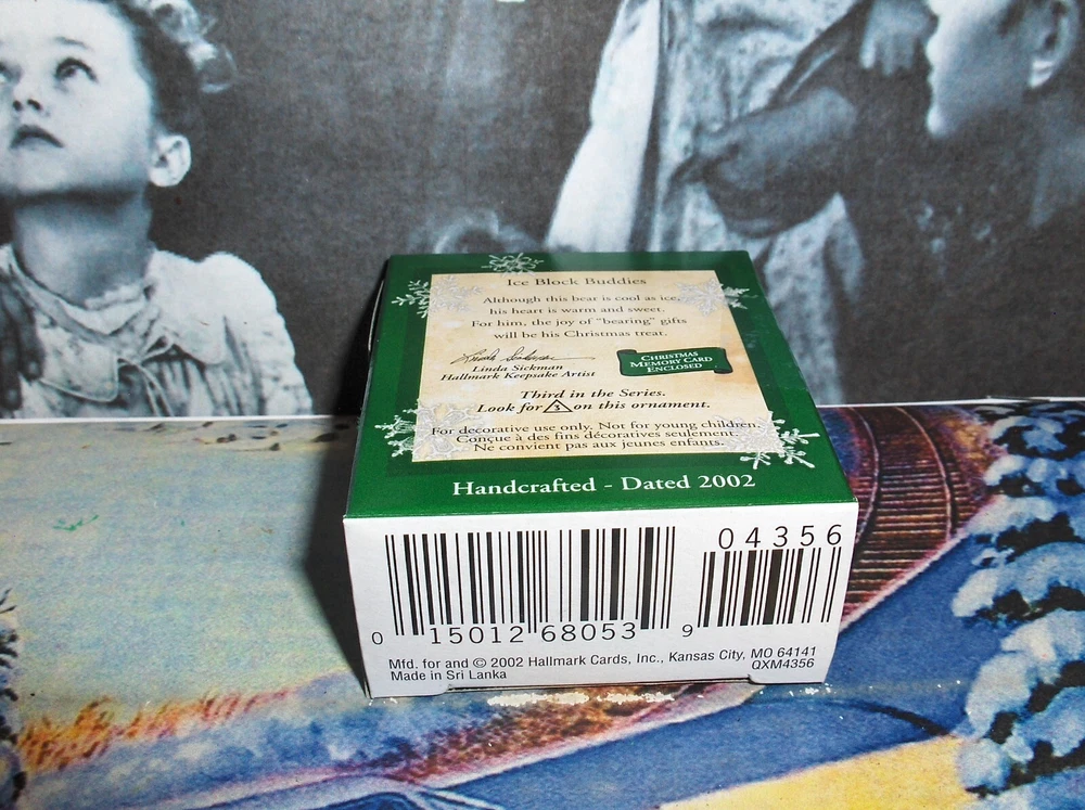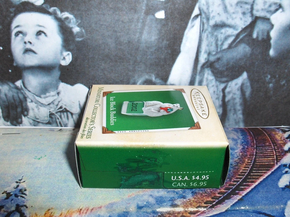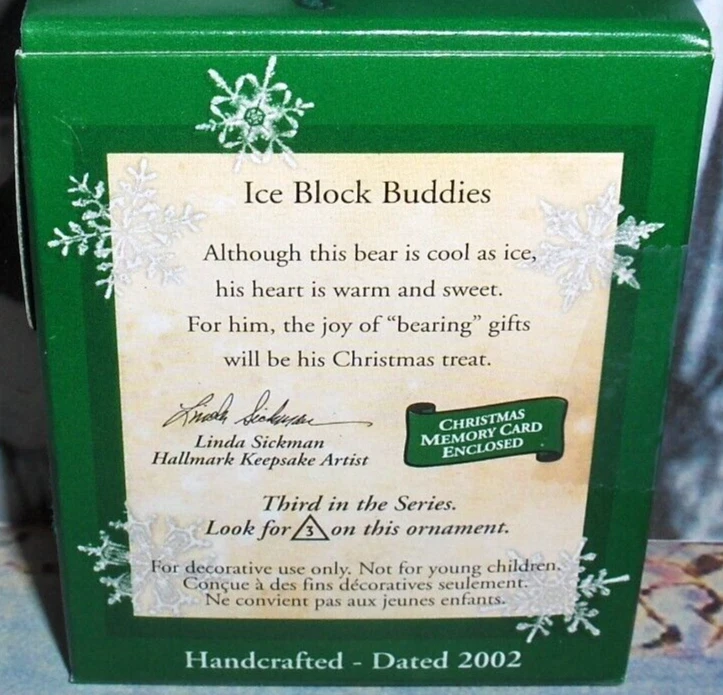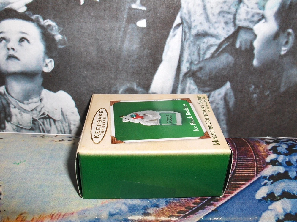 We Have For Sale A USED->Approx 1 Inch Miniature Hallmark Tree Ornament , ( 1 ) Hallmark Ornament / Ice Block Buddies,This Ornament Comes Complete With It's Factory Memory Card.. ( 2 ) Type / Ice Block Buddies Ornament.. ( 3 ) Collector's / Although This Bear Is Cold As Ice,His Heart Is Warm And Sweet.. ( 4 ) Year / 2002 ( 5 ) Lighted / N/A ( 6 ) Box Condition / Box Is Nice But Does Have A Spot On Top Ware A Sticker Was,So Were Selling This One For Less,If The Box Is No Issue Then This Ornament Is A Great Buy For The Money-Look At All Pictures,Check Out Our Many Other Hallmark Ornaments In Our EBAY STORE.. ( 7 ) Ornament Condition / Mint In Box... SHIPPING WITH TRACKING IS FREE TO THE USA.. -->>ALL OUR ORNAMENTS SHIP TO YOU IN BRAND NEW BOXES-NOT ENVELOPES OR SOMEONE ELSE'S SECOND HANDED USED BOXES-STAY SAFE...