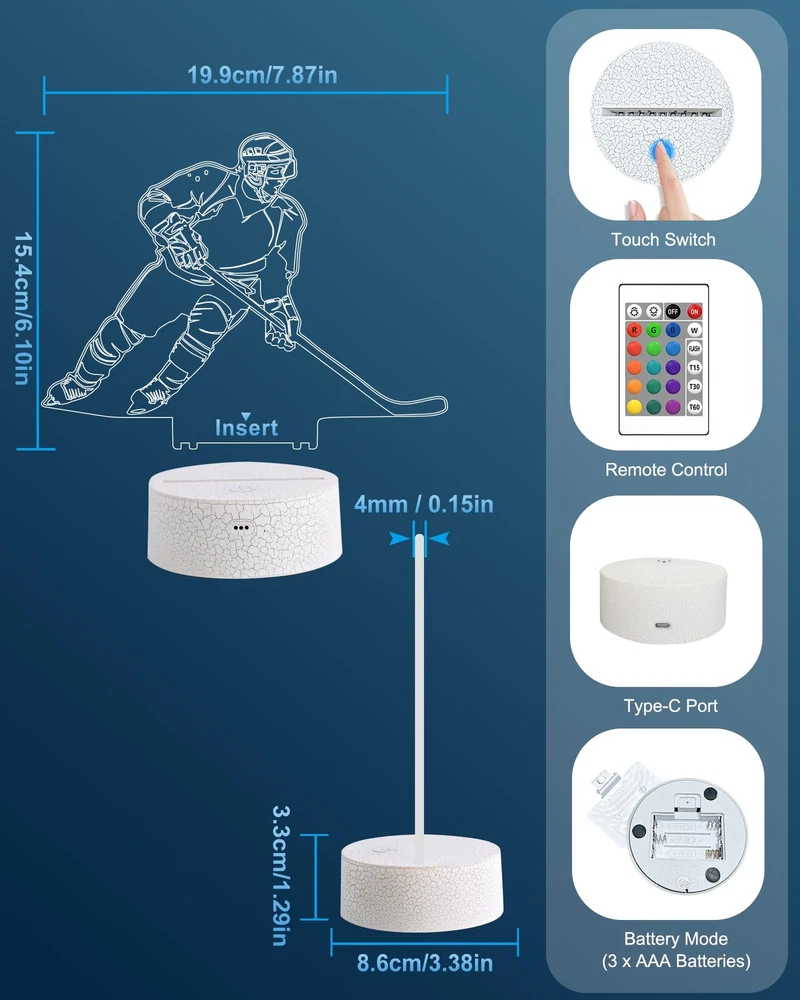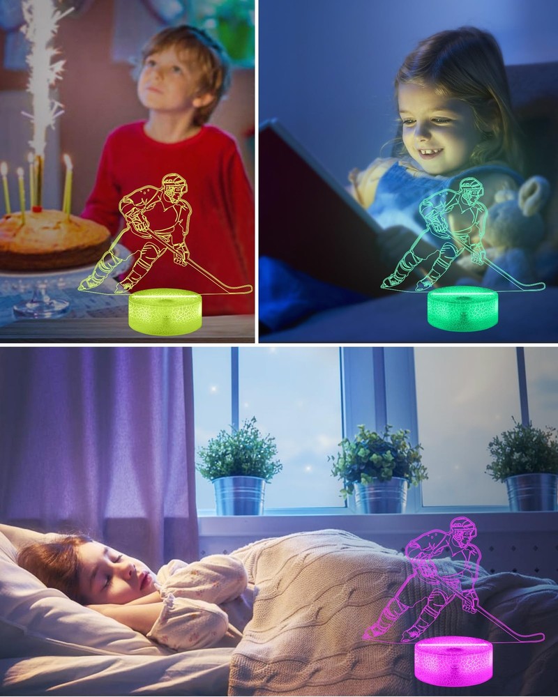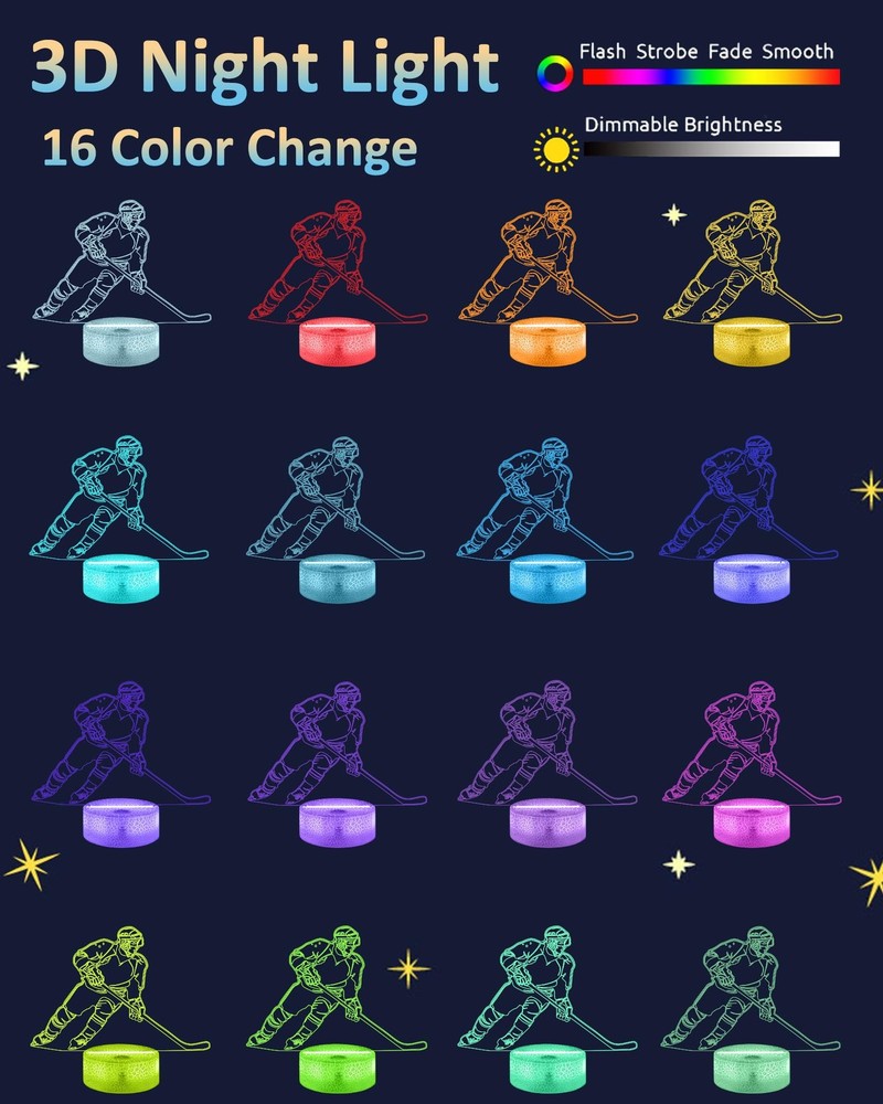 Why Choose our Brand: ? ✔ A Brand new 3d ice hockey glow night light and best ideal choice for room decor. It sure will impress your guests when they walking in the room. ✔ It's not just a kid's nightlight, also the big boys and men. It's perfect creative toy for anyone who likes ice hockey and has a sense of eye-opening. ✔ 16 colors changing/ Remote Control function/ Timer/ Dimmable/ 4 modes of color flashing (Flash, Strobe, Fade, Smooth) / Two ways of power supply: 3*AAA Batteries(not included) or USB plug in (Suggested) ✔ Best Gifts during Birthday, Halloween, Christmas, New Year, Thanksgiving, Valentines, Mothers Day, Fathers Day, Graduation Day. Satisfactory service: ★180-days refund protection. ★SAFE-BUY for any quality-related issue. Note: ⚠【3D just Visual, the lamp itself is Flat】ice hockey 3d lamp is made with 3d technology to create a gorgeous optical 3d illusion ⚠On/Off switch on the base, connect to the USB adapter (Adapter Not Include) ⚠Not suitable use for reading or main lighting source Description: Colors: 16 Color Changes Available with Remote Control Power Input: DC 5V 1A Switch mode: Touch Switch Product Power: 0.5W Power spend: 0.012kw.h/24 hours; 4.38 kw.h per year LED life span: 10000hours Material: Acrylic + ABS Package Weight: 300g Package include: -1 x Acrylic Plate -1 x ABS Base -1 x USB cable -1 x Remote Control -1 x Instruction Manual 🏒【Creative 3D Visual Effect】The ice hockey lamp is made of laser engraving on an optical acrylic plate to show the optical amazing 3d illusion. The kid night light is a unique toy for all the ice hockey little fans and has a sense of whimsy. It's a great decor for the sports Themed room 🏒【Remote Control+Timer+Dimmer+Smart Touch】Newly upgraded version ice hockey night light can be set free from 15 minutes to 12 hours. The 3d lamp has 16 colors changing and 4 kinds of flashing, and you can adjust the light brightness to not impact your sleep 🏒【Eco-friendly & Safety】Bigger SIZE of acrylic panel scratch-resistant is made from Safe approved eco-friendly material, safe for the human body. High-quality LED light with soft, uniform, non-flicker light, harmless to child's eyes./ Two methods of electricity supply:3*AAA Batteries (not included) or USB cable 🏒【Personalized Gift】The ice hockey hologram lamp can added attraction to the dark corner of the house during night time. It's a perfect Birthday, Christmas or holiday gift toy for boys and girls. Used in children bedroom, baby bathroom, living room, hallway, study, office, bar decoration 🏒【Customer Service】Stands by the quality of our ice hockey gifts night light. The bedside light has been thoroughly tested before given to you. We are here to help: If it doesn't work out for you for any reason please feel free to contact us on Amazon, we will get back to you in 24 hours
