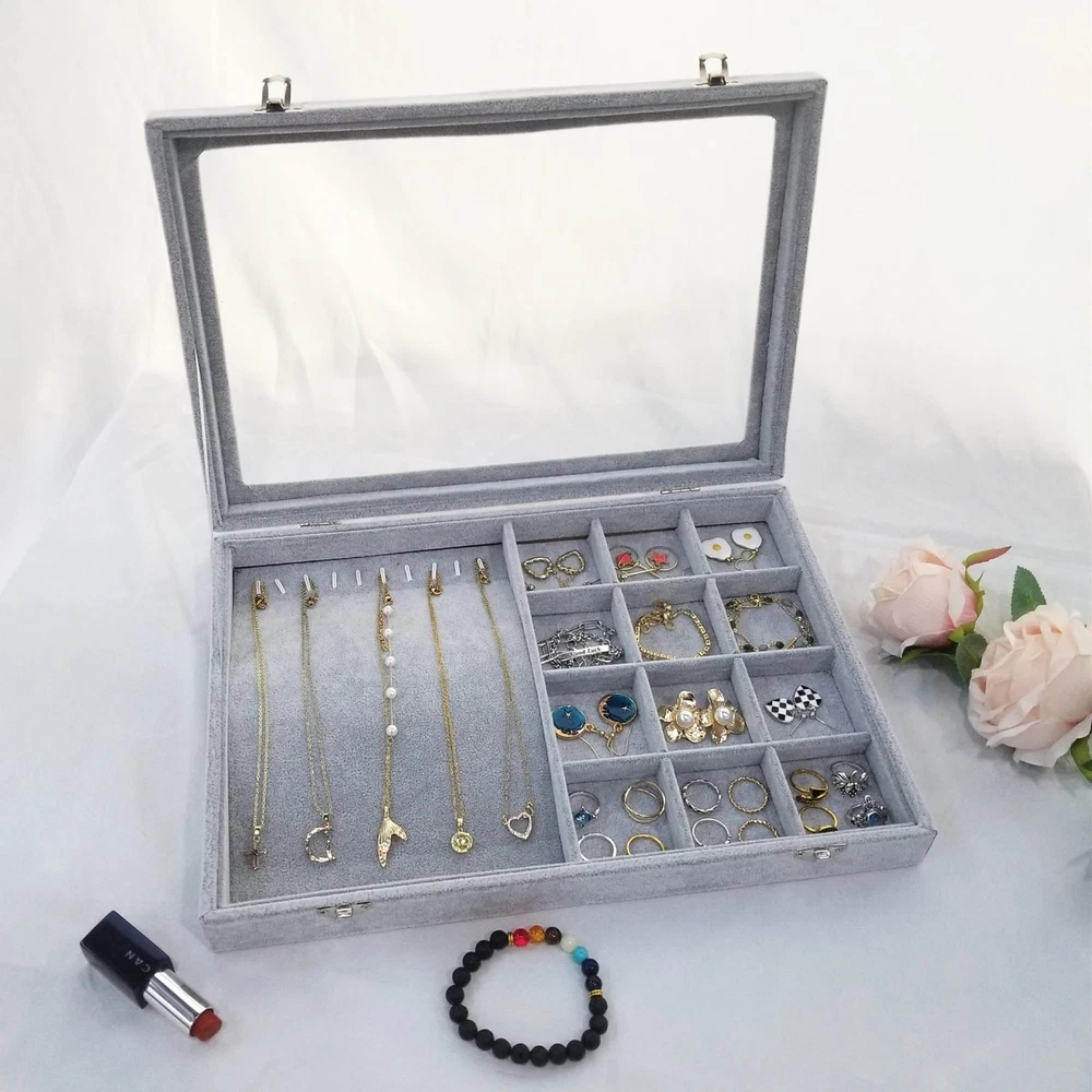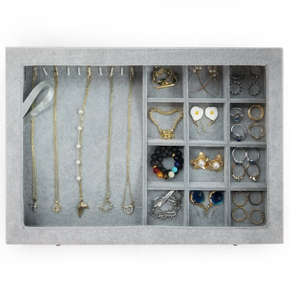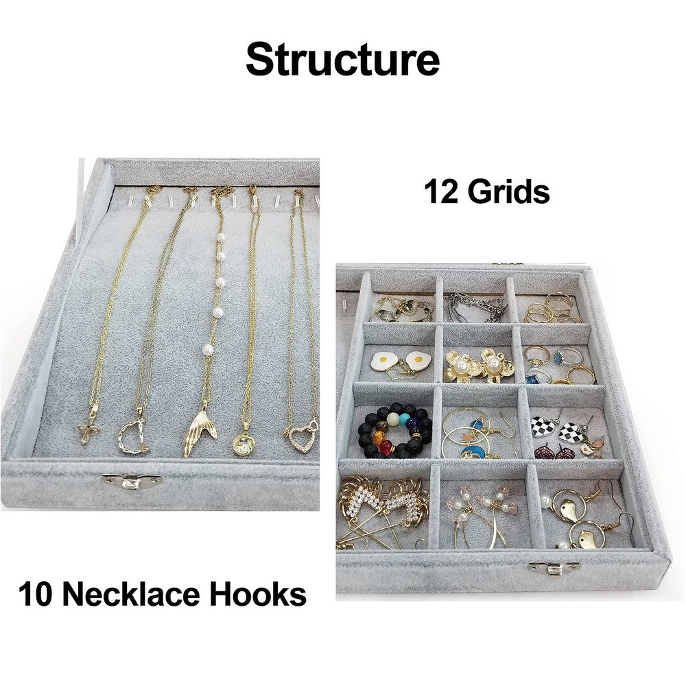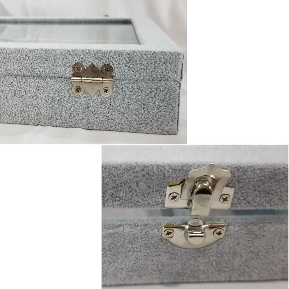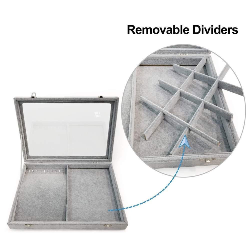 Ice Velvet Jewelry Box Display Case with a Clear Glass Window,10 Hooks Necklace Organizer Box and 12 Grids for Earrings Rings Storage Grey Product Details Color: 12 Grids & 10 Necklace Hooks Brand: BesyPro MPN: Does not apply UPC: Does not apply EAN: Does not apply Color: 12 Grids & 10 Necklace Hooks Brand: BesyPro Material: Ice velvet & glass Style: Elegant Special Feature: Durable,Large Capacity Recommended Uses For Product: Ring Product Dimensions: 13.78"D x 9.45"W x 1.97"H Target Audience: Women, Girls Shape: Rectangular Occasion: Mother's Day, Wedding, Birthday, Valentine's Day Color: ‎12 Grids & 10 Necklace Hooks Brand: ‎BesyPro Material: ‎Ice velvet & glass Style: ‎Elegant Special Feature: ‎Durable,Large Capacity Recommended Uses For Product: ‎Ring Product Dimensions: ‎13.78"D x 9.45"W x 1.97"H Target Audience: ‎Women, Girls Shape: ‎Rectangular Occasion: ‎Mother's Day, Wedding, Birthday, Valentine's Day Mounting Type: ‎Table Top Finish Type: ‎Metal Inner Material: ‎Ice velvet Closure Type: ‎Buckle Number of Drawers: ‎12 Item Weight: ‎1 Pounds Number of Compartments: ‎10 Jewelry Storage Type: ‎Jewelry Case Number of Items: ‎1 Manufacturer: ‎Junclair Global Trade Identification Number: ‎ Item Weight: ‎1 pounds Country of Origin: ‎China Size: ‎one size Finish: ‎Metal Pattern: ‎Solid color Number Of Pieces: ‎1 Special Features: ‎Durable,Large Capacity Batteries Included?: ‎No Batteries Required?: ‎No Date First Available: October 27, 2021 Large Capacity : This jewelry case is composed of 12 grids & 10 necklace hooks which can store earrings,rings and necklaces Clear Lid : Equipped with a clear glass lid that help you find your jewelry quickly and keep them dust free High Quality : Made of durable composite board covered with soft and smooth ice velvet to protect your jewelries Metal Clasp : Easy open and close with 2 clasp design,practical jewelry case keep your beautiful jewelry neatly organized in one place Great Gift : If you have no any idea of gift for Birthday,Christmas,Valentine's Day,Mother's Day,Anniversary Day etc,this is your ideal choice