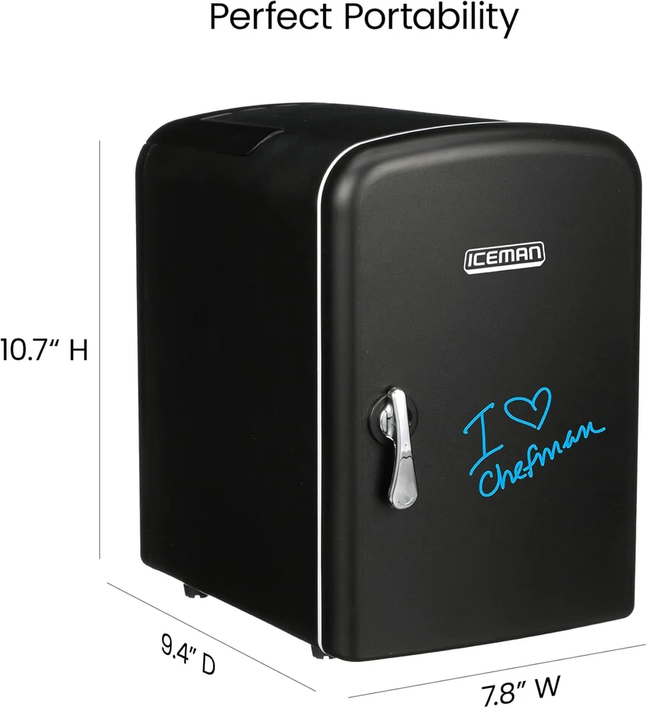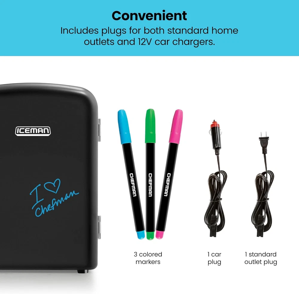 COMPACT SIZE: 4 Liter capacity chills six 12 oz. soda cans; interior is 5 x 5 x 7.5 and includes removable shelf so you can store small items such as yogurt, fruit, milk, juice, smoothies, bottles, cheese, coffee, soup; the possibilities are endless. COOLING AND WARMING: With the flip of a switch, set the fridge to either cool or warm to store your food and drinks the way you would like! Unplug the fridge before switching settings. When switched to the cool setting, the food or drink being stored in the fridge must already be cold for the item to stay cool; for the warm setting, food must be warm/hot before placing in the fridge. ECO-FRIENDLY & SAFE: 100% Freon-Free and Eco Friendly; cETL approved with advanced safety technology for long lasting durability. Includes plugs for both standard home outlets and 12V car chargers. PERFECT PORTABILITY: It???s small size, sleek design and convenient carry handle, makes it easy to take the mini fridge with you on the go! Great for personal spaces, travel, offices, dorms, road trips, boating, camping, tailgating, commuting, and more! The eraser door is great for writing notes, leaving messages or using just for fun! 1 YEAR WARRANTY: cETL approved with advanced safety technology for long lasting durability, & 1-year hassle-free warranty provided by Chefman, so you can purchase worry-free - we've got your back! RJ48-BLACK-DE