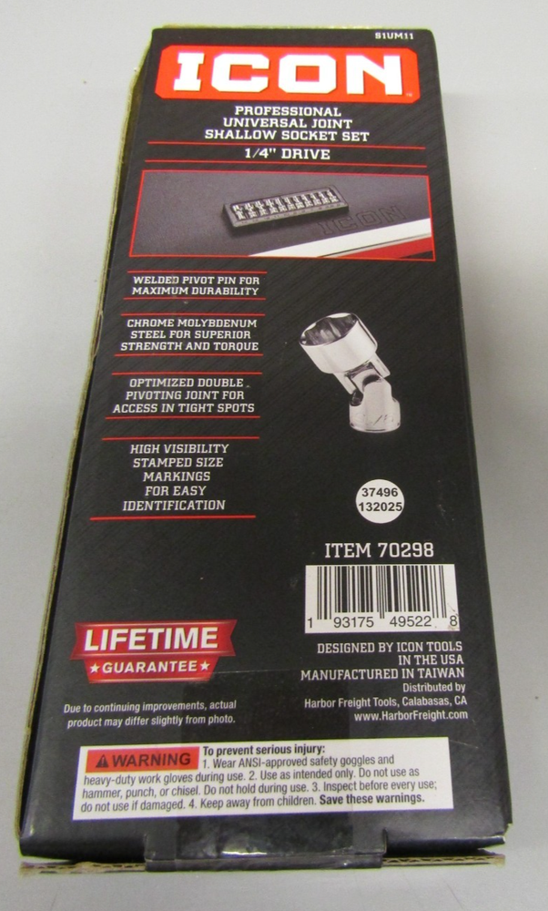 Size:5mm, 5.5mm, 6mm, 7mm, 8mm, 9mm, 10mm, 11mm, 12mm, 13mm, 14mmWarranty:LifetimeBrand:iconManufacturer Part Number:S1UM11Tools Included:SocketsNumber of Pieces:11System of Measurement:MetricSurface Finish:ChromePoints of Contact:6UPC:0193175495228Set or Single Item:SetCountry of Origin:Taiwangtin13:0193175495228Drive Size:1/4in.