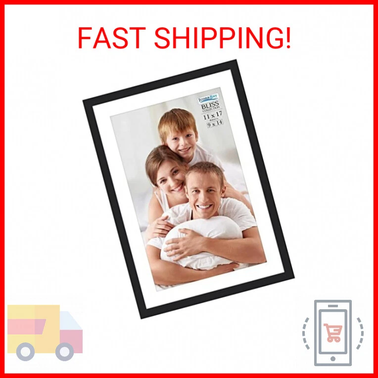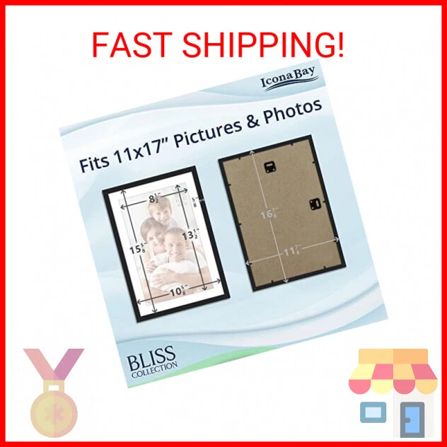 Icona Bay 11x17 Black Picture Frame Fits 16x10 Photos with Mat to 9x14 Image, Modern Style Wood Composite Poster Frame, Wall Mount Only, Bliss Collection - GREAT VALUE - This is the most economical frame on the market; You'll want to buy more than one to display family portraits or gift to loved ones - CUSTOM SIZE - Please be aware, the frame's outer measurements are 11 x 17 and the inner dimensions fit 10.5 x 16.5 inch photo, picture, or print; With the mat, the reveal is a 9 x 14 image; Product includes built-in sawtooth hooks to easily hang artworks or photographs - SIMPLE & CLEAN - The streamlined design and matte finish is functional and creates a cozy Scandinavian feel; Works well with any home or office modern décor - SAFE & LIGHTWEIGHT - This poster frame is made with composite wood and an ultra-clear plastic sheet cover that is shatter-proof to protect your photograph and prevent cuts from glass - SECURE PACKAGING - Rest assured that your picture frame will arrive safely thanks to Icona Bay's especially safe packaging The Fine Print Payments We accept the following payment methods Visa/Mastercard PayPal Apple Pay Google Pay Please pay as soon as possible after winning an auction, this will allow for quicker shipping times! Returns We accept returns . You can return unopened items in the original packaging within 30 days of your purchase with receipt or proof of purchase . If 30 days or more have passed since your purchase , we cannot offer you a refund or an exchange . Upon receipt of the returned item , we will fully examine it and notify you via email , within a reasonable period of time , whether you are entitled to a return . If you are entitled to a return , we will refund your purchase price, and a credit will automatically be applied to your original method of payment . Only regular priced items may be refunded . Sale items are non -refundable . Buyer is responsible for return shipping costs + a 20% restocking fee. Shipping Shipment processing time All orders are processed within 2-3 business days. Orders are not shipped or delivered on weekends or holidays. If we are experiencing a high volume of orders, shipments may be delayed by a few days. Please allow additional days in transit for delivery. If there will be a significant delay in shipment of your order, we will contact you via email or telephone. Shipping rates & delivery estimates Shipping charges for your order will be calculated and displayed at checkout.