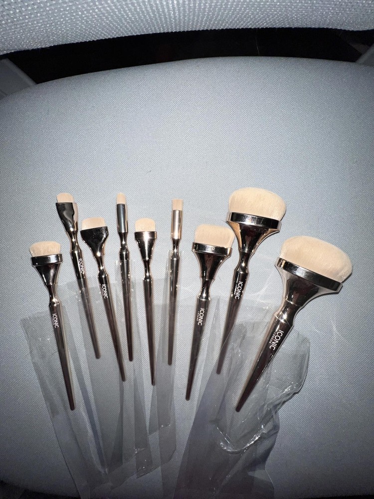 Brand new Iconic London Brush set featuring 9 gorgeous gold metallic brushes for face & eyes. All still in protective sleeves. Comes with a white Iconic London drawstring pouch for easy storage or travel.