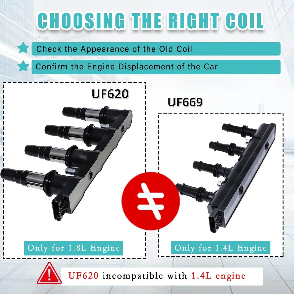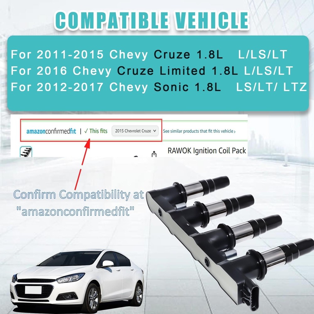 Ignition Coil Pack and 4 Iridium Spark Plugs Compatible with 2011-2015 Chevy Cruze 1.8L, 2016 Chevrolet Cruze Limited 1.8L, 2012-2017 Chevy Sonic 1.8L, Replace UF620 9091902247 C1646 4504 7092 Product Details Brand: RAWOK Core Material: Copper Thread Size: 0.551 inches Top Material Type: Nickel Vehicle Service Type: Car Brand: RAWOK Core Material: Copper Thread Size: 0.551 inches Top Material Type: Nickel Vehicle Service Type: Car Automotive Fit Type: Vehicle Specific Fit OEM Part Number: UF620 4702 Manufacturer: RAWOK Model: Coil Pack Spark Plugs Item Weight: 4.05 pounds Package Dimensions: 17.28 x 7.24 x 2.64 inches Item model number: UF620 Exterior: Machined Manufacturer Part Number: RA9409-4702 Date First Available: March 8, 2024 Compatible VehicleCompatible with 2011-2015 Chevrolet Cruze 1.8L, 2016 Cruze Limited 1.8L, 2012-2017 Chevy Sonic 1.8L. Only compatible with Chevrolet 1.8L engine Reliable Partner1PCS Ignition Coil UF620 and 4 PCS Iridium Spark Plugs 4504 : High ignition efficiency, more powerful arc. Part NumberUF-620, UF620, C1646, 5C1703, GN10234, 25186687, 55561655, 610-00180, 96476983, 4504 7092 OEM MadeMade according to OEM standards, each ignition coil undergoes extensive testing to ensure reliability, perfect replacement for OE parts, and easy to install. Replace with new coils to awaken the car's surging power