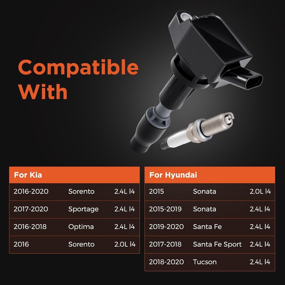 Free eBay listing template designed by dewiso.com Ignition Coil Pack and Iridium Spark Plugs Kit, UF764 93175, for Hyundai Sonata Santa Fe Sport Tucson 2015 2016 2017 2018 2019, for Kia Optima Rondo Sorento Sportage Stinger, for Genesis 2.0L 2.4L L4 FREE AND FAST SHIPPING! About this item 【RESTORE ENGINE POWER & IMPROVE EFFICIENCY】Worn ignition components can cause power loss and inefficient fuel burn. This ignition coil pack and iridium spark plug set helps deliver stronger, more consistent sparks for improved combustion—supporting smoother acceleration, reduced vibration, and better fuel efficiency in daily driving conditions 【REDUCE MISFIRE & UNSTABLE IDLE】Designed to help address common ignition-related issues such as engine shaking, hesitation, rough idle, or hard starts. This matched ignition coil and spark plug kit supports stable spark output and smoother engine operation from startup to highway driving 【IRIDIUM SPARK PLUGS & OE-GRADE COILS】Pre-gapped fine-wire iridium spark plugs are engineered to support efficient combustion and extended service life. Ignition coils feature heat-resistant materials and epoxy-sealed construction to deliver stable ignition energy and durability comparable to OE replacement parts 【DIRECT FIT OE REPLACEMENT & EASY INSTALL】Designed as a direct replacement for OE part numbers 27300-2GGA0、UF-764、UF764、273002GGA0、GN10730、C988、E1264、IC871、49138. Plug-and-play design requires no modification. Package includes 4 ignition coils and 4 iridium spark plugs, suitable for DIY installation with basic tools 【WIDE VEHICLE COMPATIBILITY – PLEASE CONFIRM FITMENT】Fit for Hyundai Sonata 2015–2019 2.0L / 2.4L, for Hyundai Santa Fe 2019–2020 2.4L, Santa Fe Sport 2017–2018 2.4L, for Tucson 2018–2020 2.4L; for Kia Optima 2016–2018 2.4L, for Kia Sportage 2017–2020 2.4L, for Kia Sorento 2016–2020 2.4L/2.0L. Please verify vehicle year, engine size, and Ebay fitment information before ordering Product We offer a 30-Day Return Policy on items which you are not completely satisfied with. You have the option for a full-refund or an exchange of the item. No returns are available on items shipped outside of the US . Shipping We offer Free Shipping to the US and ship within 2 business days of payment, usually sooner. We use UPS express shipping. That's why your products are usually delivered within 3 days . Contact We try our very best to make sure every customer is completely satisfied. If there's a problem , message us! We're happy to help. 24/7 live chat available.