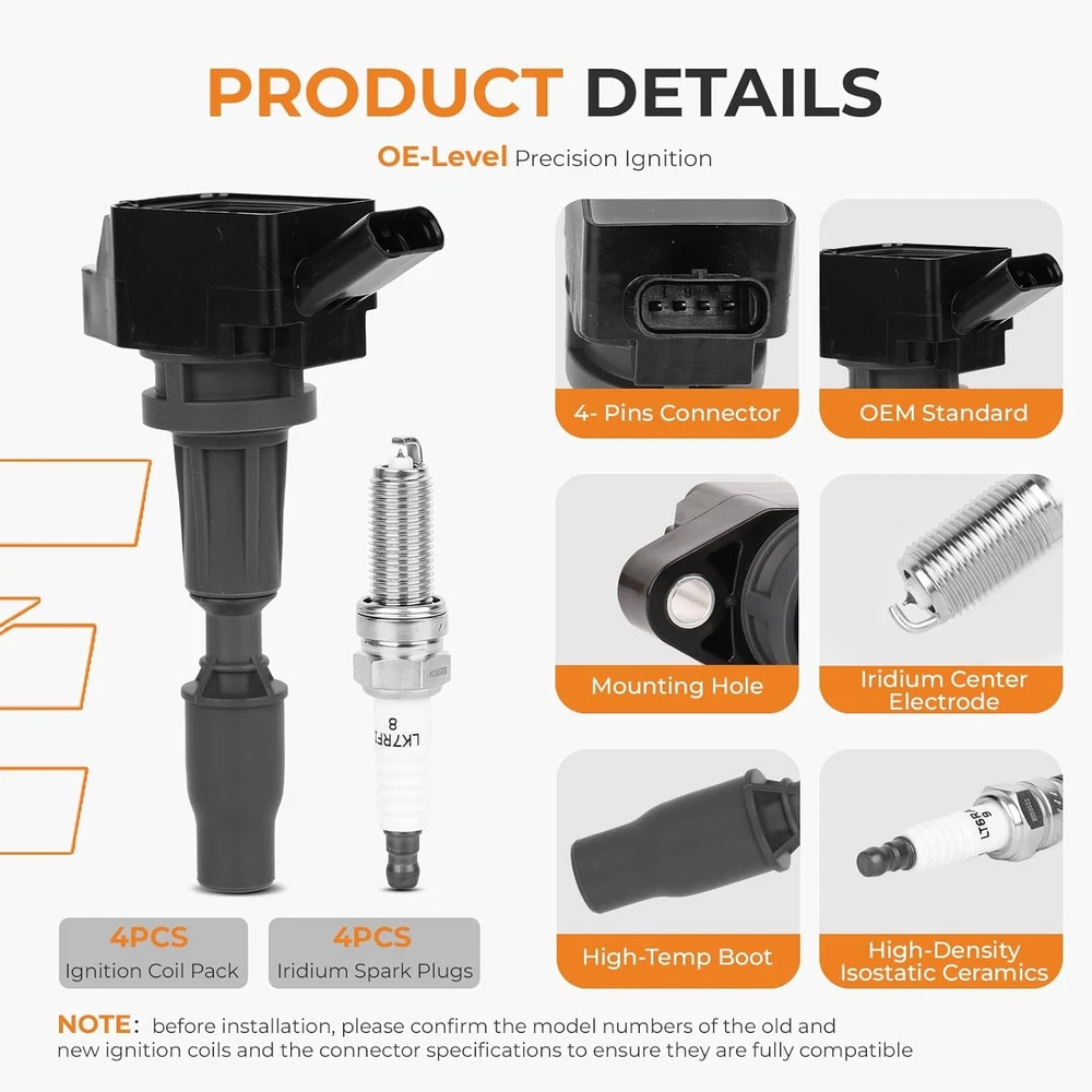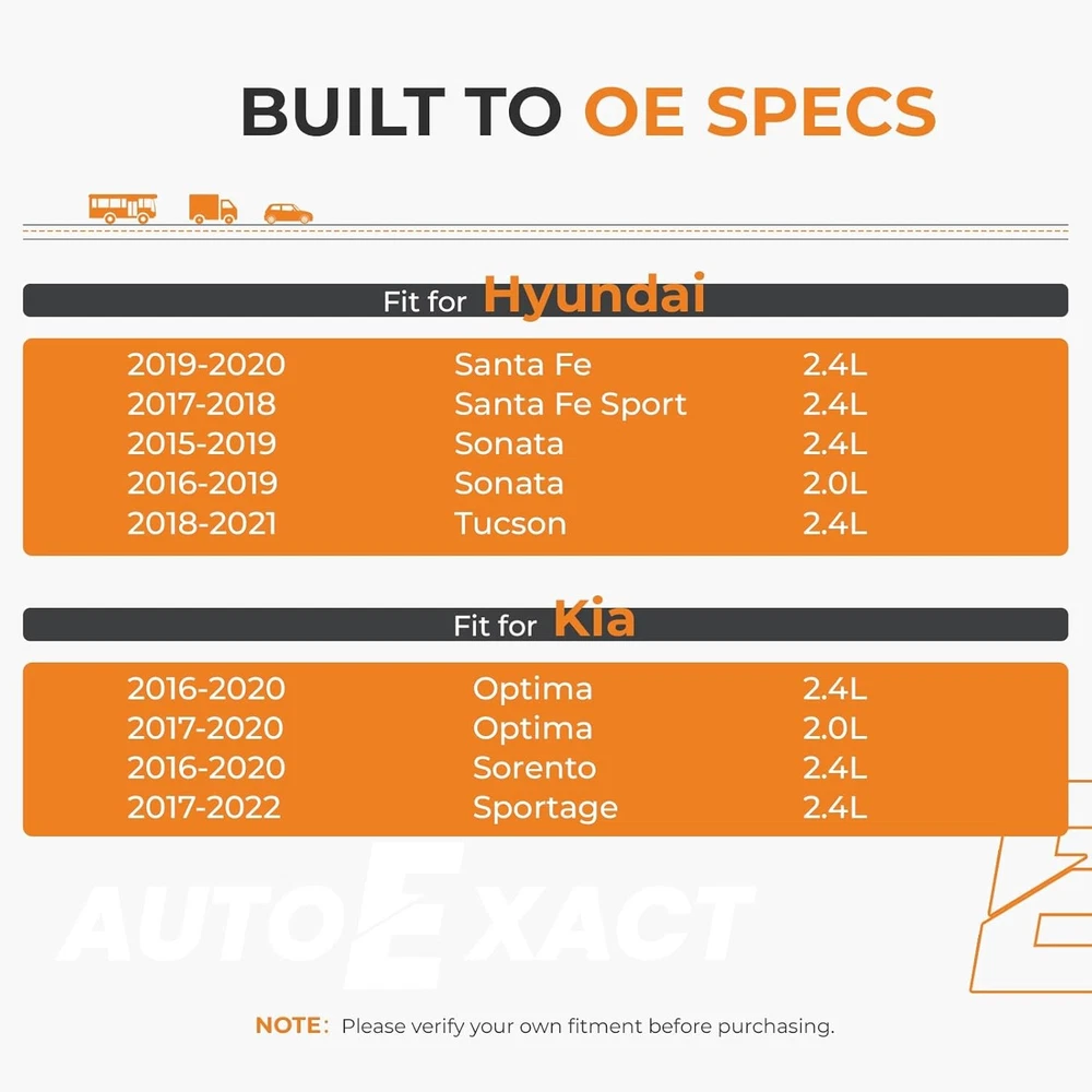 Free eBay listing template designed by dewiso.com Ignition Coil Packs and Iridium Spark Plugs Kit Fit for Hyundai 2015-2019 Sonata Santa Fe Tucson Kia 2017-2022 Sportage Optima Sorento 2.0L 2.4L L4, #UF764 93175 Set of 4 FREE AND FAST SHIPPING! About this item RESTORE PEAK PERFORMANCE & SAVE FUEL: Unlock horsepower, boost throttle response, cut gas costs. Worn ignition parts lose power and waste fuel. Autoexact high-performance coil & iridium plugs deliver stronger, stabler sparks for full combustion—smoother acceleration, less shaking, better fuel economy. ELIMINATE MISFIRE & ROUGH IDLE: Tired of shaking, check engine light (P0300-P0308 codes) or poor starting? Autoexact ignition coil and spark plug set fixes these issues, restoring smooth, quiet engine run. Enjoy reliable starts every time. PREMIUM IRIDIUM & OE-QUALITY: Pre-gapped fine-wire iridium spark plugs (up to 40,000 miles life) ensure full combustion for max power and fuel economy. Epoxy-potted, heat-resistant ignition coils deliver strong ignition energy and durability—better than standard OEM parts. DIRECT OE REPLACEMENT & EASY DIY: 100% OEM fit, no mods needed, plug-and-play. Made for your vehicle’s make, model & VIN. Package Contents: 4pcs Ignition Coils Packs, 4pcs Iridium Spark Plugs. Refer to the install guide on the product detail page, DIY with basic tools, save on dealership labor. COMPATIBILITY: 2015-2019 Hyundai Sonata 2.4L, 2017-2022 Kia Sportage 2.4L, 2016-2020 Kia Optima 2.4L, 2016-2020 Kia Sorento 2.4L, 2019-2020 Hyundai Santa Fe 2.4L, 2017-2018 Hyundai Santa Fe Sport 2.4L, 2018-2021 Hyundai Tucson 2.4L, 2016-2019 Hyundai Sonata 2.0L, 2017-2020 Kia 0ptima 2.0L OE & REPLACE NUMBER: UF764, GN10730, C988, C50007DL, 273002GGA0, NGK 97390, NGK 93175, NGK 95983, XP5702. Before purchasing, please confirm the vehicle fitment to avoid purchasing the wrong product. RIGOROUS TESTING & GUARANTEED: Each unit passes strict voltage and sealing tests. Backed by 2-year warranty & lifetime expert support. 100% guarantee for your satisfaction & engine health. Product We offer a 30-Day Return Policy on items which you are not completely satisfied with. You have the option for a full-refund or an exchange of the item. No returns are available on items shipped outside of the US . Shipping We offer Free Shipping to the US and ship within 2 business days of payment, usually sooner. We use UPS express shipping. That's why your products are usually delivered within 3 days . Contact We try our very best to make sure every customer is completely satisfied. If there's a problem , message us! We're happy to help. 24/7 live chat available.