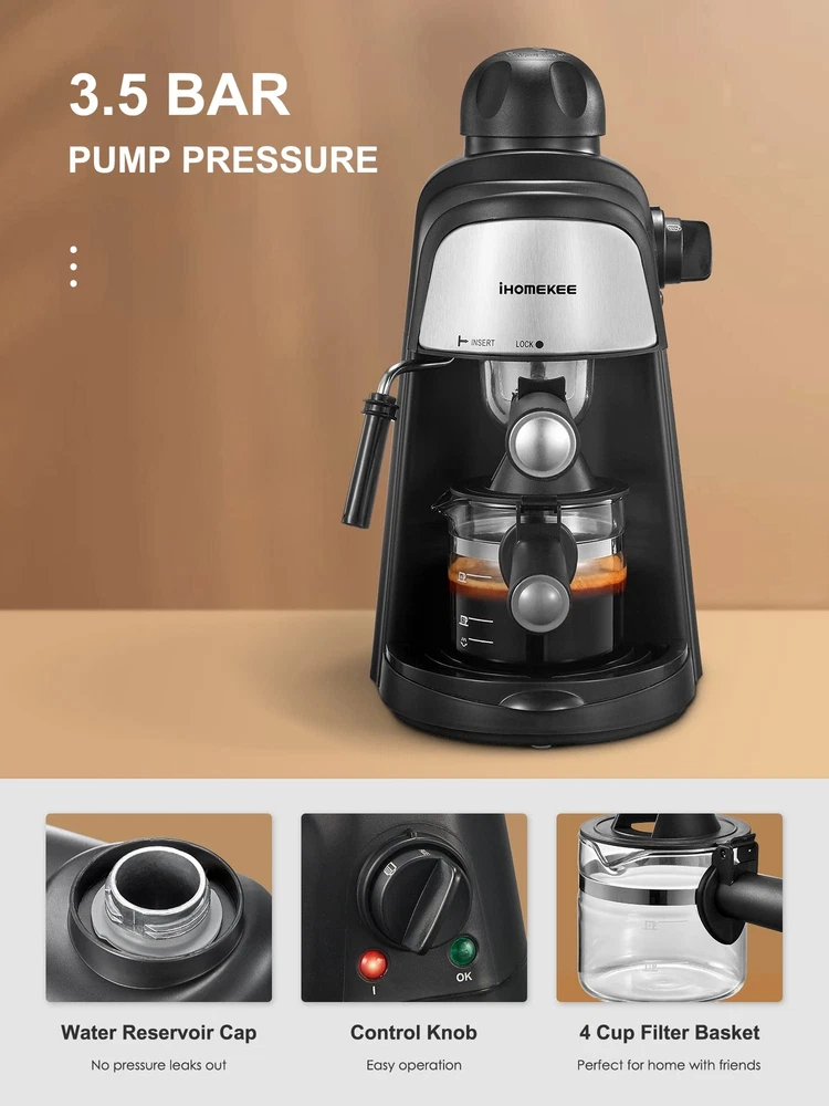 Ihomekee Espresso Machine, 3.5Bar Espresso and Cappuccino Machine with Fast Heating Function, 1-4 Cups Coffee Maker with Milk Frothing Function and Steam Wand (Black) FAST HEATING FUNCTION: The Ihomekee espresso machine comes with a fast heating in 90 second that provides the optimum extraction temperature for your coffee, while having spare hot water to brew your coffee when you need it, without waiting. EASY TO USE: Single switch knob with indicator light for easy operation, When the preheating is complete, the light off, for beginner without requiring much techniques and skills to make creamy cappuccino and latte art. BREW LIKE A PRO: Powerful 3.5 bar pressure espresso coffee maker can make 1-4 cups (240ml) espresso coffee and rich smooth cream. Even if you are a beginner, you can become a professional home barista with this machine. COMPACT DESIGN: The compact design of the espresso coffee machines saves lots of space, smaller and lighter. Dimensions are 13.3" high x 10.6" wide x 7.4" deep, weight only 4.7 pounds, best for home and kitchen use. TIPS: When installing filter holder, its handle must be aligned at lock position to ensure it’s locked tight. To ensure maximum flavor, Please use medium-coarse coffee ground.If you have any questions, please feel free to contact us and we will reply within 12 hours. IHOMEKEE Espresso Coffee Maker Shipping We offer FREE shipping on all orders! We use a selection of shipping services such as UPS, FedEx, USPS etc. We only ship to the lower 48 states, no APO/FPO addresses or PO Boxes allowed. Local pickups and combined shipping options are not provided at this time. Return You can return a product for up to 30 days from the date you purchased it. Any product you return must be in the same condition you received it and in the original packaging. Please keep the receipt. Payment We accept payment by any of the following methods: PayPal Please pay as soon as possible after winning an auction, as that will allow us to post your item to you sooner! Feedback Customer satisfaction is very important to us. If you have any problem with your order, please contact us and we will do our best to make you satisfied. Contact Us If you have any queries, please contact us via ebay. We usually respond within 24 hours on weekdays. Please visit our eBay store to check out other items for sale! Thank you for shopping at our store.