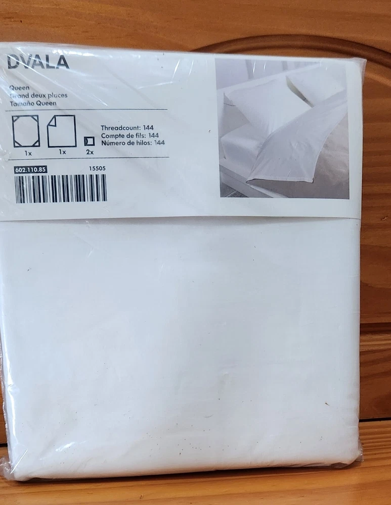 Ikea Dvala Sheet Set- Queen Size 1 flat sheet 1 Fitted Sheet 2 Pillow Cases Whte solid for 60x80 mattress and 20x30 pillows New, sealed