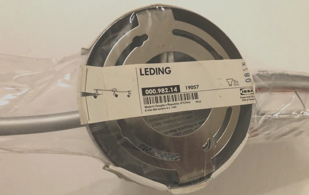 Product Line:Ledinggtin13:Does not applyCountry/Region of Manufacture:ChinaPower Source:HardwiredColor:SilverItem Width:5 1/8" across mounting plateFeatures:3-LightMPN:19057Lighting Technology:HalogenItem Length:28"Model:000.982.14Sensor Type:LightType:Track LightingRoom:Kitchen/Bathroom/Living room/OfficeMaterial:Stainless SteelStyle:ModernUPC:Does not applyLight Direction:Downwards, IndirectInstallation Area:IndoorItem Height:5" with pin spots not extendedShade Shape:ConeManufacturer:IkeaBrand:IKEANumber of Lights:3Manufacturer Warranty:NA