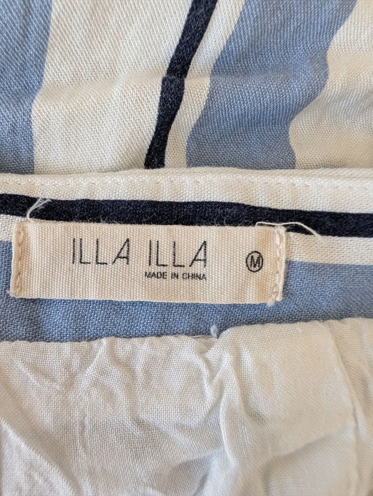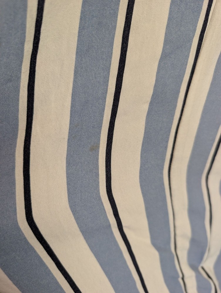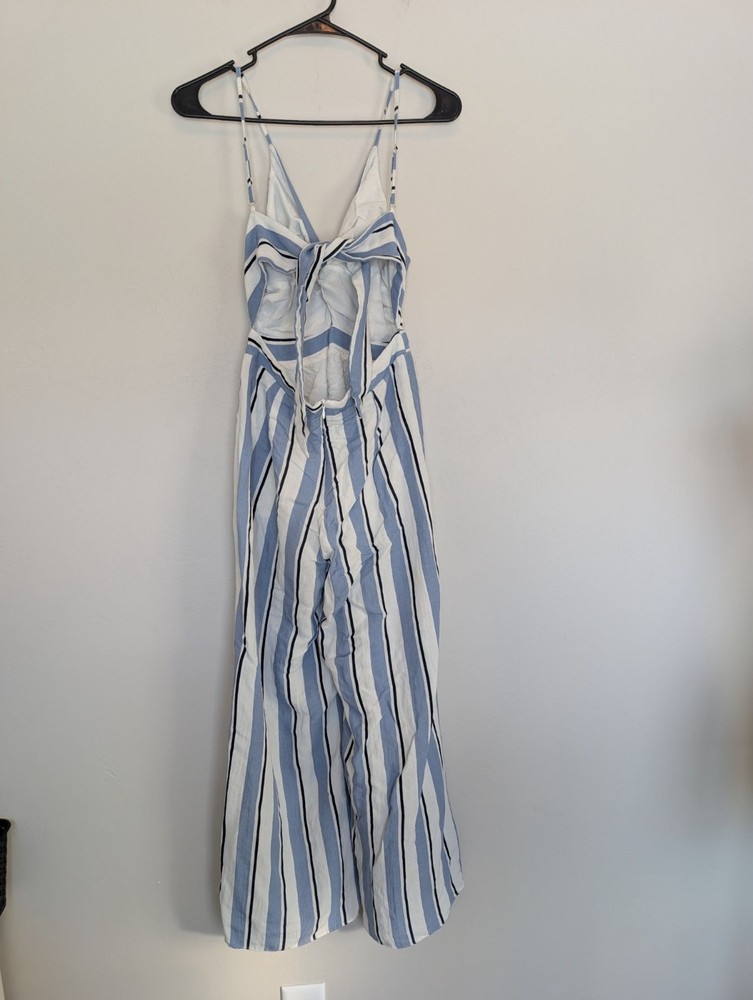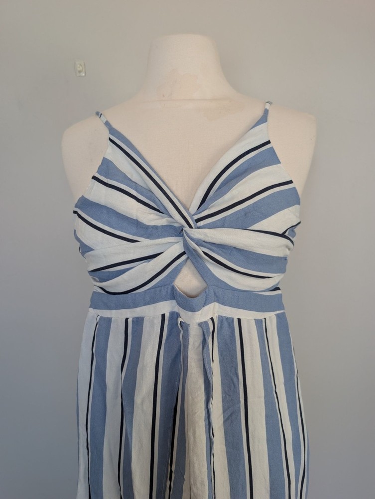 A sophisticated jumpsuit featuring an elegant twist-front design and relaxed wide-leg silhouette in soft blue and white vertical stripes. Versatile piece transitions seamlessly from daytime casual to evening sophistication. • Spaghetti strap design • Twist front bodice detail • Wide leg cut • Lightweight rayon fabric • Side cutout details Small faint spot on fabric near bottom of garment Measurements taken with garment laying flat Measurements are approximate: Armpit to Armpit: 15" Inseam: 25“ 9-0596 13oz