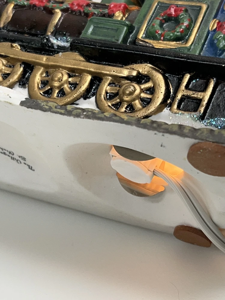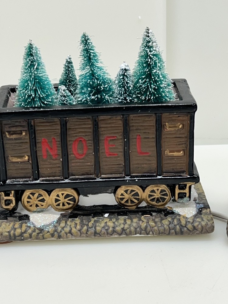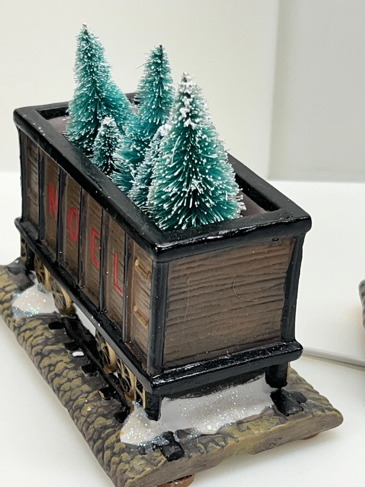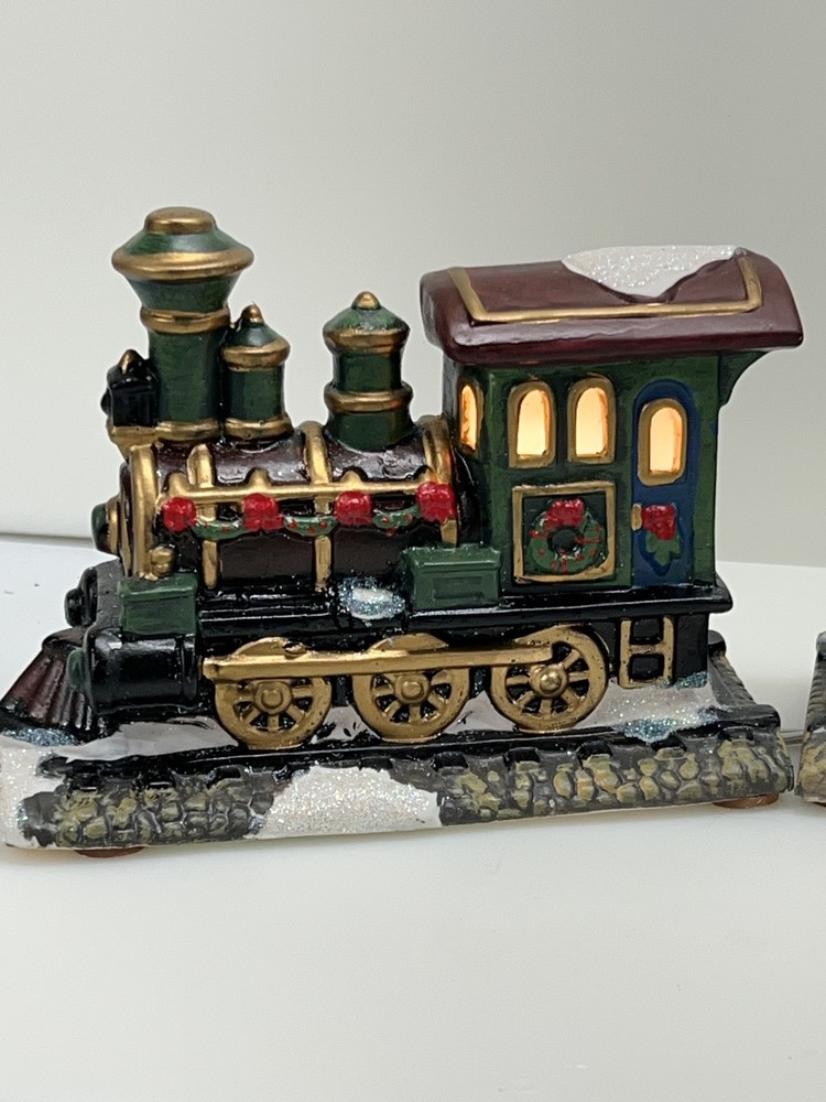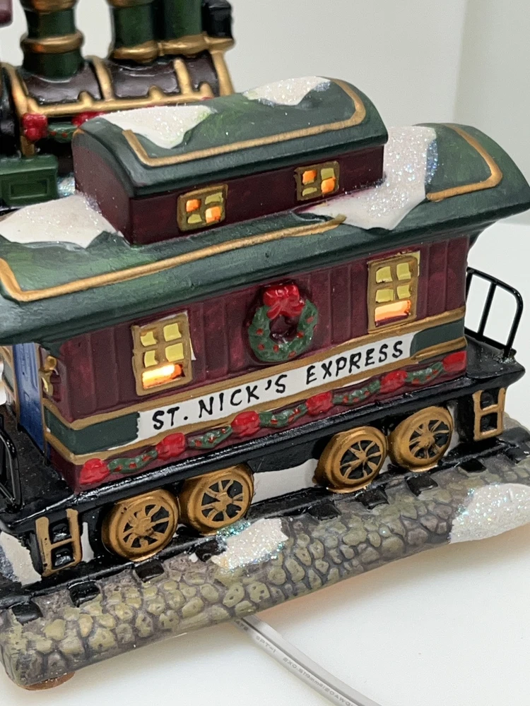 Saint Nicholas Square 3 Piece "Train Set" is a medium-sized, hand-painted ceramic and porcelain Christmas village display item from 2008. This whimsical train set features an asymmetrical design with a multicolor finish and measures 18" in length, 5" in height, and 3" in width. It is illuminated with a cord and comes boxed as part of the St. Nicholas Square Village Collection, suitable for any room decor during the holiday season. Absolutely perfect pristine condition! Comes with all clean original packaging including cord & lights