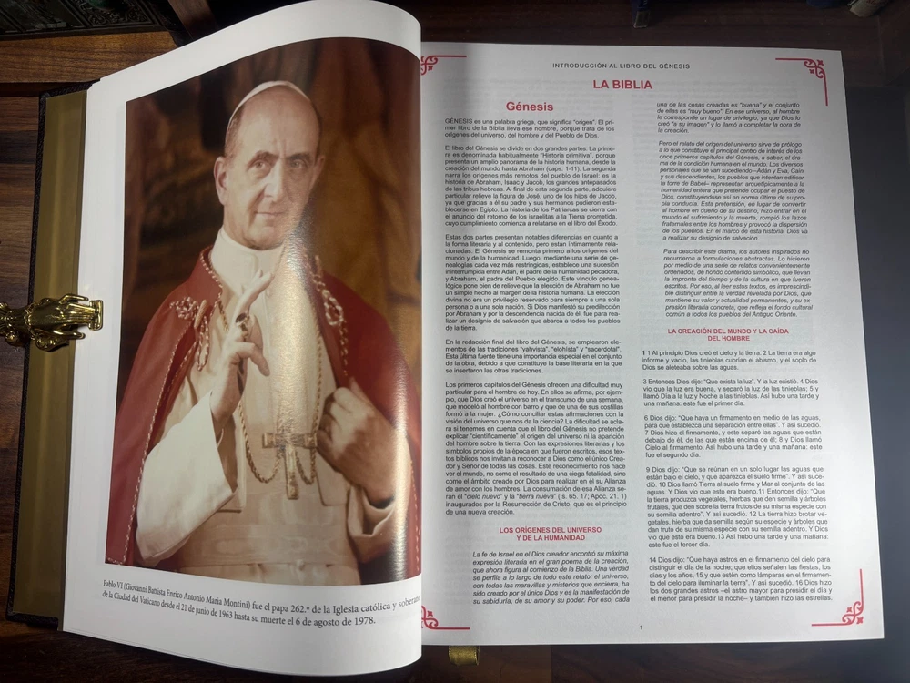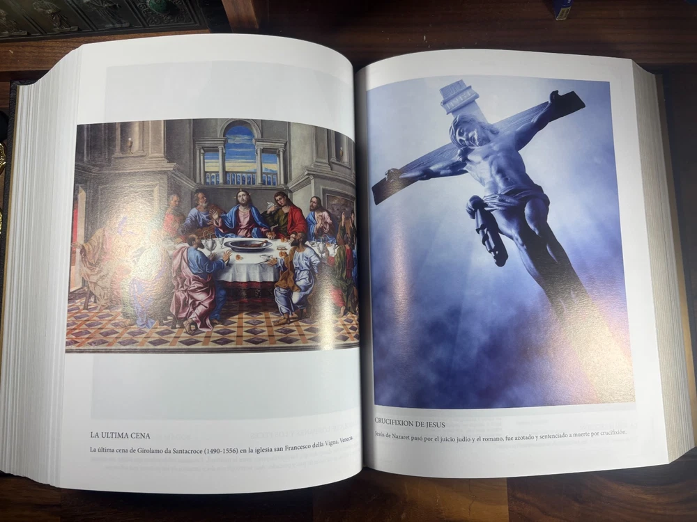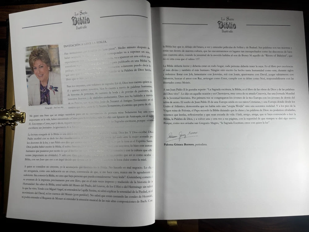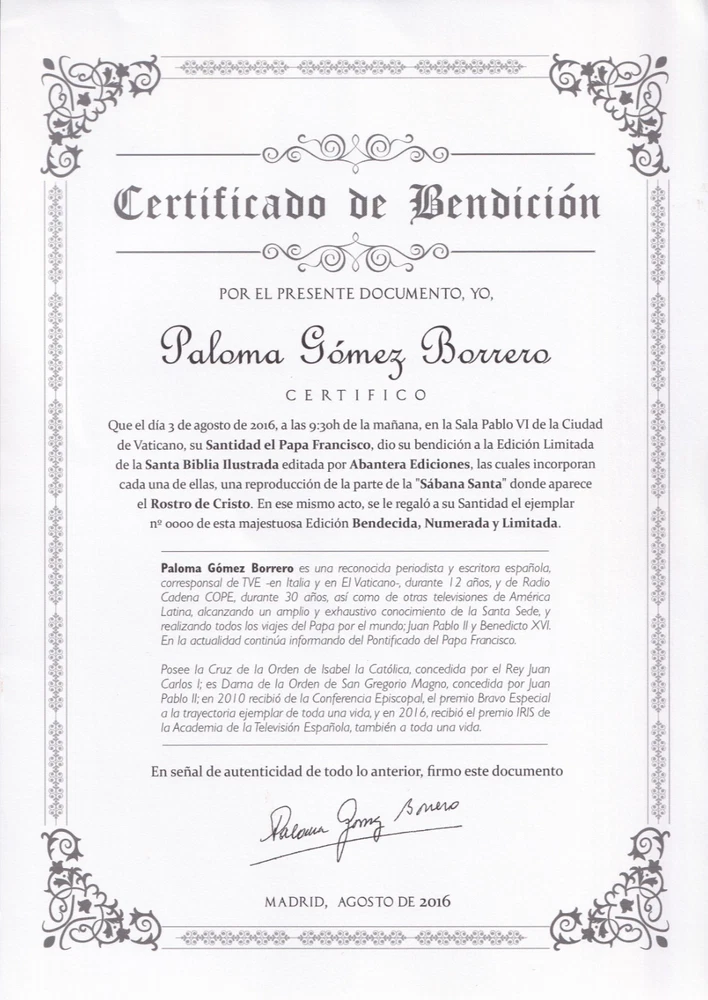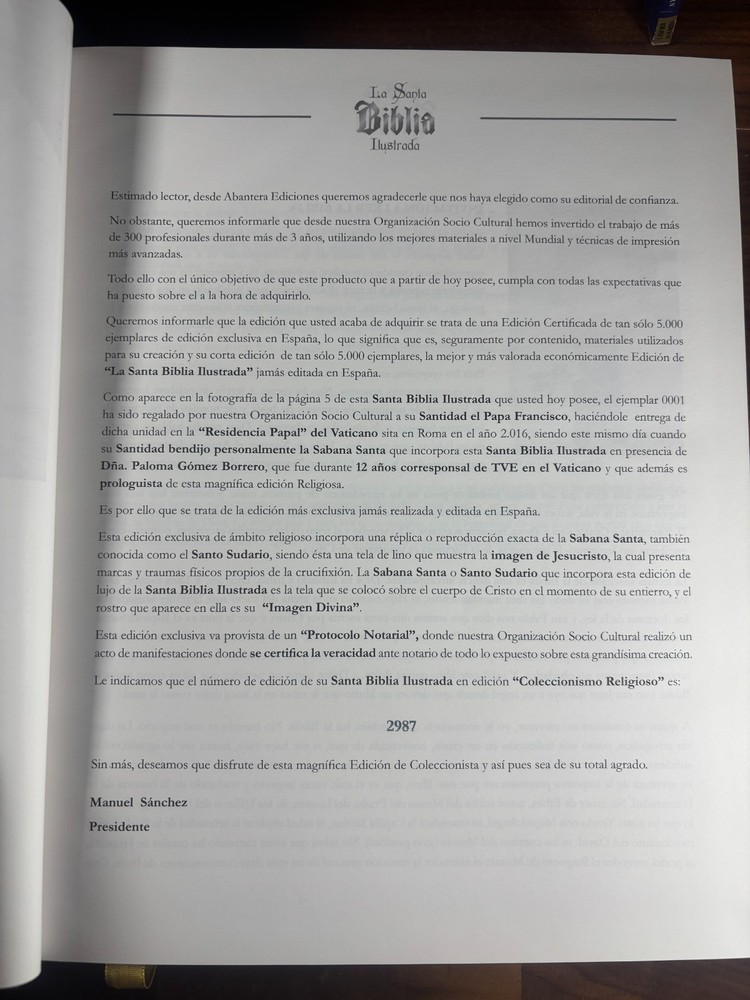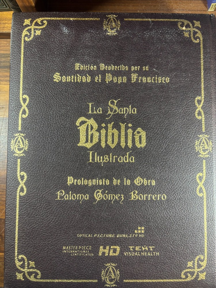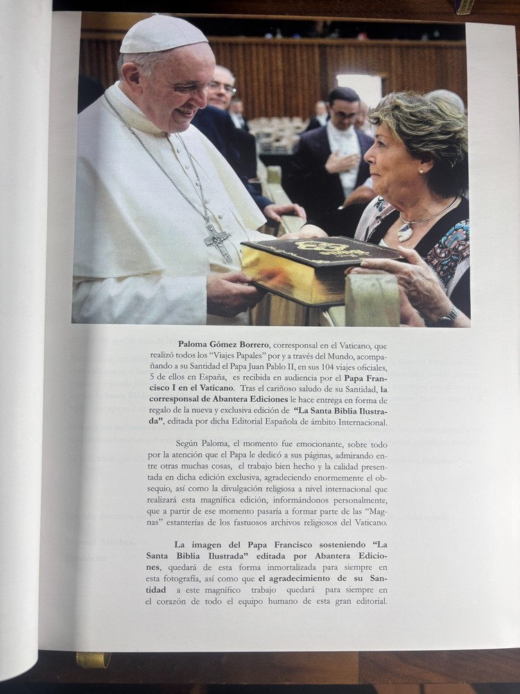 Bible Details: Title: La Santa Biblia Ilustrada (The Illustrated Holy Bible) Publisher: Abantera Ediciones (Madrid, Spain) Publication Year: 2016 ISBN: 978-84-16727-13-1 / 8416727139 Pages: 1,168, richly illustrated Language: Spanish Edition: Limited and numbered (this copy is No. 2987 ) Blessing: This edition was blessed by His Holiness Pope Francis (Please refer to above photo) Prologue: by Paloma Gómez Borrero, celebrated Spanish journalist Features: Luxurious hardcover binding Gilt-edged pages High-quality illustrations and presentation Numbered limited edition (only 5,000 copies produced) Collectible Catholic edition with papal blessing Included with this Bible: An envelope containing the following certificates. One certificate stating that Pope Francis gave his blessing for the printing of this bible edition. Another certificate states that this is indeed one of the numbered 5000, limited edition prints. A notary booklet, reconfirming that this bible is one of the numbered prints. General History In 2016, Abantera Ediciones of Madrid produced a deluxe, large-format edition of the Holy Bible , richly illustrated and designed as both a work of devotion and art. Only 5,000 numbered copies were printed, each blessed by Pope Francis , marking this series as spiritually significant. This edition was released with a prologue by Paloma Gómez Borrero , one of Spain’s most respected journalists and Vatican correspondents, further rooting it in a context of Catholic faith and cultural importance. Why You May Want This Edition Spiritual Value: Blessed by Pope Francis, this Bible carries special meaning for Catholics worldwide. (See photo of Francis' blessing) Collectability: As a limited, numbered edition , it is rare and sought after by collectors of religious texts. Aesthetic Appeal: The deluxe binding, gilt pages, and rich illustrations make it a beautiful display piece as well as a text for study and devotion. Cultural Significance: With its connection to the Vatican and Spanish Catholic tradition, this edition is both a historical and devotional treasure. Condition: Near mint condition Small scratch on the spine Small amount of indents/scratches on gilting. very slight wearing on the edge of the cover. Dimensions: Weight - 3.8KG Height - 31cm Width - 24cm Thickness - 7.5cm