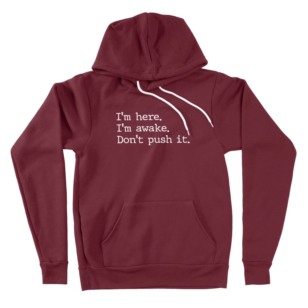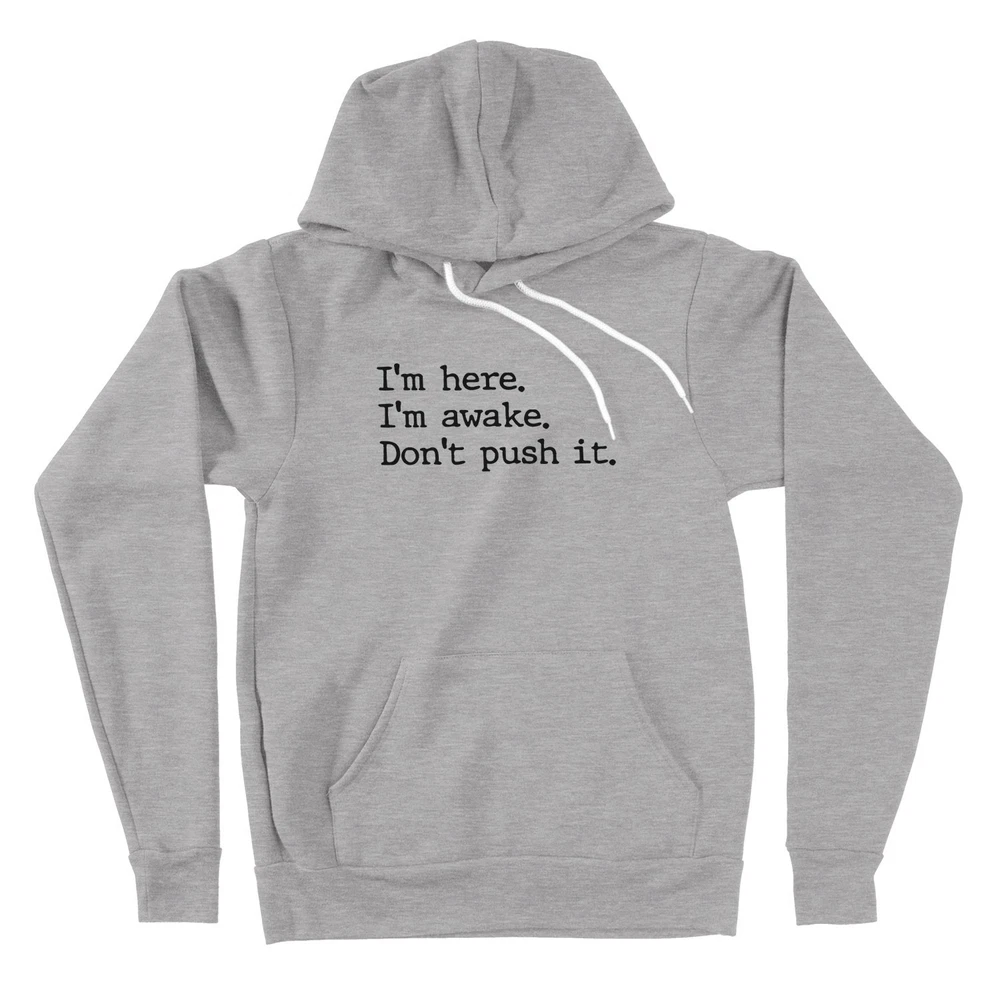 The "I'm Here I'm Awake Don't Push It Hoodie Sweater" is a fun and sarcastic gamer sweatshirt perfect for casual wear or special occasions like birthdays, Thanksgiving, or Christmas. Made of a comfortable blend of polyester and cotton, this hoodie features a solid pattern with a hooded closure and long sleeves. The hoodie also has accents like hooded design and pockets, making it both stylish and practical for the fall, winter, and spring seasons. Easy to care for with machine washable fabric, this hoodie is a great gift for friends who love a bit of humor and sarcasm in their wardrobe.