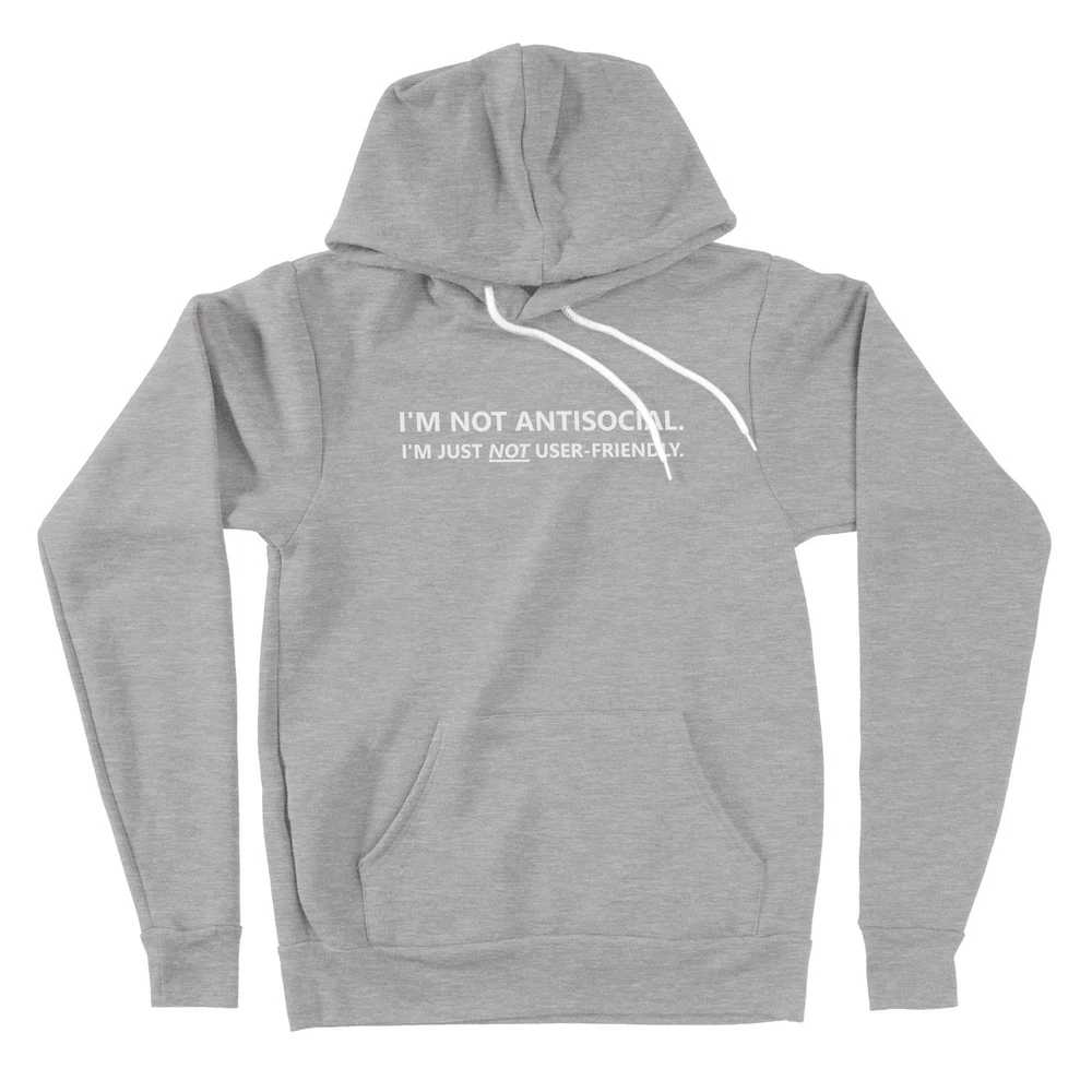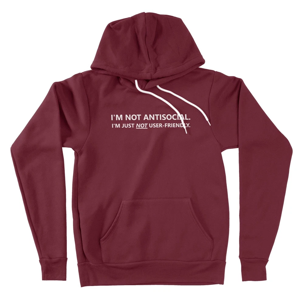 This "I'm Not Antisocial Im Just Not User-Friendly" Hoodie Sweater is a perfect blend of humor and sarcasm, making it a great gift for friends who may be introverted or anti-social. The long sleeve, hooded design is ideal for casual occasions like birthdays, Thanksgiving, or Christmas. Made from a comfortable blend of polyester and cotton, this hoodie features a solid pattern with a graphic print that captures the fun and quirky personality of the wearer. With its regular fit and fleece fabric, this hoodie is perfect for the winter, fall, and spring seasons. Add a touch of geeky humor and love to your wardrobe with this unique and funny hoodie.