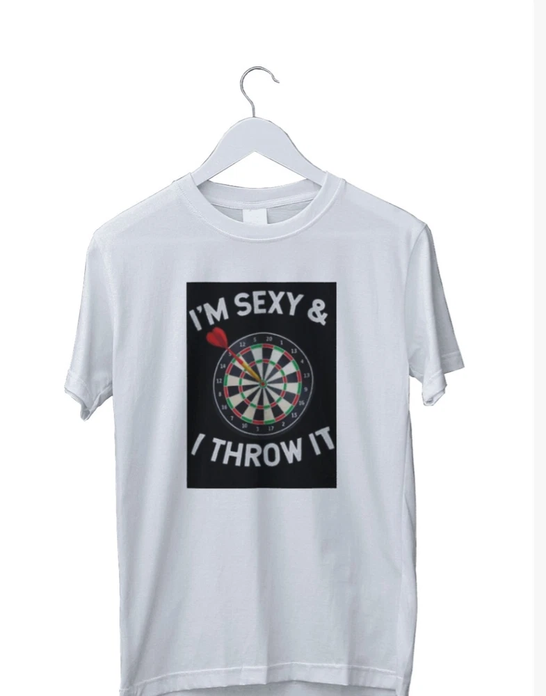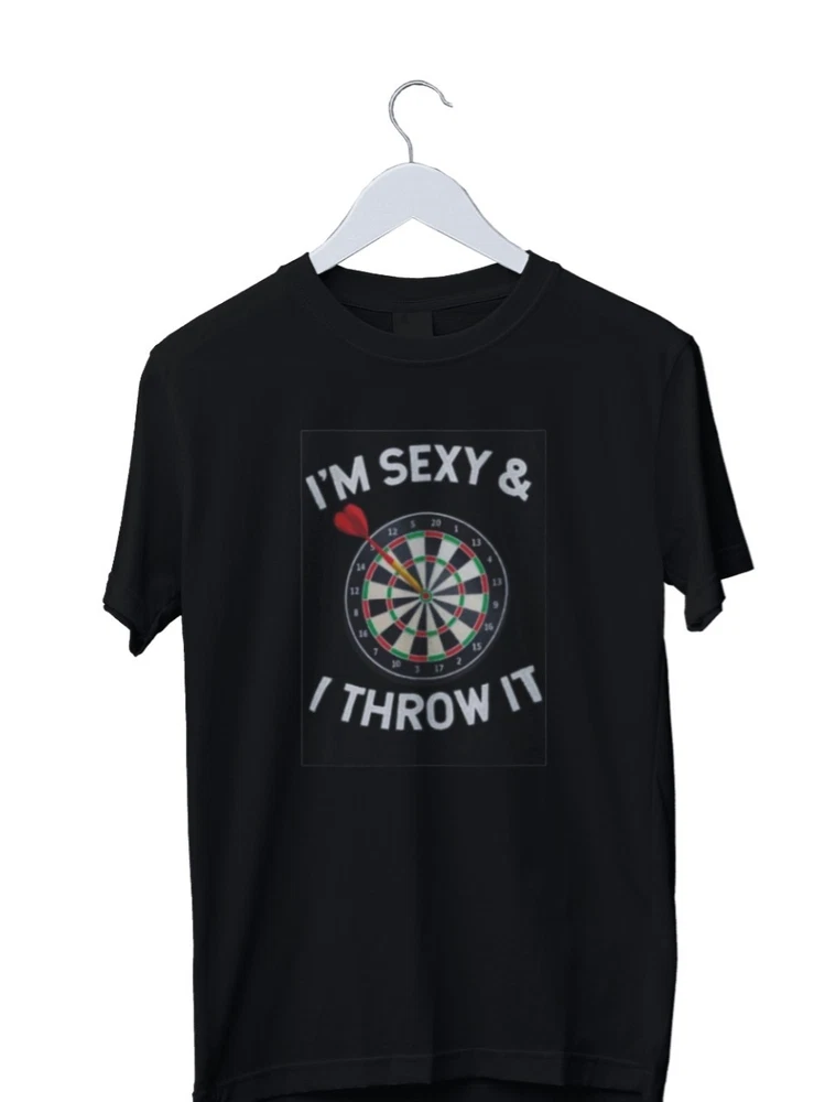 This men's T-shirt features a graphic print design with the character Eddie from "I'm Sexy & I Throw It Darts." The short sleeve shirt is made from 100% cotton jersey fabric and has a classic fit with a crew neck. Machine washable and suitable for all seasons, this limited edition shirt is perfect for fans of the movie or anyone looking for a funny and unique addition to their wardrobe. With a logo accent and a British brand, this T-shirt is a must-have for those who appreciate a quirky sense of style.