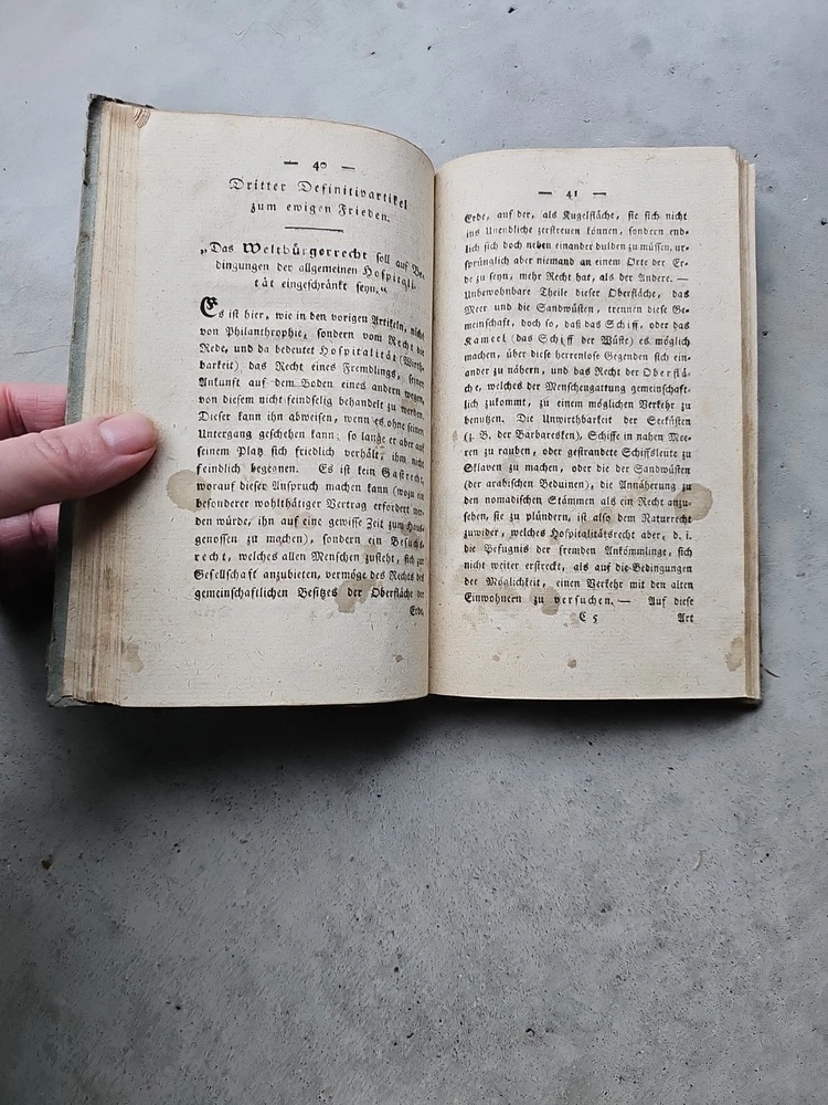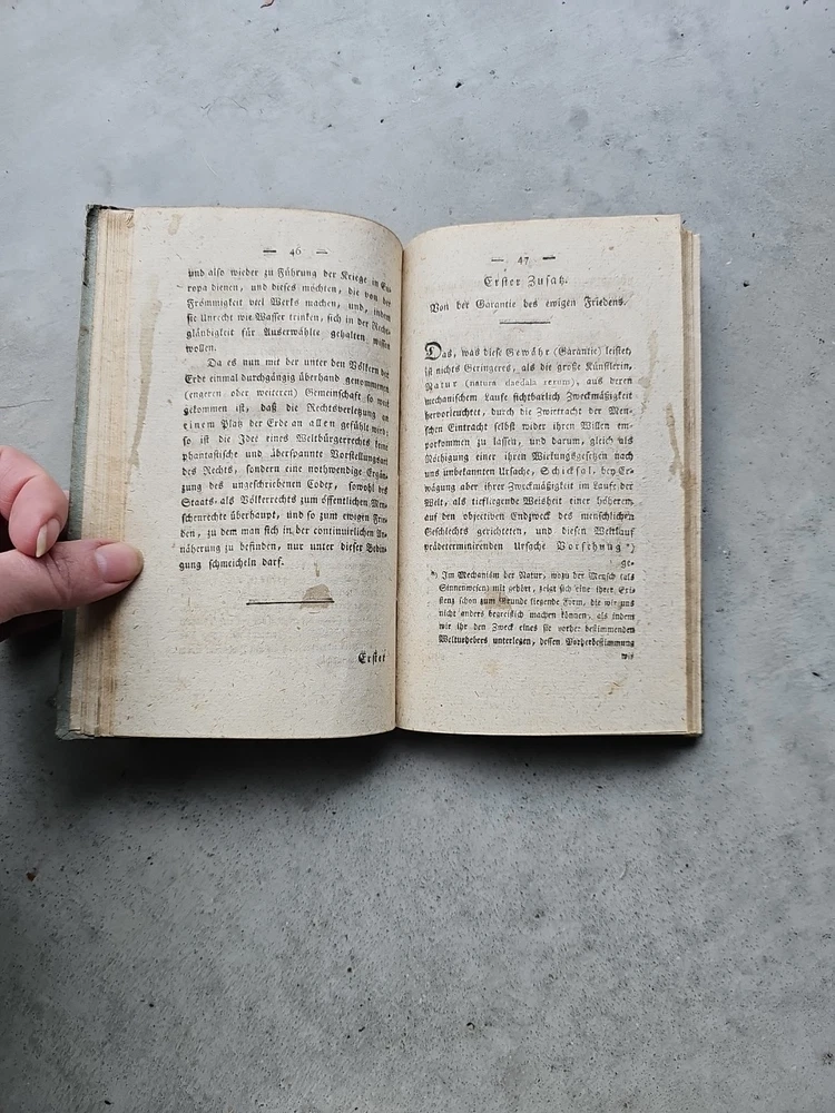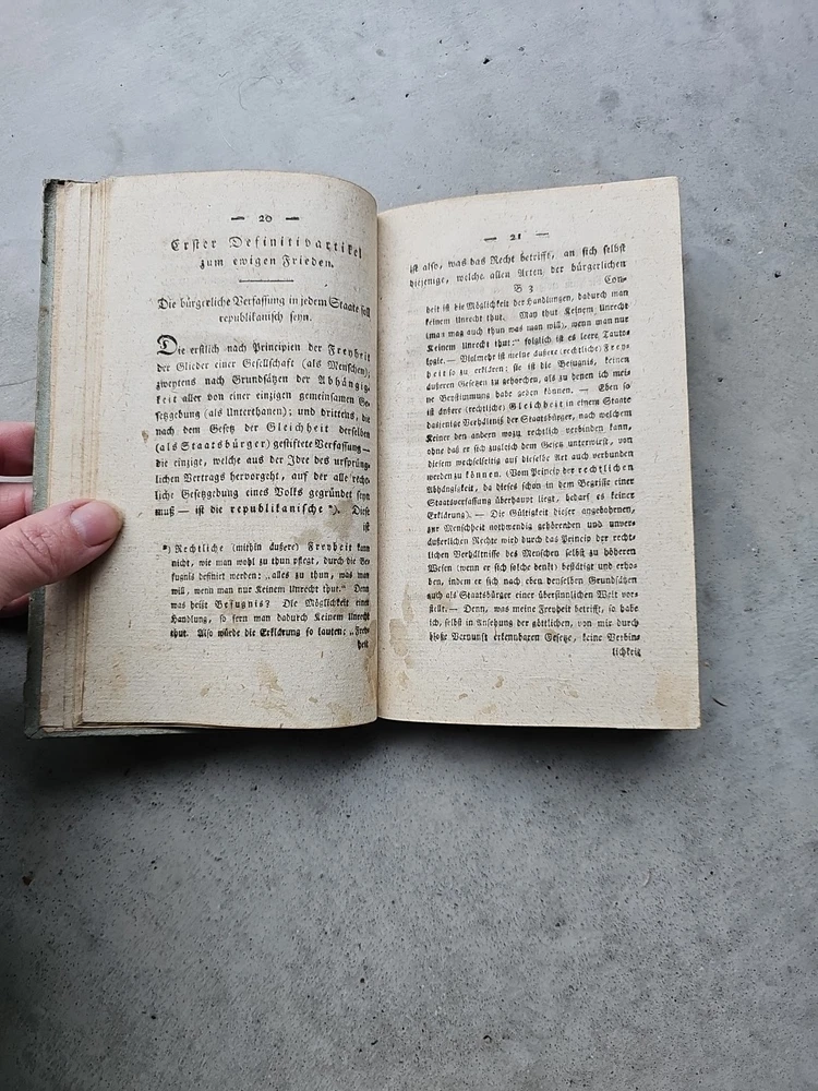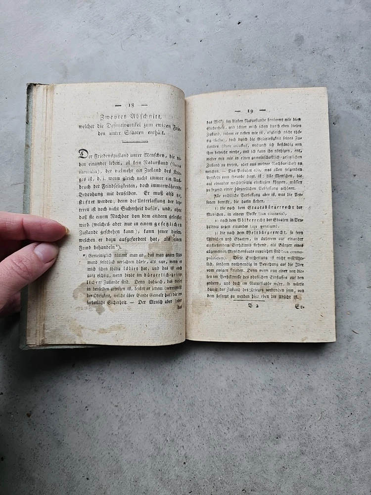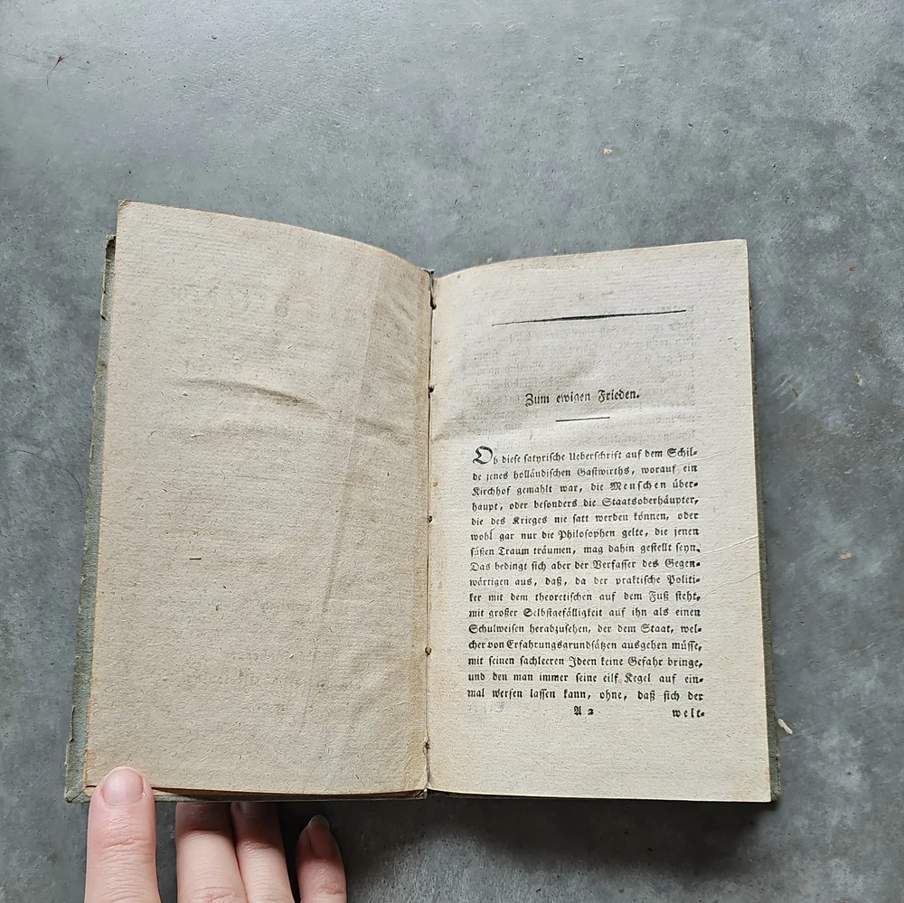 Zum ewigen Frieden. Ein philosophischer Entwurf. Königsberg, F. Nicolovius 1796. It has now been pointed out to me that it is a second edition and I spotted some staining on a dozen pages the first part of the book. Updated listing, images & price to reflect this. This is a true antique with associated signs of wear. Tiny creases in the top corner of a few pages. Unfortunately, it's rebound in a 20th century cover. The images are of the actual book being sent, please refer to them for condition. If you need any more photos or have any questions, please message me. Please note: I ship internationally via eBay's Global Shipping Programme only. I cannot make exceptions.
