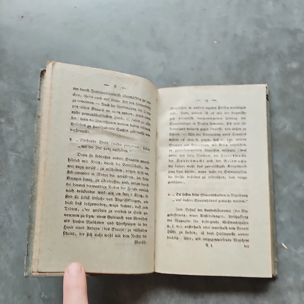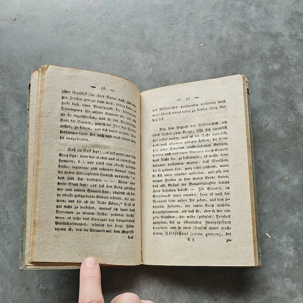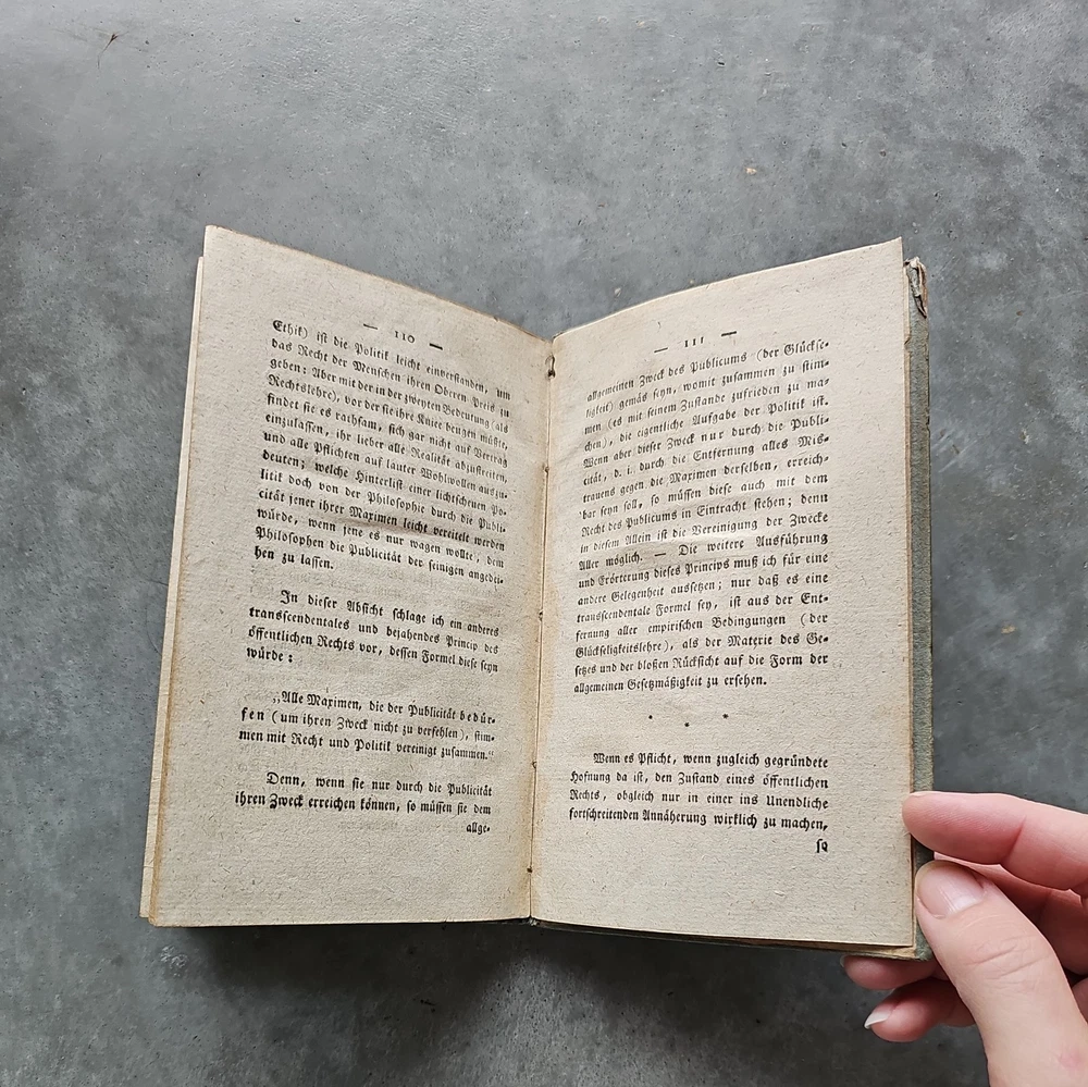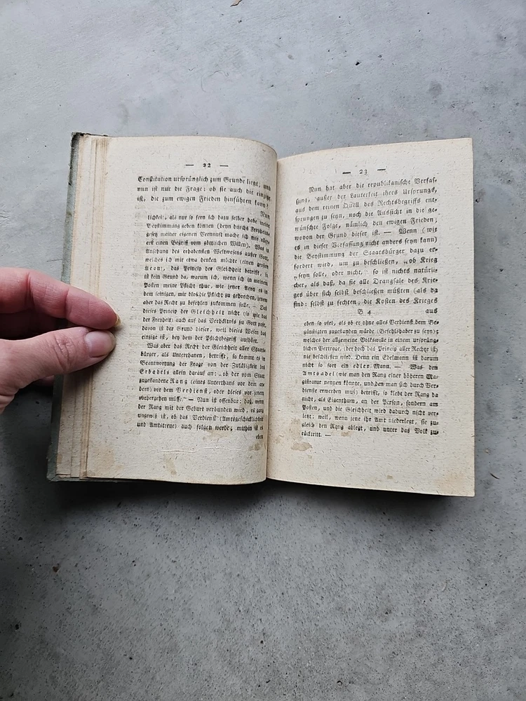 Zum ewigen Frieden. Ein philosophischer Entwurf. Königsberg, F. Nicolovius 1796. It has now been pointed out to me that it is a second edition and I spotted some staining on a dozen pages the first part of the book. Updated listing, images & price to reflect this. This is a true antique with associated signs of wear. Tiny creases in the top corner of a few pages. Unfortunately, it's rebound in a 20th century cover. The images are of the actual book being sent, please refer to them for condition. If you need any more photos or have any questions, please message me. Please note: I ship internationally via eBay's Global Shipping Programme only. I cannot make exceptions.