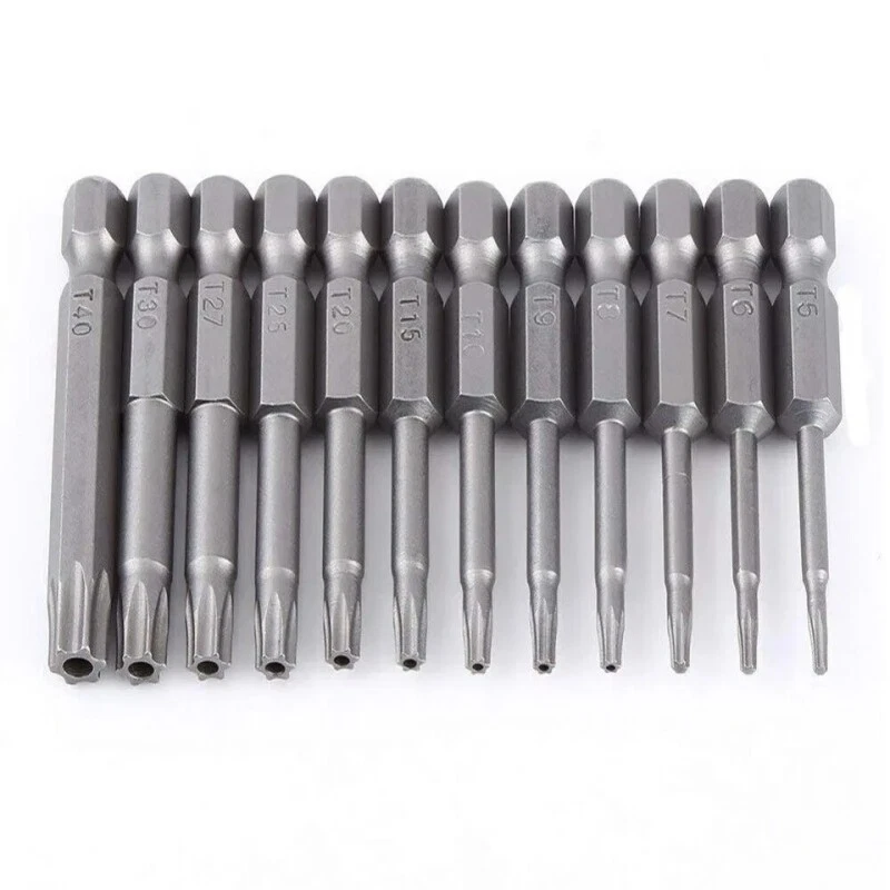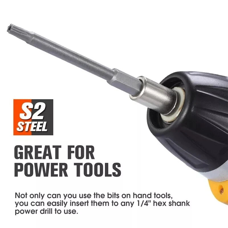 Product D escription 12PCS Torx Screwdriver Bit S et 50mm Product Characteristics High Q uality I ndustrial G rade M aterials: The Torx screwdriver bit set is made of high-quality S2 alloy steel with a special heat treatment process to increase the torque and full hardness of the bit, and it has good wear resistance and is more durable than regular Torx screwdriver bits. High P recision M achining T echnology: The product adopts CNC precision machining technology to ensure the accuracy of the product, so that the drill can withstand the instantaneous impact of large torque pneumatic tools, which greatly improves the service life of the product itself. Magnetic: The magnetic Torx screwdriver drill set can quickly and easily adsorb screws, greatly improving your work efficiency. Repeated use does not diminish the magnetic force. Suitable F or A V ariety O f P ower T ools: The 1/4" hexagon handle allows it to accommodate a wide range of power tools, allowing you to quickly change chucks. Suitable for electric drill, air drill, electric screwdriver, manual screwdriver and so on. A W ide R ange O f U se S cenarios: It can be widely used in automobile, home, industrial and other maintenance, and can also be used in other screw drives. Mechanical P rinciple D esign: Strong torque, high torque, after contact with the screw head, the impact reaction force generated by the impact screwdriver is absorbed by the torque part, effectively preventing the damage of the tool head. Straight and concentric, tight bite. Product Specification Status: 100% Brand New Material: S2 A lloy S teel Quantity: 12PCS Shank T ype: 6.35mm/ 1/4" H ex S hank Length: 1.97"/50mm Tool H ead S pecifications: T5, T6, T7, T8, T9, T10, T15, T20, T25, T27, T30, T40 Package Included 12 PCS × 50mm Torx Screwdriver B it Attention P lease 1. Please allow manual measurement error of 1-5mm. Make sure you don't mind before you buy. 2. Due to lighting effects, brightness contrast Settings of the display, etc., there may be some slight differences in the hue of the picture and the actual item, please make sure you don't mind.