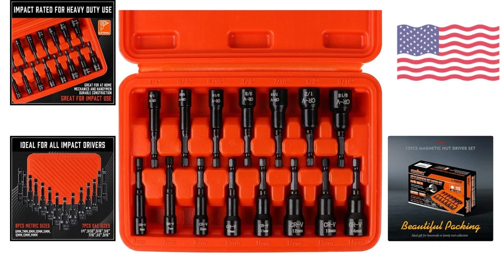 Impact Nut Driver Set - 15-Piece - Chrome Vanadium Steel - 1/4" Hex Shank ‹ › ‹ › ‹ › ‹ › ‹ › ‹ › ‹ › ‹ › ‹ › ‹ › Impact Nut Driver Set - 15-Piece -Chrome Vanadium Steel -1/4" Hex Shank Features: Made of industrial grade chromium vanadium steel for strength and durability. Black phosphate coating for corrosion resistance. Can be used with an impact/drill bit driver or an inner hexagonal ratchet. Firmly grasps hexagonal nuts and fasteners for easy installation or loosening/removal. Includes 8 metric sizes and 7 SAE sizes. Leaflet design head fastener with rounded edges prevents peeling and extends life. Designed for easy and efficient use. Perfect for both professional and DIY projects. Benefits: Strong and durable construction Corrosion resistant for long-lasting use Compatible with various tools for versatility Easy installation and loosening/removal of nuts and fasteners Wide range of sizes for different applications Prevents peeling and extends the life of fasteners Efficient and time-saving Suitable for professional and DIY projects Why choose our Impact Nut Driver Set? Don't settle for subpar nut drivers that can't withstand the demands of your projects. Our Impact Nut Driver Set is made of industrial grade chromium vanadium steel, ensuring strength and durability. With a corrosion-resistant black phosphate coating, these nut drivers are built to last. Whether you're using an impact/drill bit driver or an inner hexagonal ratchet, our nut setters will firmly grasp hexagonal nuts and fasteners for easy installation or loosening/removal. With a wide range of metric and SAE sizes, you'll have the right tool for any job. The leaflet design head fastener with rounded edges prevents peeling and extends the life of your fasteners. Designed for easy and efficient use, our Impact Nut Driver Set is perfect for both professional and DIY projects. Upgrade your tool collection with our high-quality Impact Nut Driver Set - order now and experience the difference! Shipping Free & Fast Shipping - We offer free shipping to most of the USA with a normal delivery time of 3-7 days. However, due to the current situation, additional delivery time (up to 3 weeks) may be required for some items. Alternative Carriers - We may use alternative carriers (e.g. USPS, FedEx, UPS, etc.) to ensure your package arrives safely and on time. Due to the use of multiple carriers, we are unable to provide a tracking number automatically. Handling Time - Orders are processed and shipped within 1-2 business days of receiving cleared payment. Shipping Restrictions - Shipping to Alaska, Hawaii, Puerto Rico, Guam, and other US territories may incur shipping charges or delivery restrictions. Please contact us before ordering, or your order can be refunded/cancelled. State Restrictions - There may be restrictions based on your state of purchase. For example, certain items may not be shipped to California due to state regulations. Contact for Tracking Updates - If you require tracking updates or have any concerns about the delivery of your order, please feel free to contact us, and we will be happy to assist you. Return 30-Day Hassle-Free Returns - We want you to be completely satisfied with your purchase. If you are not, you can return the item within 30 days of receiving it for a full refund or exchange. Easy Return Process - To start a return, simply contact us and we will provide you with a prepaid return shipping label and detailed instructions. Restocking Fee - There are no restocking fees for returns. However, the buyer is responsible for return shipping costs if the return is not due to a seller's error. Refund Processing Time - Refunds will be processed within 5 business days of receiving the returned item in its original condition. Payment We accept all major credit cards, PayPal, and Apple Pay for your convenience. Your payment information is secure and encrypted to ensure a safe and seamless transaction. Please complete your payment within 3 days of purchase to avoid any delays in shipping. Feedback Your feedback is extremely important to us. We strive to provide the best products and customer service possible. If you are satisfied with your purchase, please take a moment to leave us a positive review. If you have any concerns or issues with your order, please contact us before leaving negative feedback. We are committed to resolving any problems and ensuring your satisfaction. Contact Us If you have any questions or concerns, please feel free to reach out to our customer support team. You can contact us through the eBay messaging system. We are available Monday to Friday, 9:00 am to 5:00 pm EST, and we will do our best to respond to your inquiry within 24 hours. Thank you for supporting our small family business!