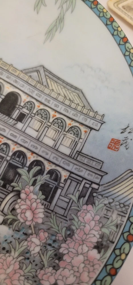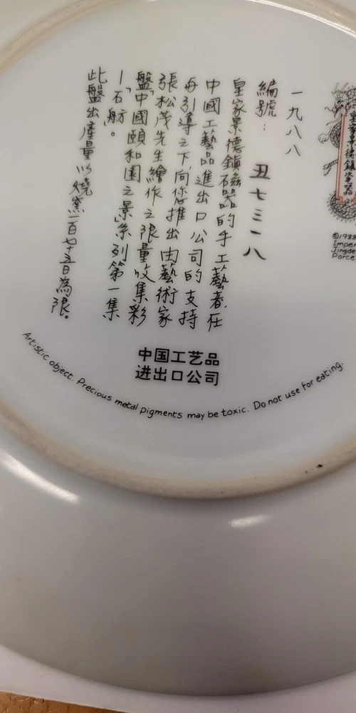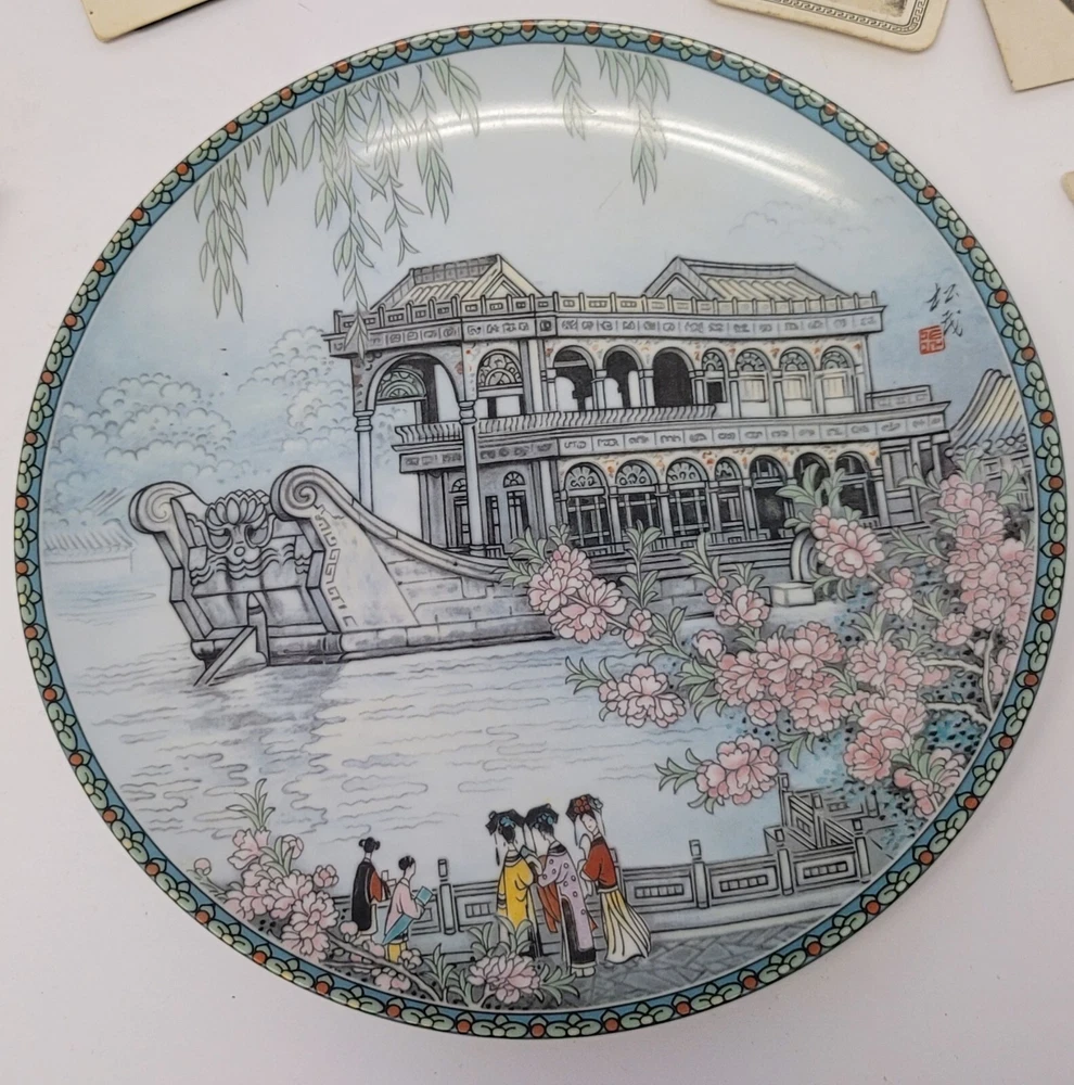The Imperial Chinese Jingdezhen Porcelain collector plate features a floral design inspired by the Marble Boat at the Summer Palace in China. This round plate, measuring 8.5 inches in diameter, is a vintage piece from the late 20th century, specifically produced in the 1980s. Made of porcelain, this decorative plate showcases intricate detailing and vibrant multicolor accents, reflecting the imperial Chinese style of Jingdezhen porcelain craftsmanship. The brand, Imperial Jingdezhen, is known for producing high-quality, collectible porcelain items that capture the essence of Chinese culture and history.