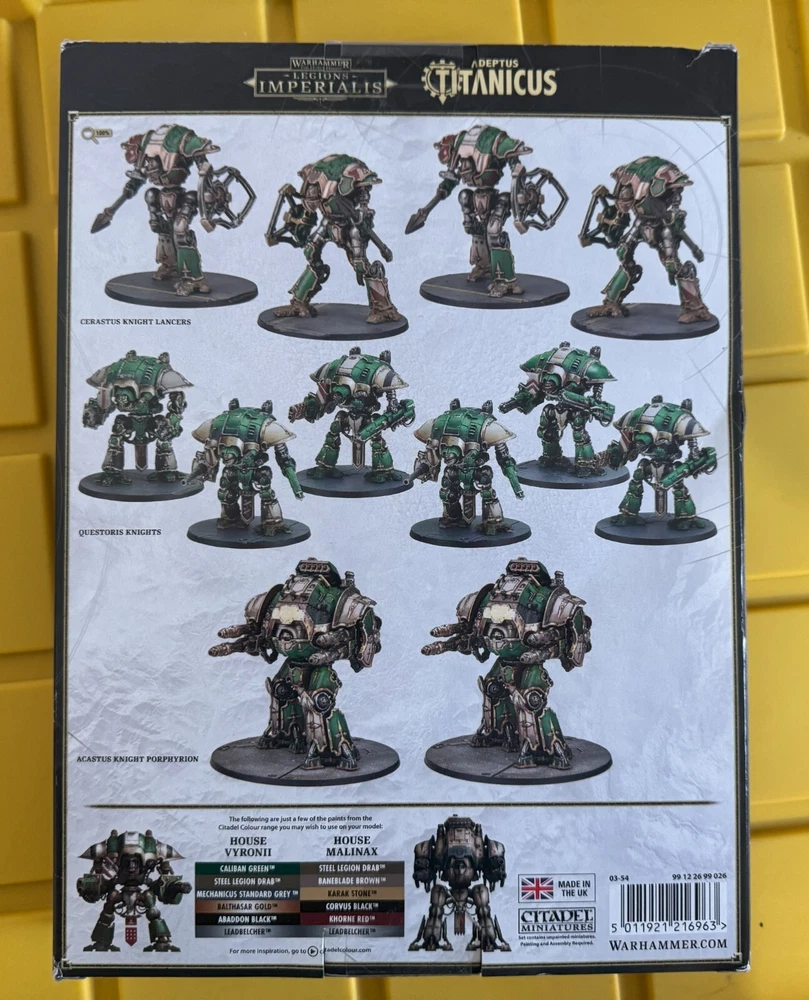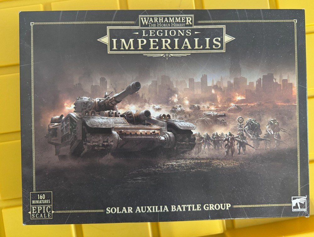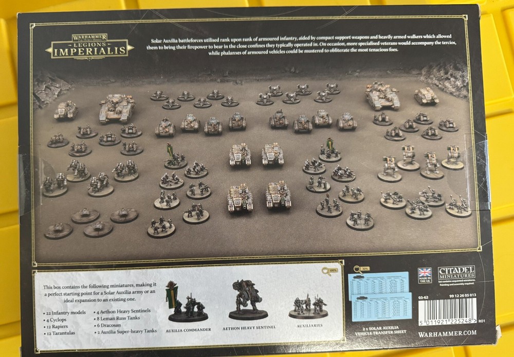 Selling a smallish lot of Legion Imperialis, all on sprue/new/upopened. Some bases have been magnetized. Lot is as follows: Complete Legion Imperialis Starter set, all models on sprue, core rule book, templates, dice. Everything that comes in the box, its been opened, bases magnetized. Solar Auxilia half of another starter set, bases. Solar Auxilia Battle Group Box Avenger Strike Fighters Knight households Knight house battle group the Great Slaughter addon book