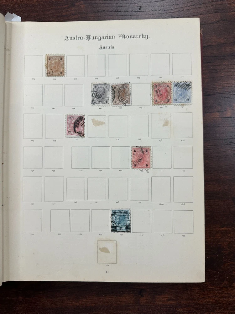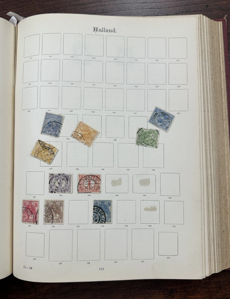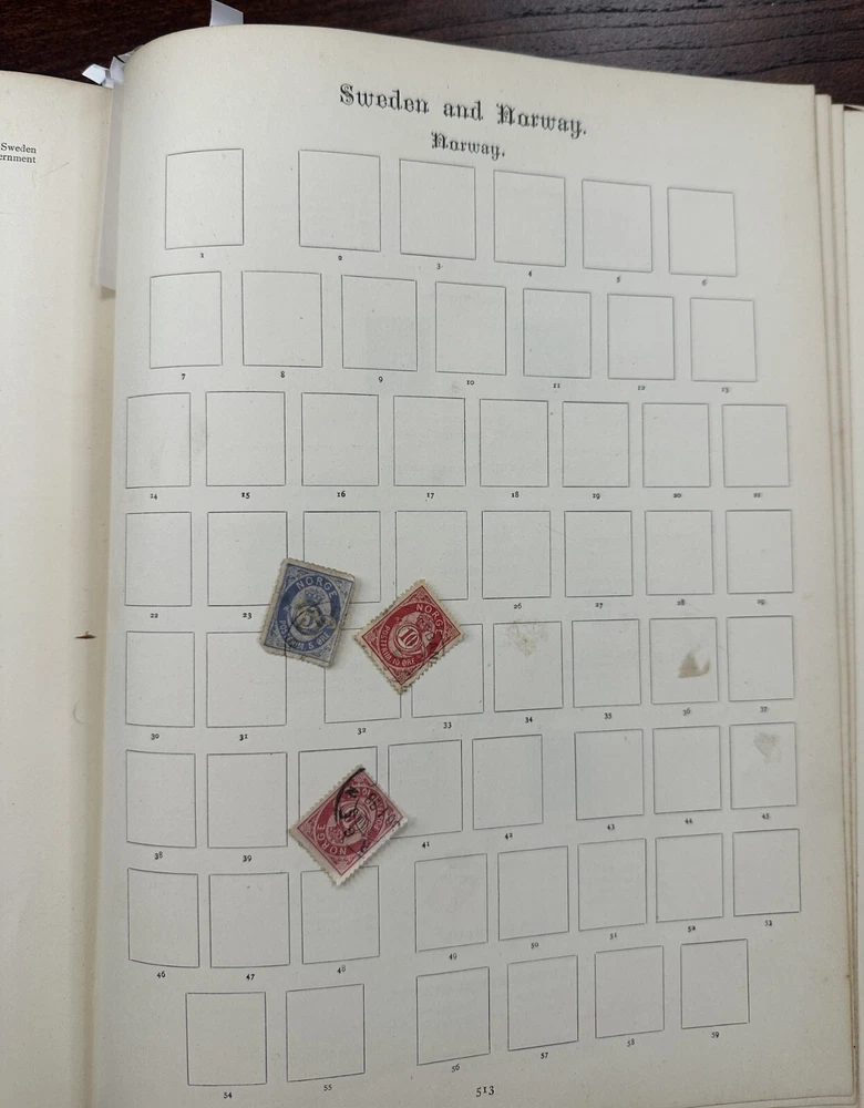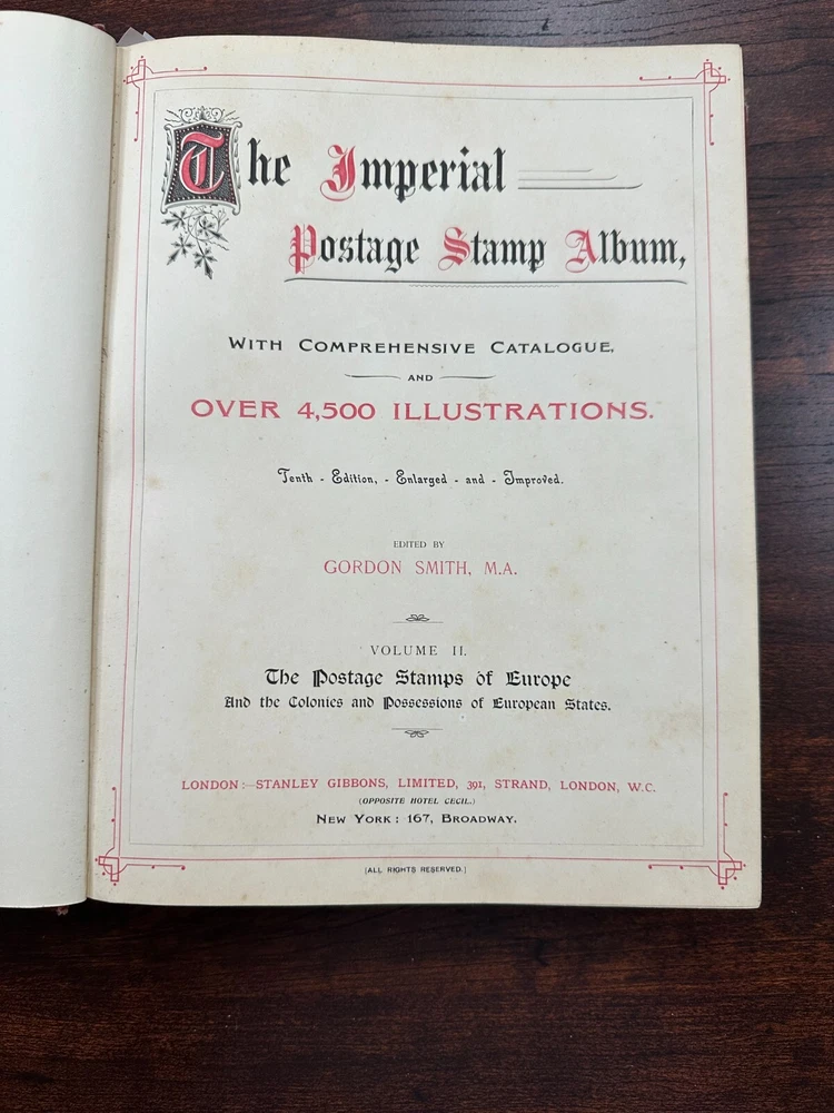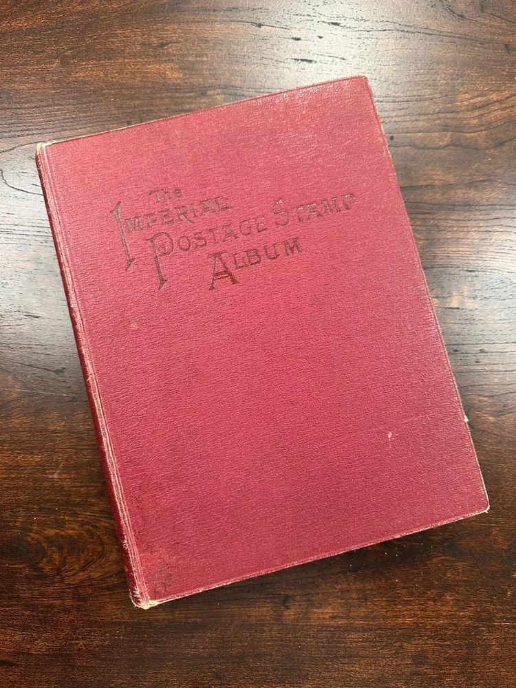 A Stanley Gibbons Imperial Postage Stamp Album (Europe and Possessions) in good condition. There are 100 or so stamps hinged and loose in the album. Most appear to be in good to fine condition. They have not been checked. There are more stamps than what is pictured, but most of the album is empty. Estimated CV of stamps is over $750.00. R