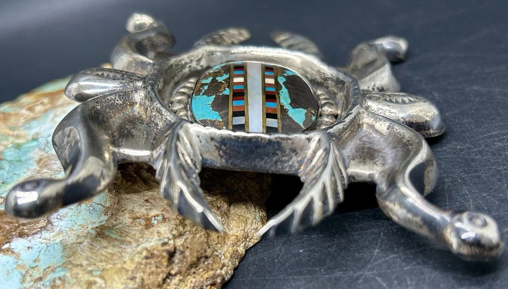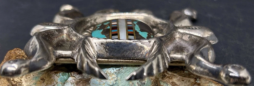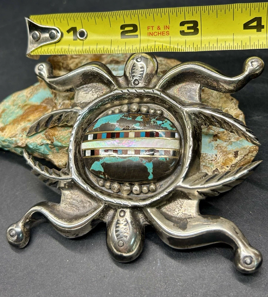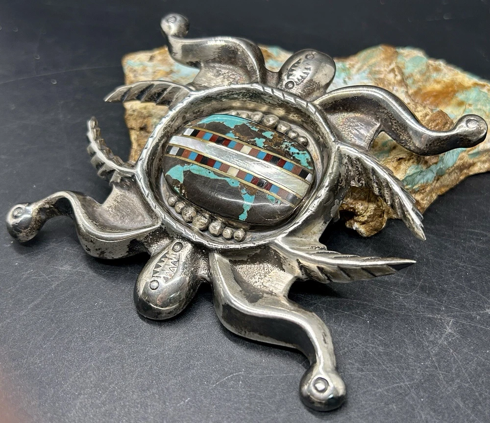 You are looking at an impressive LARGE & Heavy vintage Navajo “Three Hogans Shop” handmade & signed super thick cast sterling silver belt buckle set with gorgeous turquoise and mosaic multi gemstone inlay. Notice the wonderful bold design on this rare statement piece and also the spectacular micro inlay between the turquoise. This buckle was Handmade and signed on the back with the 3 Hogans trading shop hallmark. Their jewelry is well known, highly collectible & rare to find. I added some pictures for you to see including measurements. Again, this is a very big & heavy buckle. It weighs a hefty 194+ grams. Such an impressive rare find. This buckle will make a great addition to any Native American or southwestern jewelry collection. You won’t find another like it. Take advantage of this opportunity to own a rare Native jewelry piece. Thanks for looking and please make sure to check out my other listings.