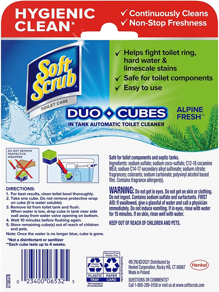 Store New Arrivals Add to Favorite View Feedback Contact In-Tank Toilet Cleaner Duo-Cubes, Alpine Fresh, 4Count Description Item model number 2416977 Item Form Liquid Product Dimensions 1.3 x 5 x 6.69 inches; 0.02 ounces Country of Origin Poland Material Feature Scented Scent Alpine Fresh Specific Uses For Product Toilet Helps fight toilet ring, hard water, and limescale stains. Safe for toilet components. Easy to use. Each duo cube cleans up to 4 weeks. This package contains 4 Duo-Cubes in Soft Scrub Alpine fresh scent for a total of 16 weeks of cleaning. Soft Scrub Duo-Cubes in-tank automatic toilet cleaner helps fight toilet ring, hard water, and limescale stains. Soft Scrub Duo-Cubes are easy to use and safe for toilet components. Just drop a Soft Scrub Duo-Cube in the tank and enjoy cleaning and freshening benefits for up to four weeks! ABOUT US We offer the best prices around on high quality products. Our E-store includes media such as books, movies, music and games while offering electronics, toys, sporting apparel, clothing, tools, general home, garden items and more. SHIPPING We are always working hard to ensure your package arrives as soon as possible. Please understand that some factors like weather, high postal traffic, and the performance of shipping companies are outside of our control. We offer free shipping to the lower 48 states and ship within 2 business days of payment, usually sooner. We do not accept P.O. Boxes. Please provide a physical address. For shipping outside of the continental USA, we only use eBay's Global Shipping Program.The item is shipped to KY and then sent to the rest of the world. International customers are responsible for all duties and taxes. Continue to check out in order to calculate costs for shipping the item to your country. Messages regarding eBay's Global Shipping Program MUST be directed at eBay EXCLUSIVELY. RETURNS We offer a 30-Day Return Policy on items which you are not completely satisfied with. You have the option for a full-refund or an exchange of the item. No returns are available on items shipped outside of the USA. PAYMENT We accept PayPal. CONTACT US This page content is yet to come Please ad us to your favorite seller and visit again later Thank You CUSTOMER SATISFACTION We try our very best to make sure every customer is completely satisfied. If there's a problem, message us! We're happy to help. WE ACCEPT Copyright © 2021 AutoDS. | All Rights Reserved