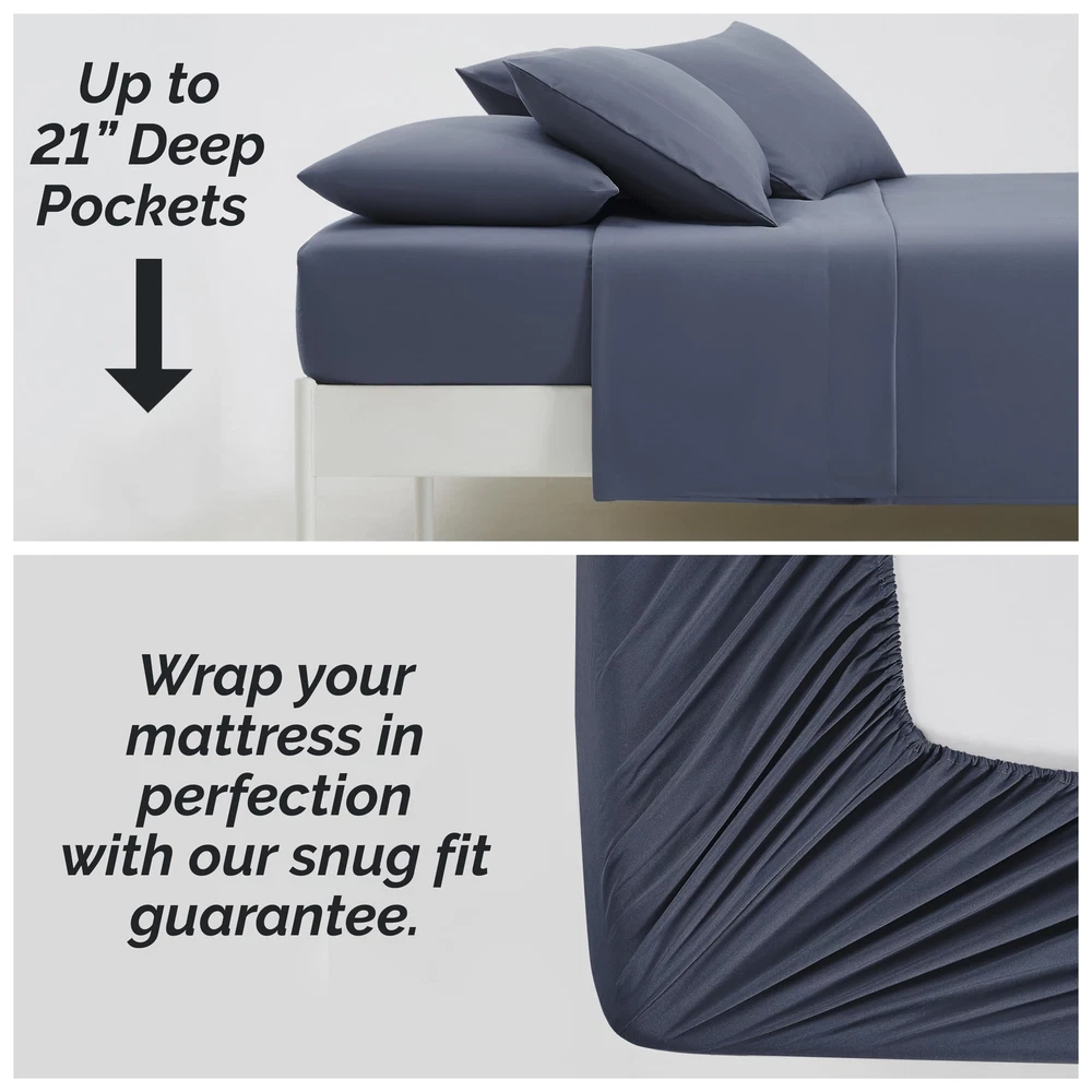 Are you tired of your fitted sheets not fitting properly on your mattresses and coming off? Our fitted sheets are 21 inches deep in size. This means they can easily fit your deep mattresses without coming off. The all-around elastic on our fitted sheets will cover your deep luxurious mattress and any toppers easily, no matter how much you toss and turn. These fitted sheets are premium quality and a snap to put on. We guarantee it. These sheets are our flagship product made with 110 GSM double-brushed microfiber fabric. Our unique method of brushing both sides makes these extremely soft and comfortable. With 21-inch deep pockets, these sheets are truly extra-deep Pocket sheet sets. Made under our trademarked Brand , Inc., a lot of attention has been paid to every aspect of the product. Starting from fabric feel, to stitching and even custom packaging. COMES WITH MANUFACTURER's ONE YEAR WARRANTY FROM DATE OF PURCHASE. Cleaning Instructions: Machine Wash Cold before use and with like colors. Tumble Dry low setting. Do not use Bleach. Remove Promptly. Luxury Lifestyle at Incredible Value: Luxurious, comfy Queen size sheet set in ultra-soft brushed microfiber for the most cozy and restful sleep you've ever had; No-shrink, no-fade, no-pill material stays beautiful for the life of the sheets. Queen Sheet Set Deep Pocket: The 21" deep queen fitted sheet has strong elastic around the entire hem to stay tucked on thick mattresses and toppers, including pillow-top, Euro-top, foam toppers. No more slipping or untucking. Softer with Every Wash: Heavenly softness that gets better with each wash. Comfy Queen size sheets that wrap you in silky smoothness for a luxurious sleep. Lightweight and breathable, perfect for year-round use. Fade-Resistant & Durable: These bed sheets, queen size bed, are Machine washable and tumble dryable, our sheets stay vibrant and fresh as new, wash after wash. Choose from many colors to suit your bedding and home décor aesthetic. 6-Piece Deep Pocket Sheets Queen Size Bed Set Includes: (1) Fitted Sheet 60" wide x 80" long x 21" Deep; (1) Oversize Flat Sheet 90" wide x 102" long; (4) Pillowcases 20" wide x 30" long