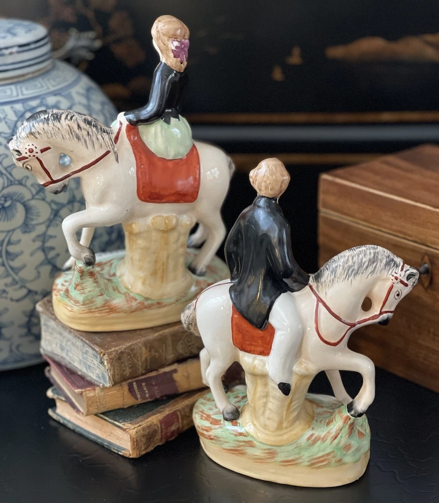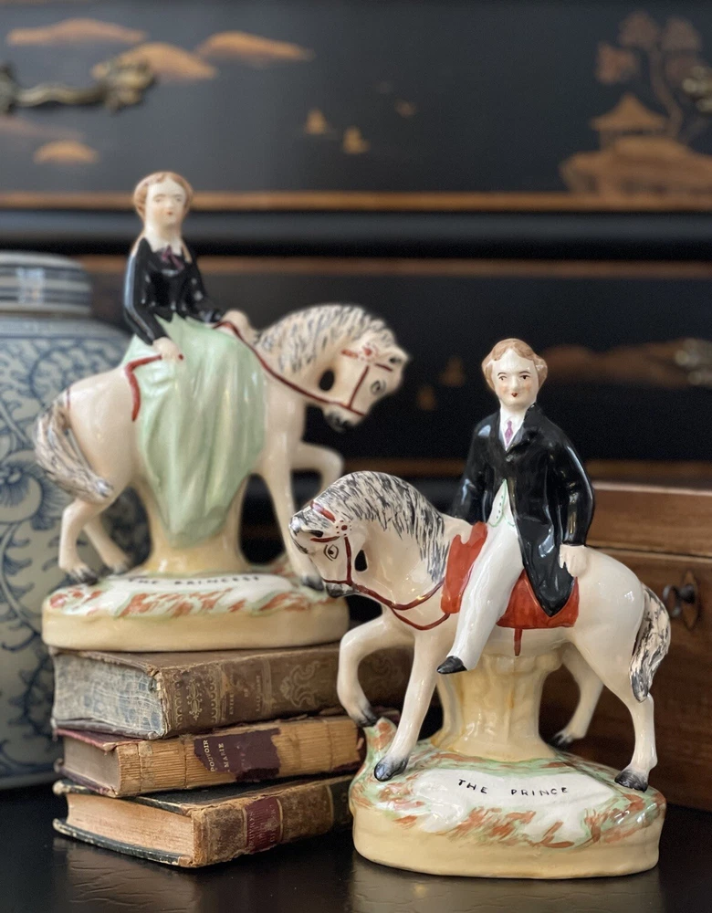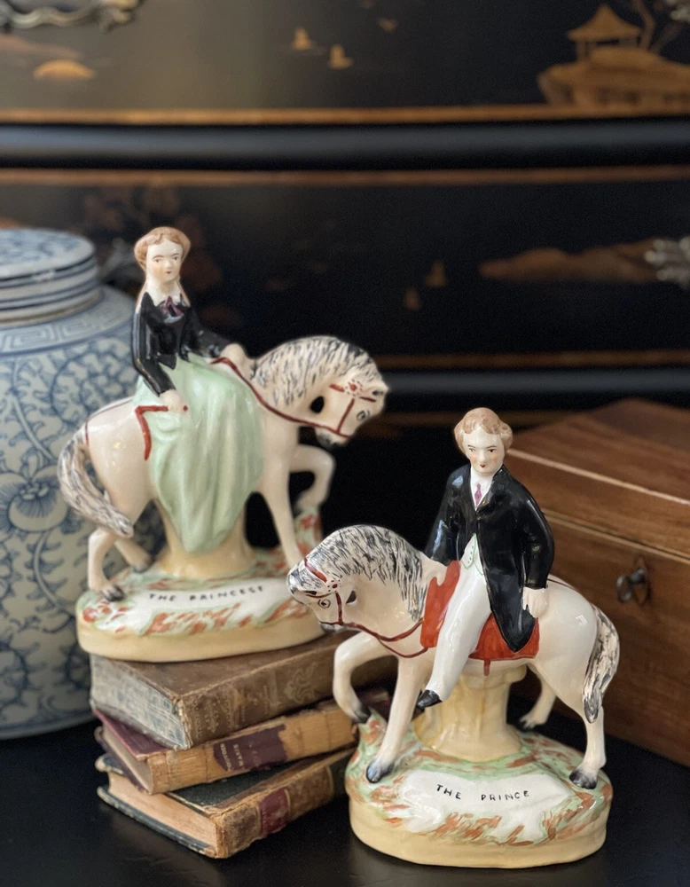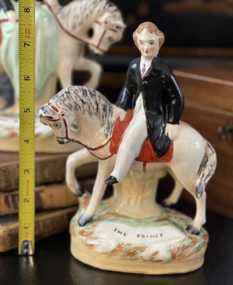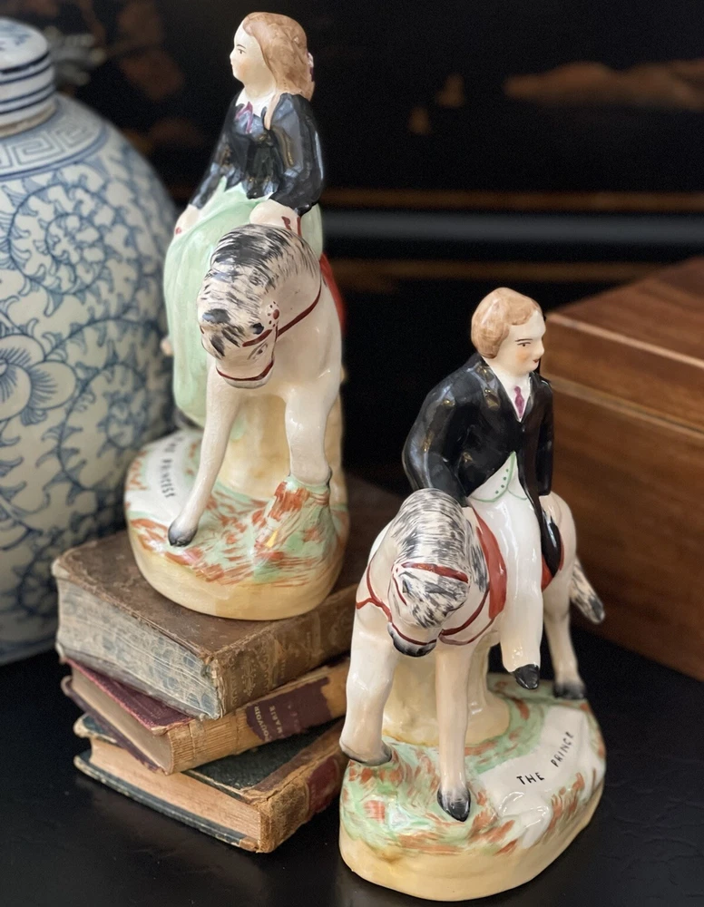 Stunning Rare 19C English Staffordshire Equestrian Mantle Flatback Pair Depicting Elegant Noble Prince and Princess on Horseback • Rare Gallery Quality Equestrian Figures • Scarce Version with Fair Hair • Height 7.5” I am delighted to offer this incredible pair of timeless equestrian themed rare English Staffordshire mantle flatbacks featuring elegant right and left facing horses carrying prince and princess (Victoria and Albert) dressed in beautiful riding clothes in classic form from Staffordshire, England. This particular model has substantial fullness to modelling with extra weight and quality to casting in a special way, yet fine. Kindly view photo of figures from the side to see the superb moulding. A stunning model from my personal collection. Some models are more willowy by nature, also lovely but these figures are truly a masterpiece in their own right. This marvelous statement pair of noble equestrian figures will make elegant showpieces when placed on their own or as a stunning addition to a collection or arrangement. Solid, clean lines, fabulous. Incredible surviving examples to enjoy and treasure. Minimal expected characteristic post-production wear. Excellent. Display ready. Height 7.5”