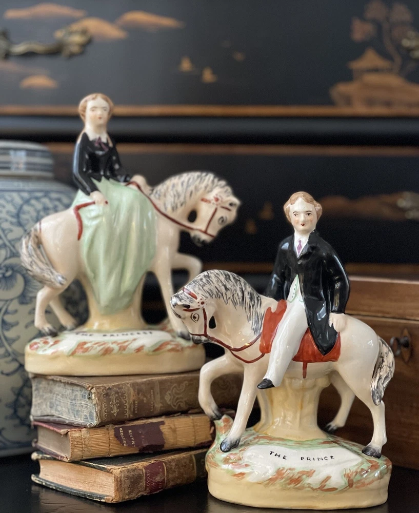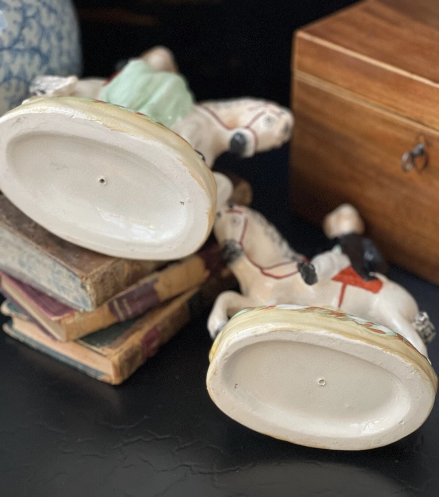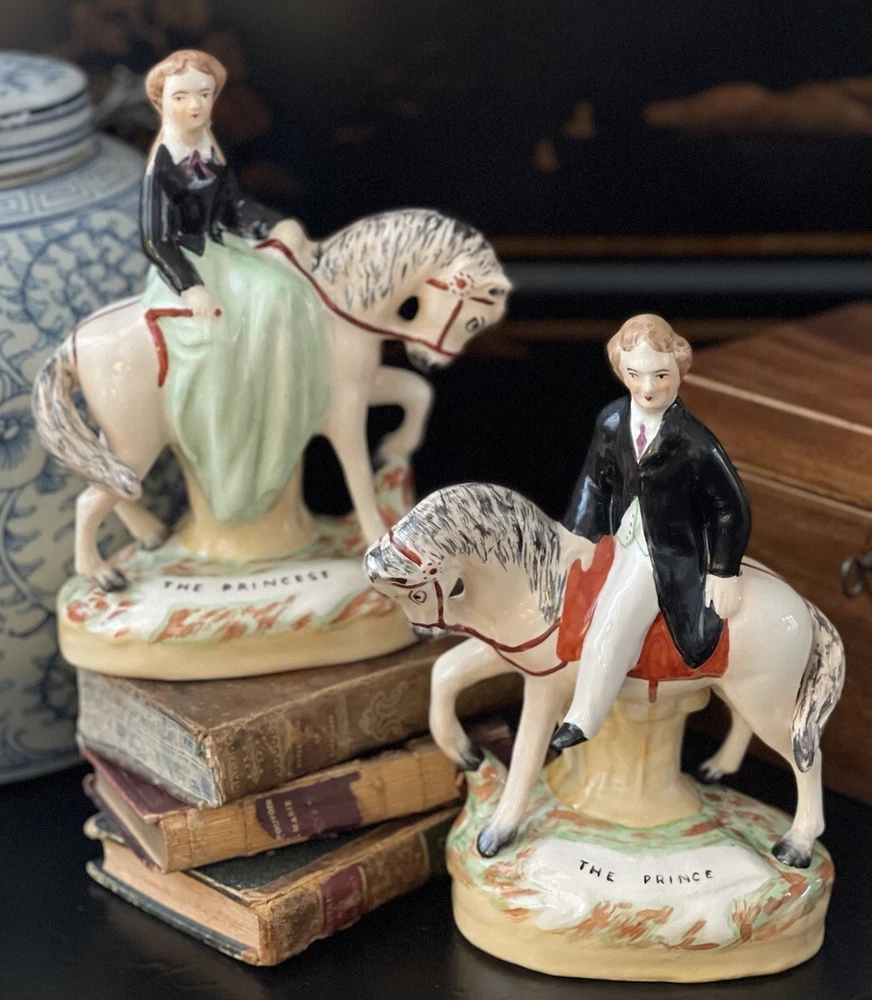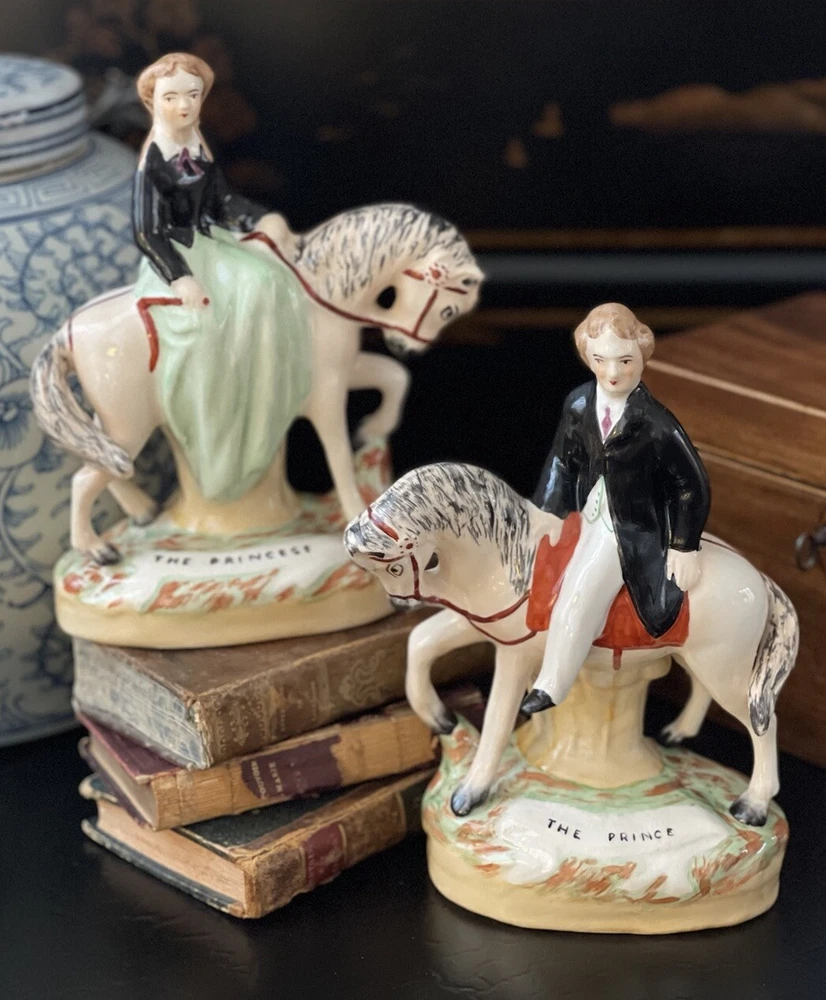 Stunning Rare 19C English Staffordshire Equestrian Mantle Flatback Pair Depicting Elegant Noble Prince and Princess on Horseback • Rare Gallery Quality Equestrian Figures • Scarce Version with Fair Hair • Height 7.5” I am delighted to offer this incredible pair of timeless equestrian themed rare English Staffordshire mantle flatbacks featuring elegant right and left facing horses carrying prince and princess (Victoria and Albert) dressed in beautiful riding clothes in classic form from Staffordshire, England. This particular model has substantial fullness to modelling with extra weight and quality to casting in a special way, yet fine. Kindly view photo of figures from the side to see the superb moulding. A stunning model from my personal collection. Some models are more willowy by nature, also lovely but these figures are truly a masterpiece in their own right. This marvelous statement pair of noble equestrian figures will make elegant showpieces when placed on their own or as a stunning addition to a collection or arrangement. Solid, clean lines, fabulous. Incredible surviving examples to enjoy and treasure. Minimal expected characteristic post-production wear. Excellent. Display ready. Height 7.5”
