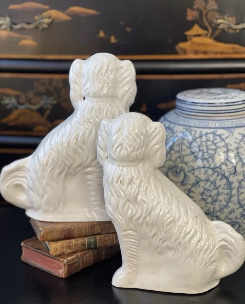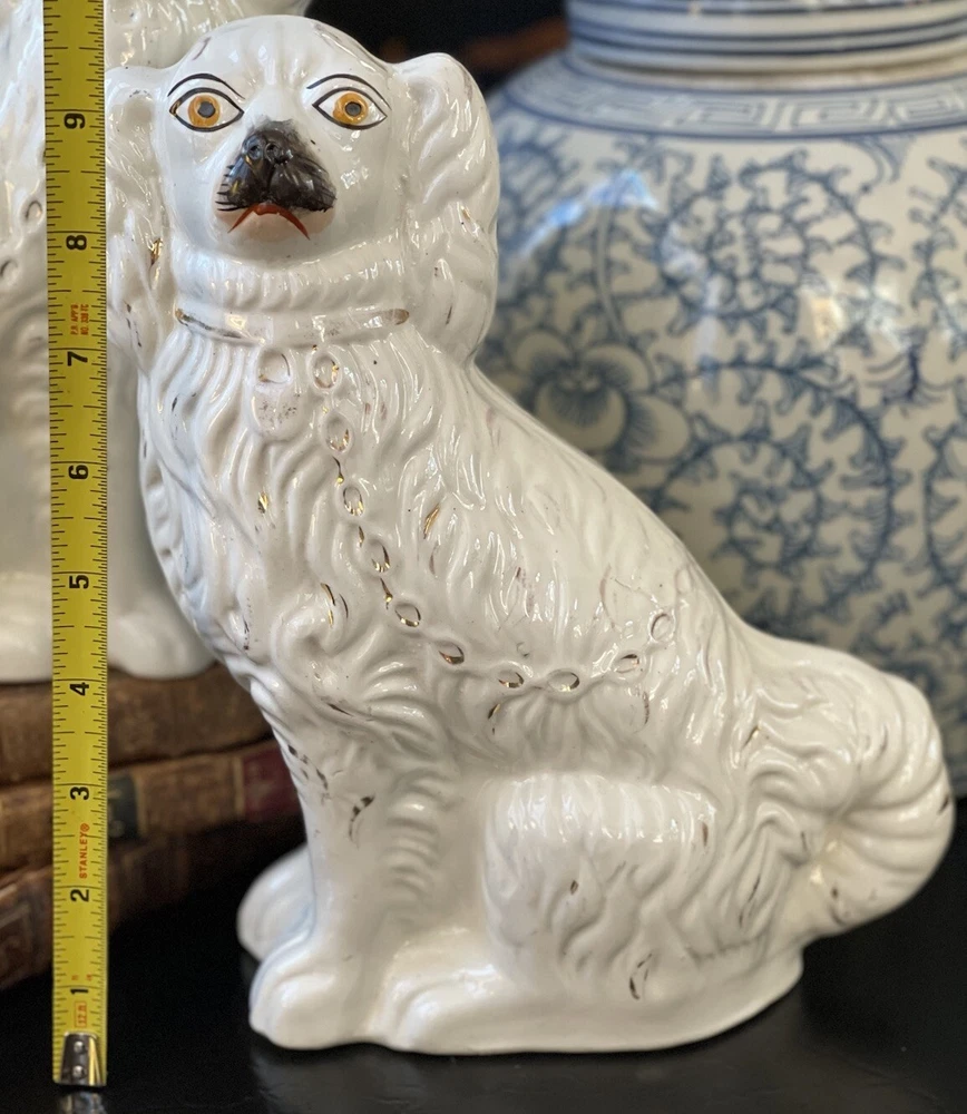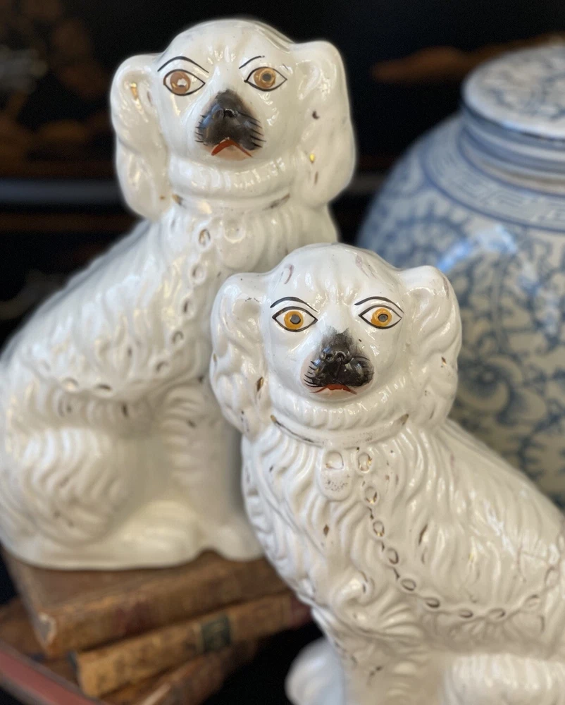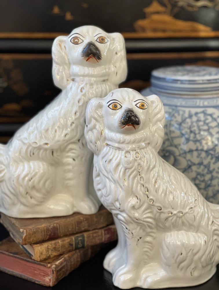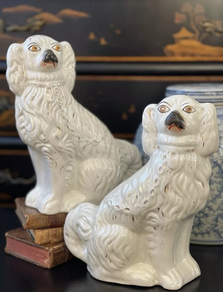 Glorious Rare 19C Antique Period Cavalier King Charles Spaniel Staffordshire Royal Game Fox Hunt Hound Mantle Dog Pair • White with Gold Markings • Classic English Staffordshire Spaniels • 9.75” Height This is a stunning pair of antique white and gold spaniel mantle dogs featuring traditional formal expressions, yet each one with its own warm personality. In versatile scale and classic form, this pair of stately right and left facing canine figures will bring a touch of English countryside to any setting in which they are placed. This beautiful find with sought after softly and perfectly aged original patina will make a stunning showpiece on its own or as part of a collection or arrangement. Expected age related wear only. Softly time aged patina as is characteristic to early examples. Superb surviving pair with all clues to their past and origin, fully present. Gallery quality original examples to own and treasure. Display ready. Height 9.75”