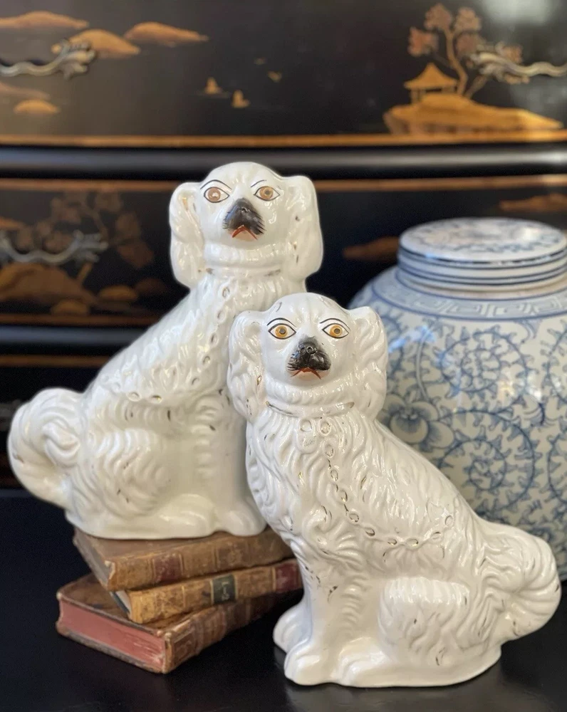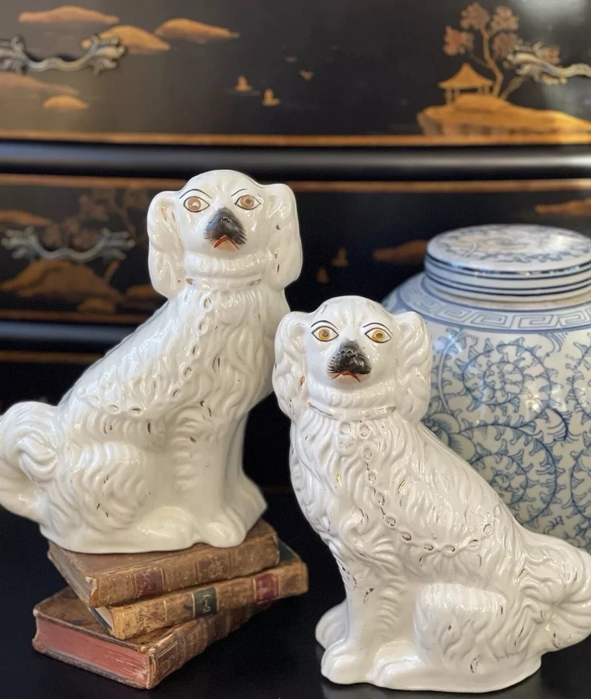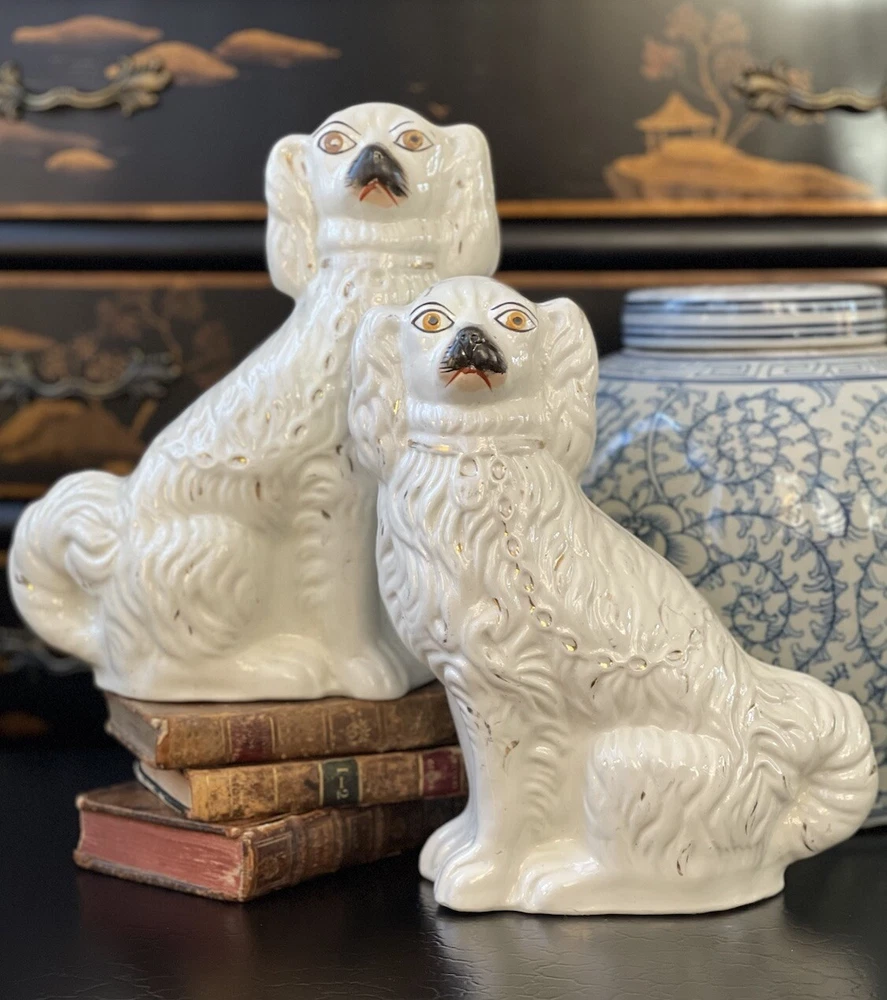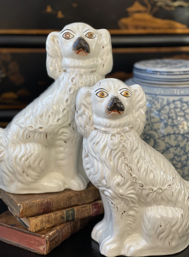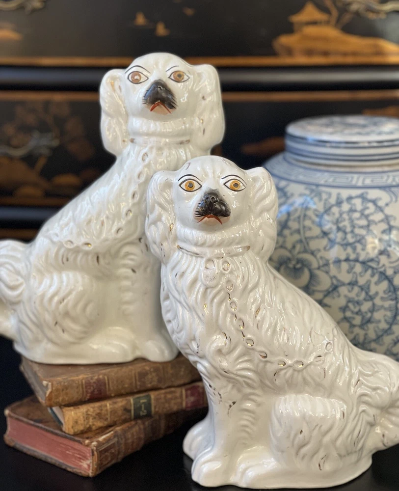 Glorious Rare 19C Antique Period Cavalier King Charles Spaniel Staffordshire Royal Game Fox Hunt Hound Mantle Dog Pair • White with Gold Markings • Classic English Staffordshire Spaniels • 9.75” Height This is a stunning pair of antique white and gold spaniel mantle dogs featuring traditional formal expressions, yet each one with its own warm personality. In versatile scale and classic form, this pair of stately right and left facing canine figures will bring a touch of English countryside to any setting in which they are placed. This beautiful find with sought after softly and perfectly aged original patina will make a stunning showpiece on its own or as part of a collection or arrangement. Expected age related wear only. Softly time aged patina as is characteristic to early examples. Superb surviving pair with all clues to their past and origin, fully present. Gallery quality original examples to own and treasure. Display ready. Height 9.75”