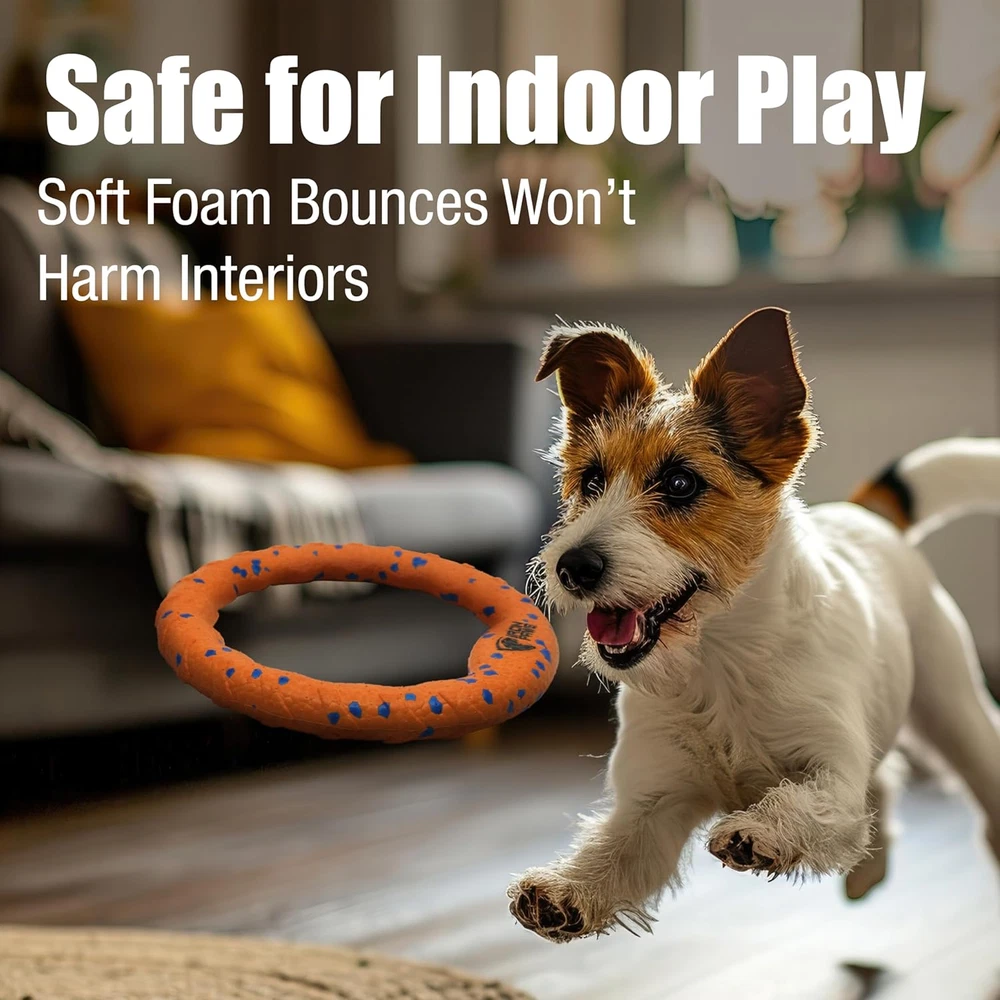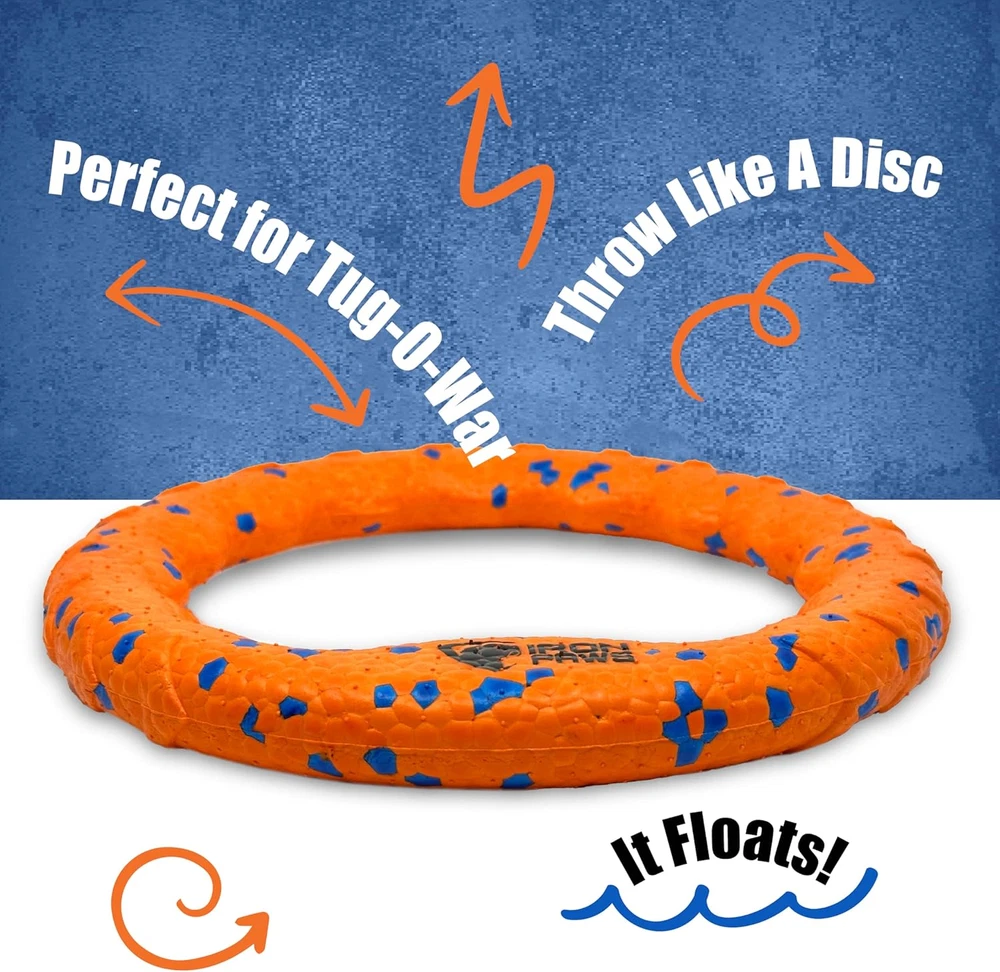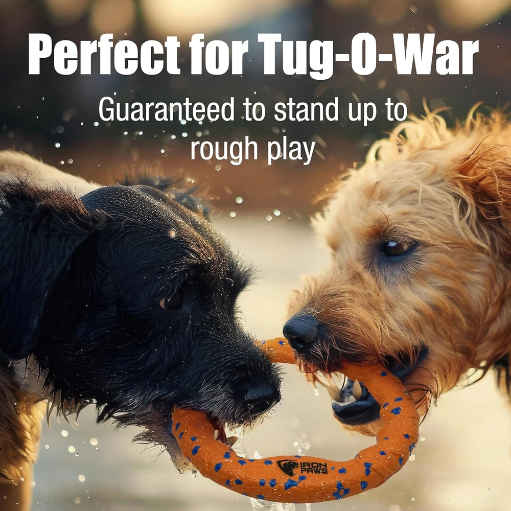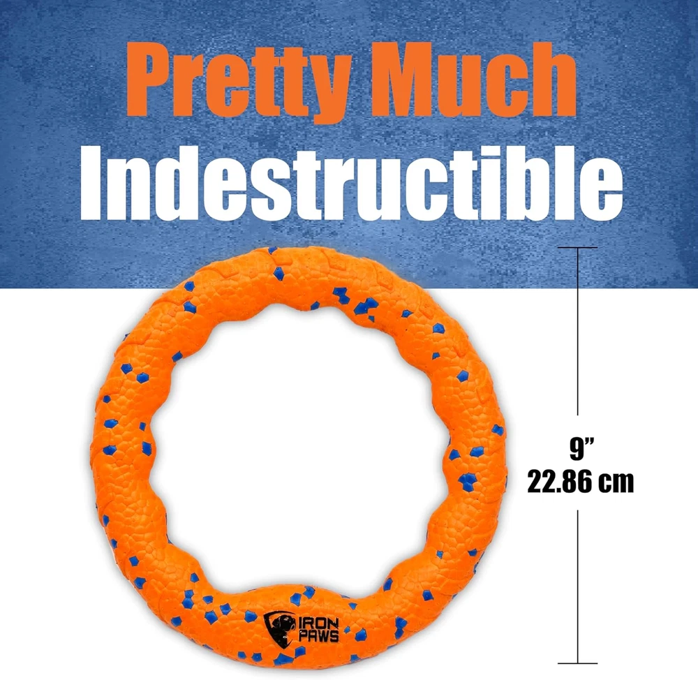 EASY TO THROW - Perfect for playing fetch, indestructible dog toy is easy to throw and easy to catch thanks to a slim aerodynamic shape and super soft materials. BEST DOG TOYS FOR AGGRESSIVE CHEWERS - Hard to believe but this super soft foam stands up to roughest games of tug of war and the hardest playing dogs. SAFE FOR INDOOR PLAY - Super soft dog disc means you can play fetch on rainy days when outside isn't an option. GREAT FOR TUG-O-WAR - For playing with your dog or as a toy between two dogs, Iron Paws' super tough ring stands up to the pull of the largest dogs. PERFECT FOR THE POOL - Great for fetch and general play at the pool, lake, beach and more. Product Description