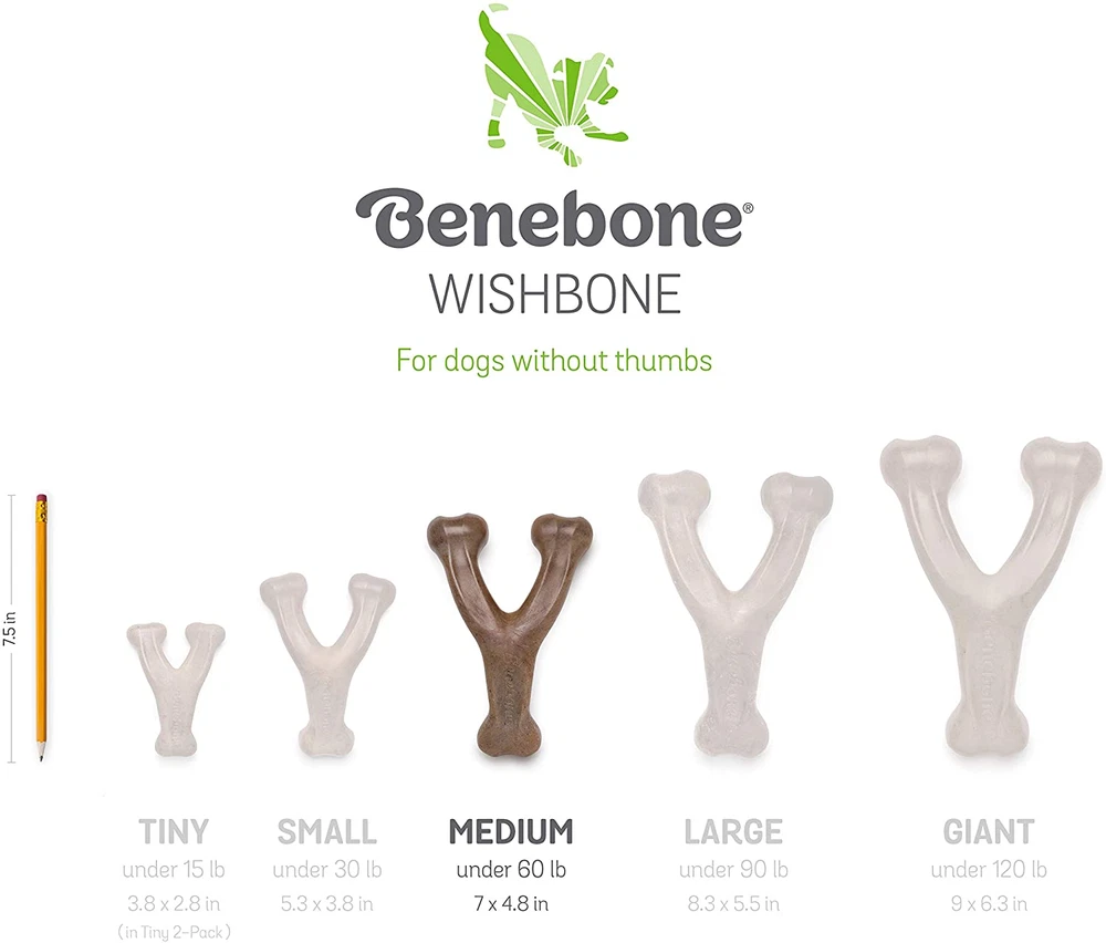 Fast Shipping On All Items 30 Days Money Guarantee Customer Support Excellent Service 100% Satisfaction Satisfaction Guaranteed Indestructible Wishbone Dog Chew Toy for Aggressive Chewers, Long Lasting Tough Boredom Breaker for Dogs, Real Peanut Flavour, for Medium Dogs, Made in the USA. Specification Item model number 818600 Age Range Description All Life Stages Warranty Description HAPPINESS, GUARANTEED – Have an issue? Want to chat? Reach out to us directly and you’ll get a real person whose sole job is to make you and your pup happy. Number of Items 1 Country of Origin United States Style Durable Target Audience Keyword Dogs Breed Recommendation Any breed Product Dimensions 7 x 4.8 x 1.5 inches; 6.08 ounces Material Nylon Flavor Name REAL Peanut Directions Chomp and Enjoy! Is Discontinued By Manufacturer No Item Package Dimensions L x W x H 12.87 x 7.64 x 2.05 inches Included Components Dog chew toy Language English Item Weight 6.08 ounces Specific Uses for Product Active, Teeth Item Dimensions LxWxH 7 x 4.8 x 1.5 inches Color Brown Manufacturer recommended age 1 month and up Size Medium 4.8 inches x 7.0 inches x 1.5 inches. Weight: 6.08 oz Item Description DURABLE, LONG-LASTING – Super chewer? Bring it on. Benebones are tougher than real bones and last for weeks. REAL PEANUTS! – Dogs love peanut butter, so we use 100% REAL PEANUTS. Why go with the imitation stuff? EASY TO PICK UP AND CHEW – The Wishbone is curved for a paw-friendly grip so your pup can quickly grab it and get a good chew going. Think about it: dogs don’t have thumbs. USA MADE – We make and source everything in the USA. HAPPINESS, GUARANTEED – Have an issue? Want to chat? Reach out to us directly and you’ll get a real person whose sole job is to make you and your pup happy. The Benebone Wishbone Dogs love to chew, especially on stuff that tastes like real peanuts. The Wishbone is easy to handle, tastes awesome, and stands up to heavy chewing. About Benebone At Benebone, we started with the premise that dogs experience scent and flavor in a way we can’t even grasp. So we ditched the neon colors and loud squeaks. Inspired by a dog’s powerful sense of smell, we developed a long-lasting durable chew that’s jam-packed with real peanuts. Once your dog takes a bite of our USA-made chews, he’ll be hooked. We’re Obsessed with Safety Too Wonder if Benebone is right for your dog? Here’s what you need to know. Since it’s hard, it’s important that your pup has strong teeth. If you’re unsure, check with your vet. Nobody likes an unexpected trip to the dentist. Keep an eye out for wear and tear. Within a month or so, we find that most dogs chew Benebone into submission. See the wear page on our website for helpful photos to determine when to replace yours. Keep away from households with peanut or other allergies. What’s Inside? Nothing but Nylon and Real Peanuts for Tantalizing Flavor About us We offer the best prices around on high quality products. Our E-store includes media such as books, movies, music and games while offering electronics, toys, sporting apparel, clothing, tools, general home, garden items and more. Shipping We are always working hard to ensure your package arrives as soon as possible. Please understand that some factors like weather, high postal traffic, and the performance of shipping companies are outside of our control. We offer free shipping to the lower 48 states and ship within 2-3 business days of payment, usually sooner. We do not accept P.O. Boxes. Please provide a physical address. For shipping outside of the continental USA, we only use eBay's Global Shipping Program.The item is shipped to KY and then sent to the rest of the world. International customers are responsible for all duties and taxes. Continue to check out to calculate costs for shipping the item to your country. Messages regarding eBay's Global Shipping Program MUST be directed at eBay EXCLUSIVELY. Returns We offer a 30-Day Return Policy on items in which you are not completely satisfied with. You have the option of a full-refund or an exchange of the item. No returns are available on items shipped outside of the USA Satisfaction We try over very best to make sure every customer is completely satisfied. If there's a problem, message us! We're happy to help. Payment Options Shop With Confidence