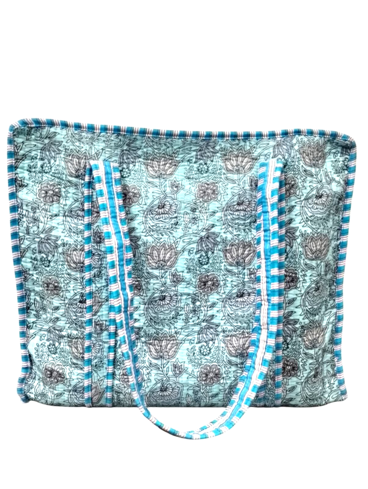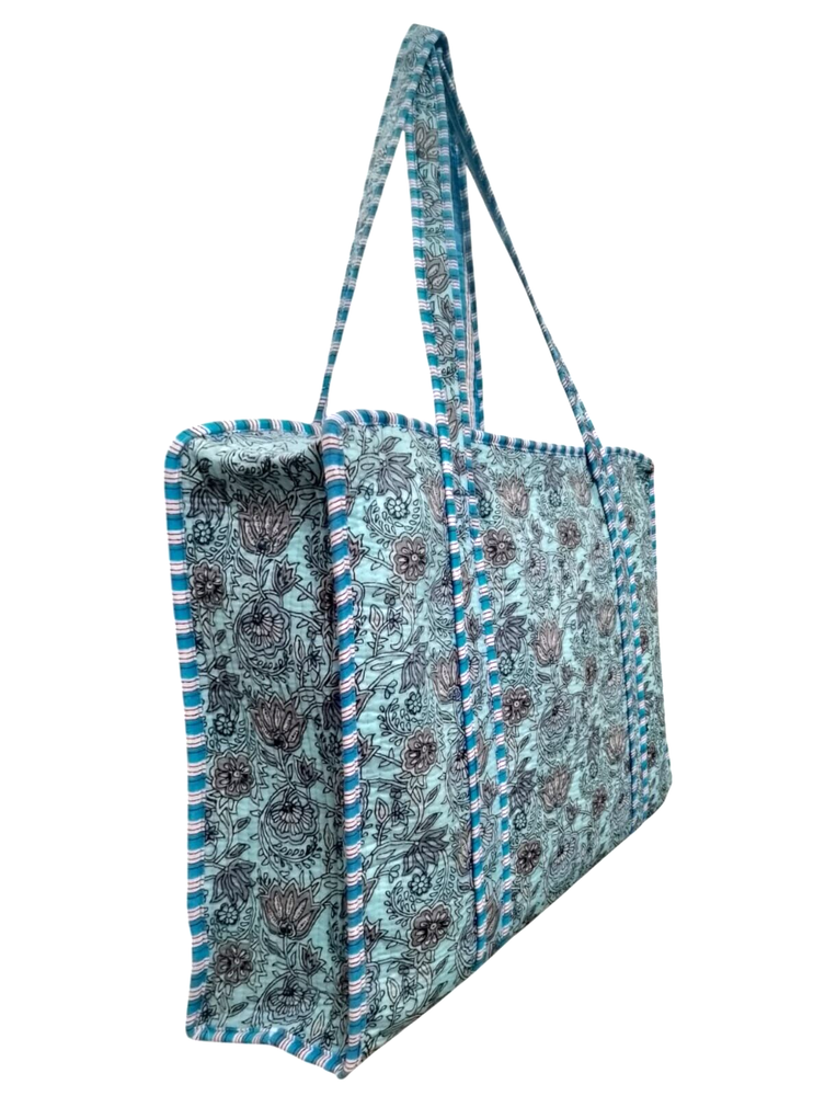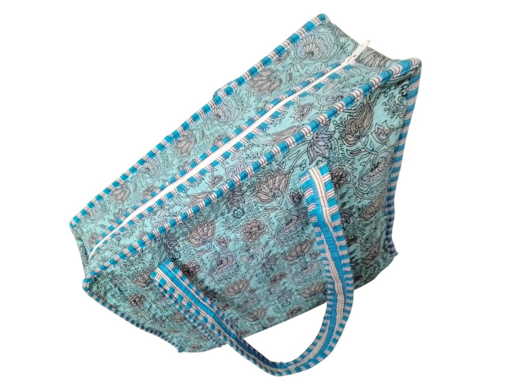 welcome To Our Shop Product Description Bag Size :- Large Print :- Hand block Print Height:- 46 cm/ 18 inch Width:- 46 cm/ 18 inch Handle:- 55 cm/ 22 inch Color:- Baltic blue (As per in picture) Our Hand block Printed Cotton Bag is the perfect bag no matter the occasion. It fits both a Leptop for the office and a towel and swimsuit for the beach. It is super roomy, so you can easily carry all your important stuff with you on the go. The bag is made in the sustainable materials, on the outside its covered in cotton fabric and the Pocket inside is made of recycled cotton. The bag has a thick, quilted padding to give the bag shape, and to add protection to the content. Bag has a pocket on the inside. All of our Cotton styles are sustainable as they are made of block print fabric with unique patterns made with. This makes each pattern unique and small imperfections can occur. These simply reflect the craftsmanship that it takes to make each textile. ✱✱ Note: The color and brightness of actual product may vary due to digital photography and photo editing. We crossed check each and every product before listing. Thanks....