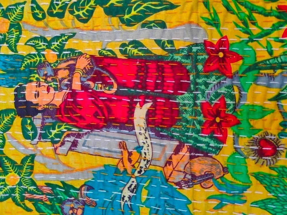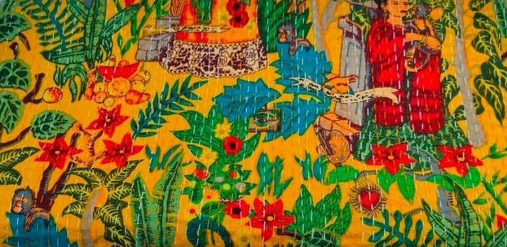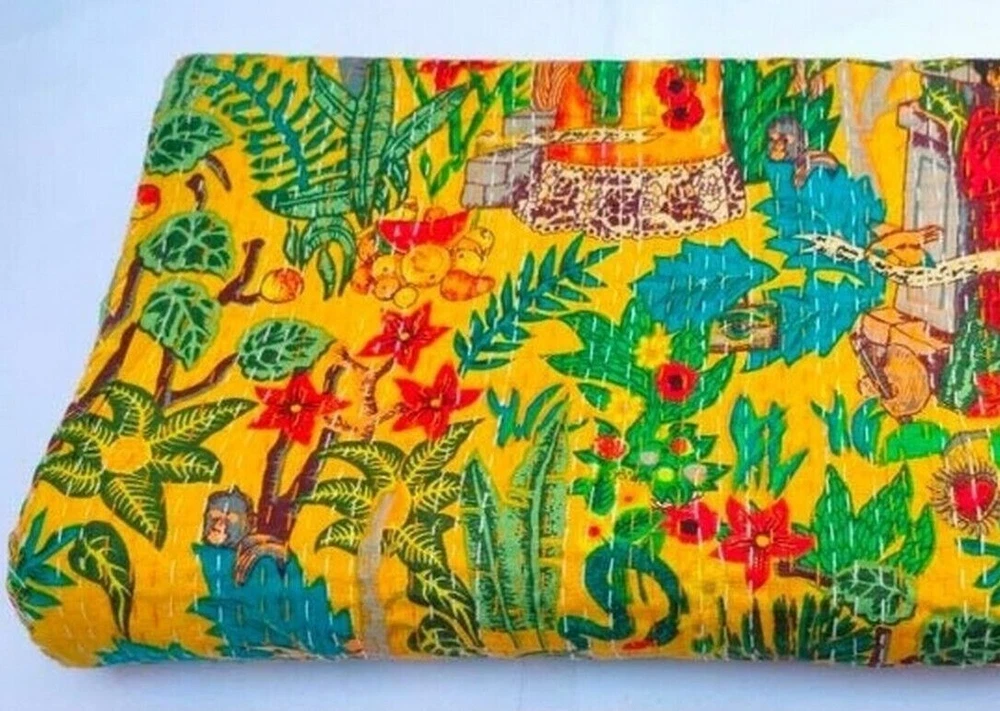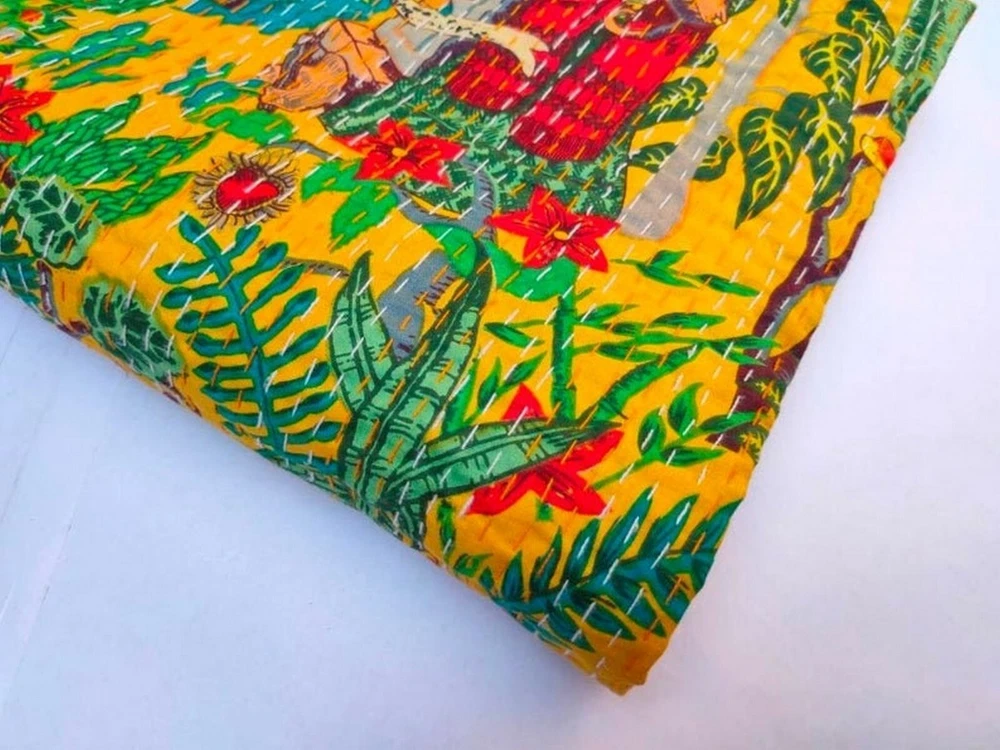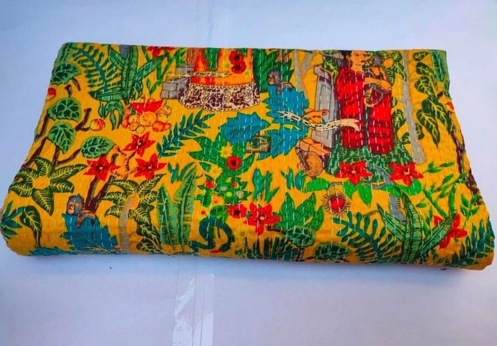 Transform your bedroom into a luxurious haven with this beautiful handmade Kantha bedspread. The vibrant yellow color and Frida pattern add a touch of Bohemian elegance to your space. The rectangular shape fits a queen-sized bed and is made of 100% cotton, ensuring softness and comfort all year round. This coverlet is perfect for teens, adults, unisex baby & toddler, and kids. The quilted design adds depth and texture, while the machine washable material makes it easy to care for. This Indian-style bedspread is a perfect addition to any bedroom, and the personalized option makes it a unique and special purchase. This vintage Kantha quilt is a perfect addition to your home decor. It is machine washable and easy to maintain. The quilt is suitable for teens, adults, unisex baby & toddler, and kids. This bedspread is a great way to add a cozy and comfortable touch to your bedroom. Blanket Indian Twin Handmade Bedspread Kantha Work Bohemian Bed Decor Throw Blanket 60X90 inch => Frida Kantha Quilt => Material: 100% Cotton => Size:- Twin 60 x 90" Approx. => Size:- Queen 90 x 108" Approx. Note:-As this is Applique Hand Floral Kantha, There will be variation in patches Every Piece Comes Different Base Color will Be same. You Will Received Little Bit Differ As Shown In Picture. Note - loose threads to be expected. Note - The entire Two Layer of Silk and Cotton quilt is hand embroidered with end number of straight stitches to create a unique product, one of a kind, that it’s a perfect GIFT too. , All these make them a Patchwork Quilt. Note - There is no batting inside the two layers. Cotton fabric King Size Kantha Stitch Quilt , Blanket / Bedspread. , * Frida pattern on the front side. * Backing with solid pattern. * Colored threads are used to develop the Kantha pattern. NOTE: Once You Bought Item From Our Store You Will 100%Satisfied. And You Will Get As We Describe !