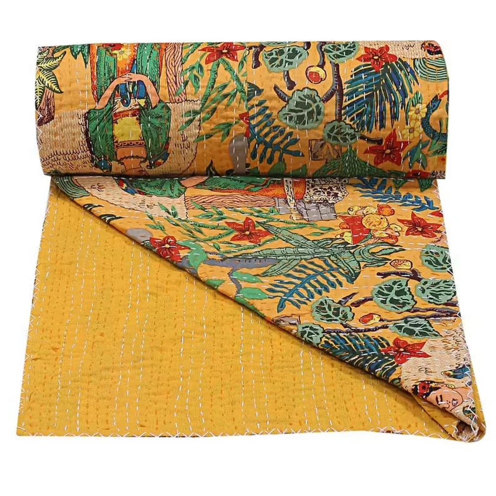 Add a touch of luxury to your bedroom with this beautiful Indian handmade vintage Kantha quilt. The quilt is made of 100% cotton and features a stunning Frida pattern in yellow. It is perfect for all seasons and comes in a queen size rectangular shape. The quilt is machine washable and quilted for extra comfort. It is also personalized and makes a great gift for teens, adults, unisex baby & toddler, and kids. The coverlet is designed with an eye-catching style and theme of luxury. This Indian-made coverlet will be a great addition to your bedding collection. This vintage Kantha quilt is a perfect addition to your home decor. It is machine washable and easy to maintain. The quilt is suitable for teens, adults, unisex baby & toddler, and kids. This bedspread is a great way to add a cozy and comfortable touch to your bedroom. Blanket Indian Twin Handmade Bedspread Kantha Work Bohemian Bed Decor Throw Blanket 60X90 inch => Frida Kantha Quilt => Material: 100% Cotton => Size:- Twin 60 x 90" Approx. => Size:- Queen 90 x 108" Approx. Note:-As this is Applique Hand Floral Kantha, There will be variation in patches Every Piece Comes Different Base Color will Be same. You Will Received Little Bit Differ As Shown In Picture. Note - loose threads to be expected. Note - The entire Two Layer of Silk and Cotton quilt is hand embroidered with end number of straight stitches to create a unique product, one of a kind, that it’s a perfect GIFT too. , All these make them a Patchwork Quilt. Note - There is no batting inside the two layers. Cotton fabric King Size Kantha Stitch Quilt , Blanket / Bedspread. , * Frida pattern on the front side. * Backing with solid pattern. * Colored threads are used to develop the Kantha pattern. NOTE: Once You Bought Item From Our Store You Will 100%Satisfied. And You Will Get As We Describe !